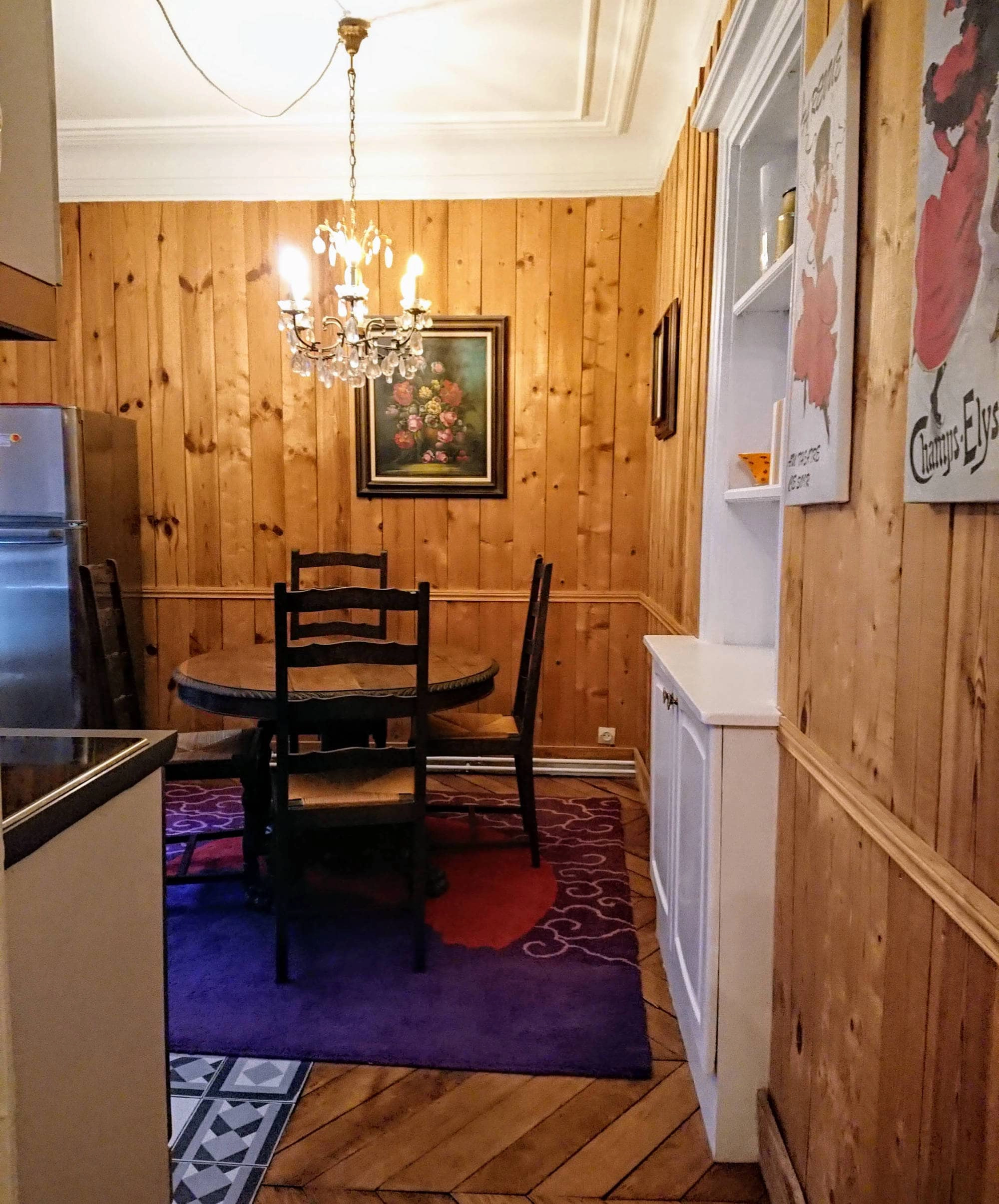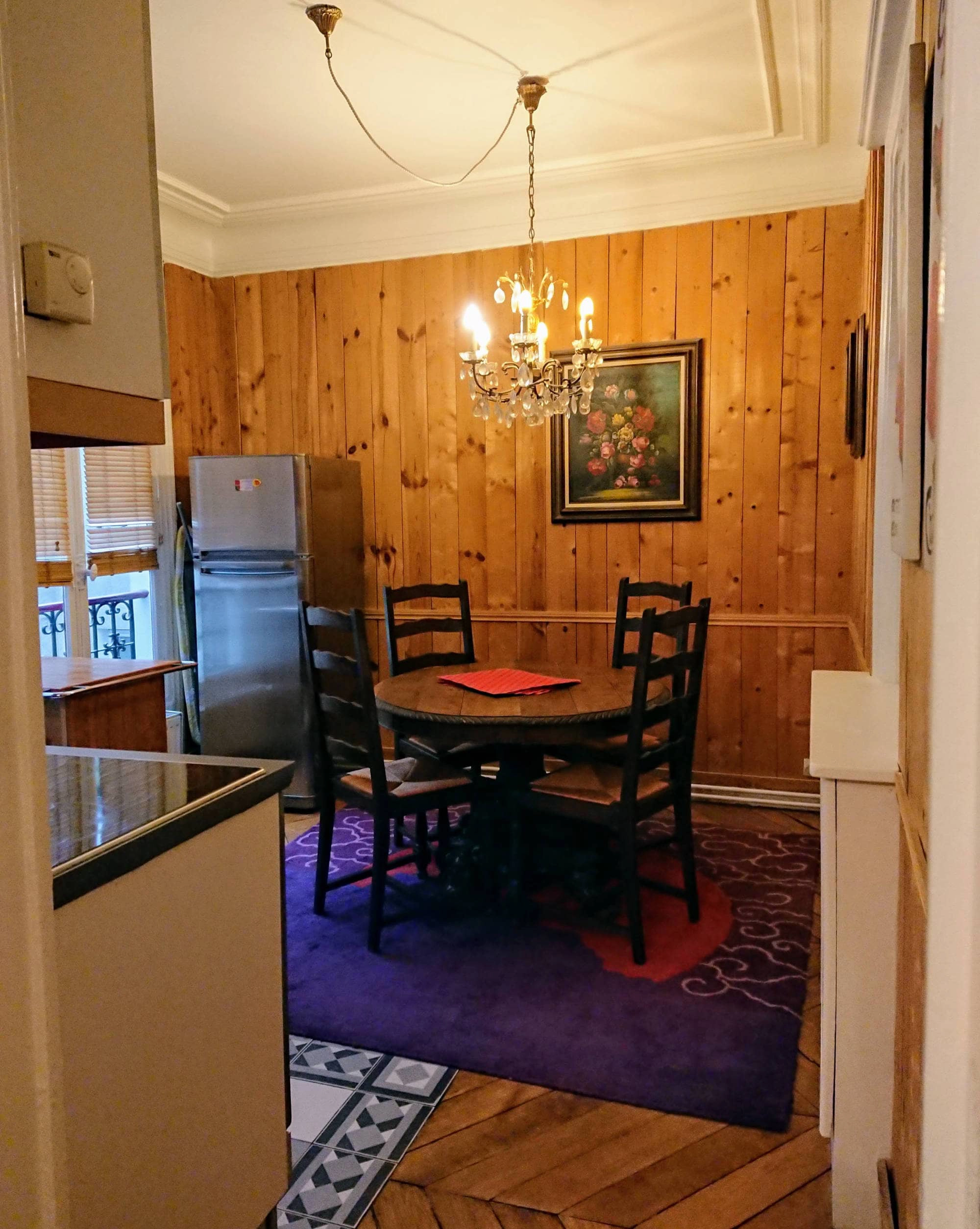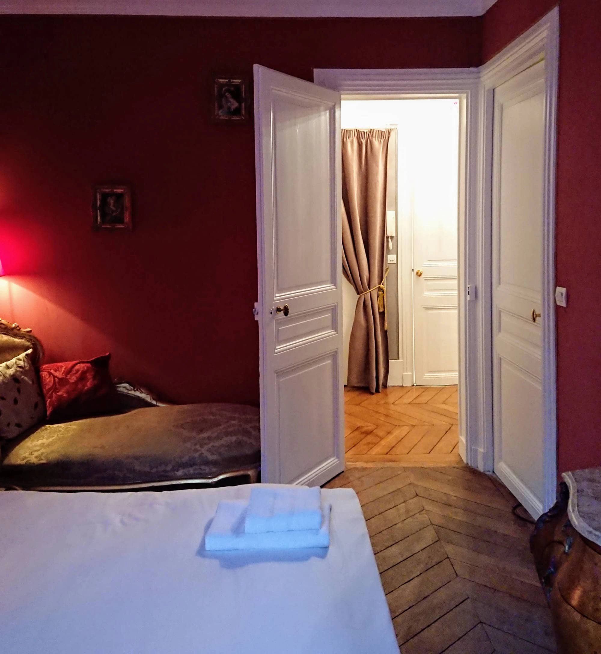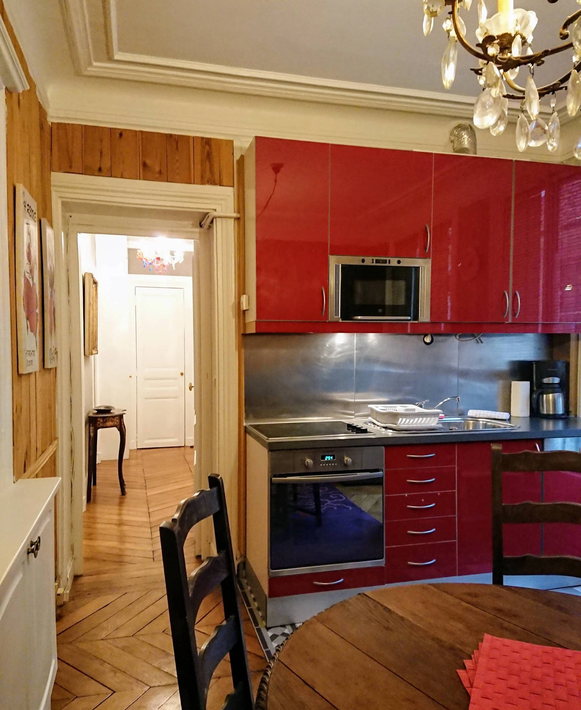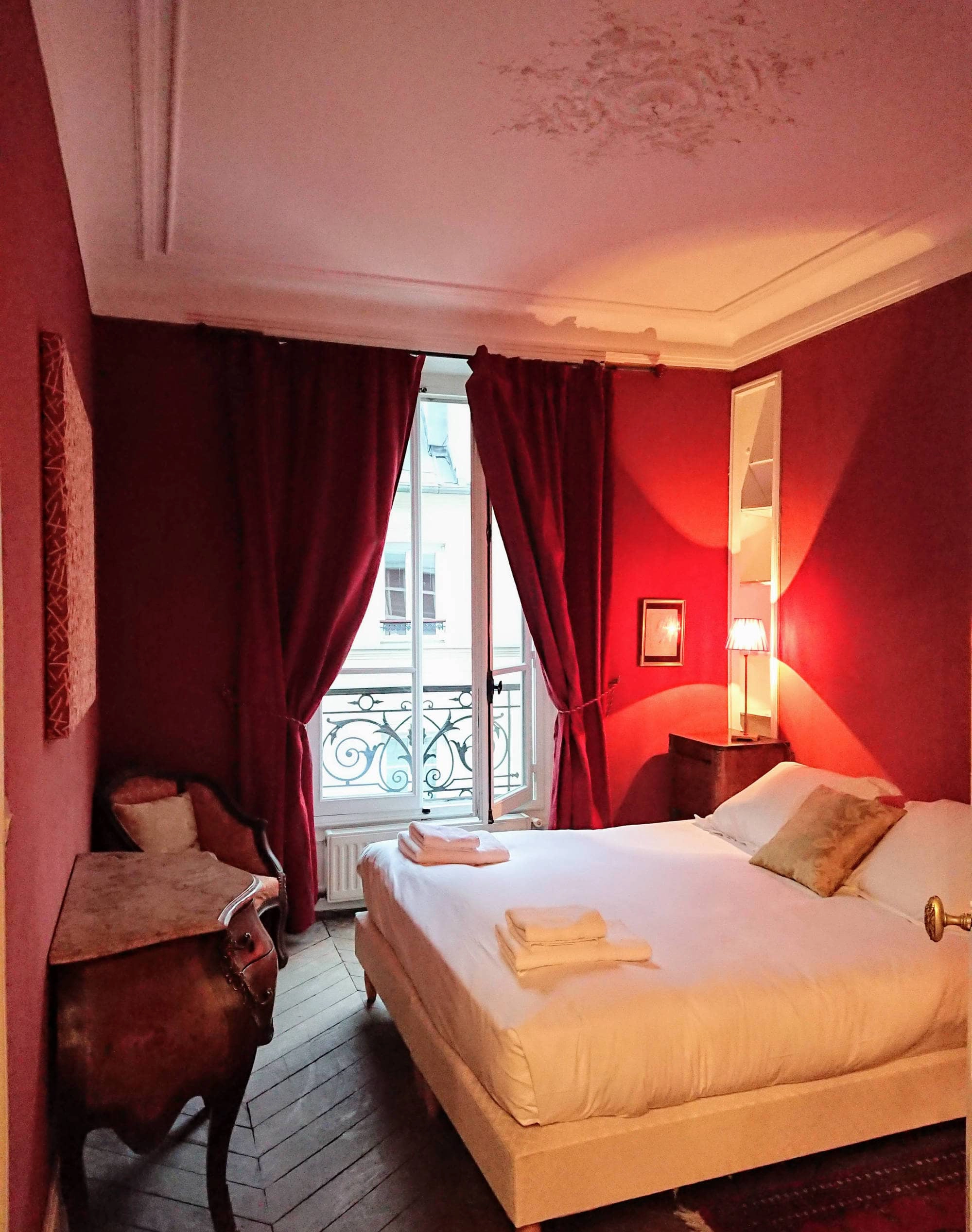 There are some games and plenty of English books to browse through. The walls are decorated with early 20th century prints of 18th century French engravings. The kitchen is fully equipped with full size oven, hob/cooktop, dishwasher and refrigerator with freezer. With double windows to the courtyard, a round antique "lions-paws" dining table and antique crystal chandelier, it's the perfect spot to enjoy a few bottles of wonderful French wine with a delicious dinner. The first bedroom is tastefully decorated in red with a queen sized bed beside which stands an original art-deco marble-topped locker.