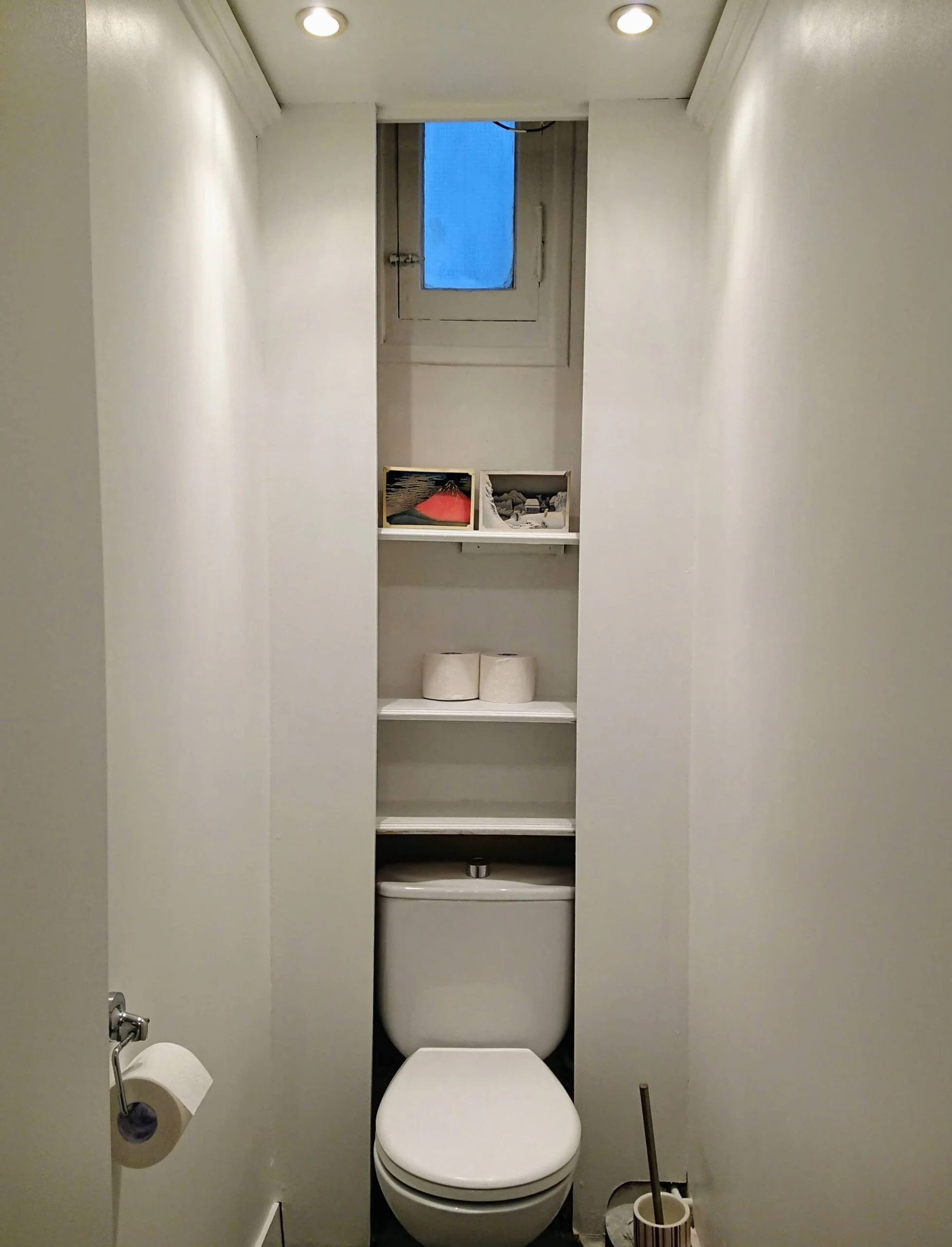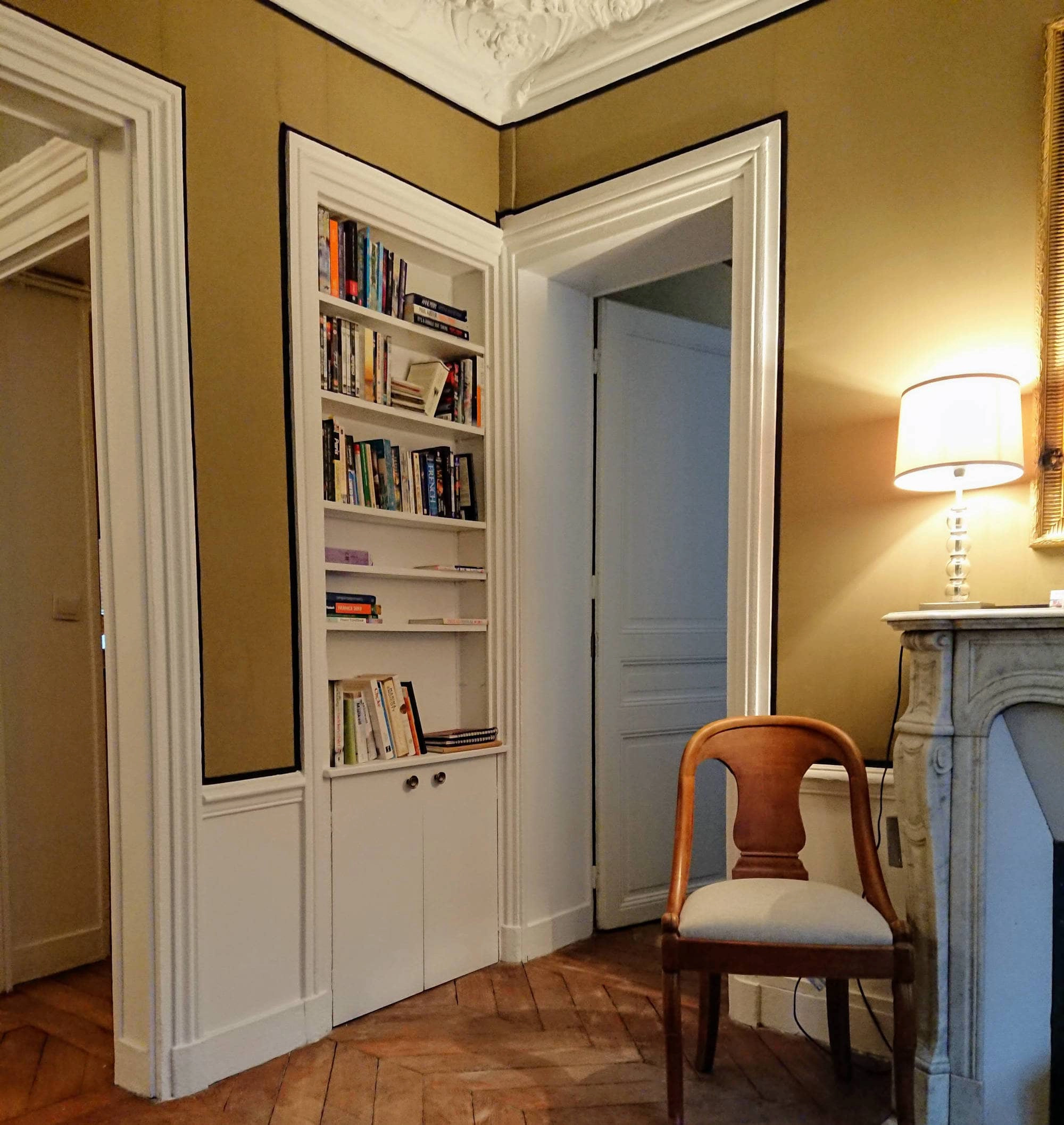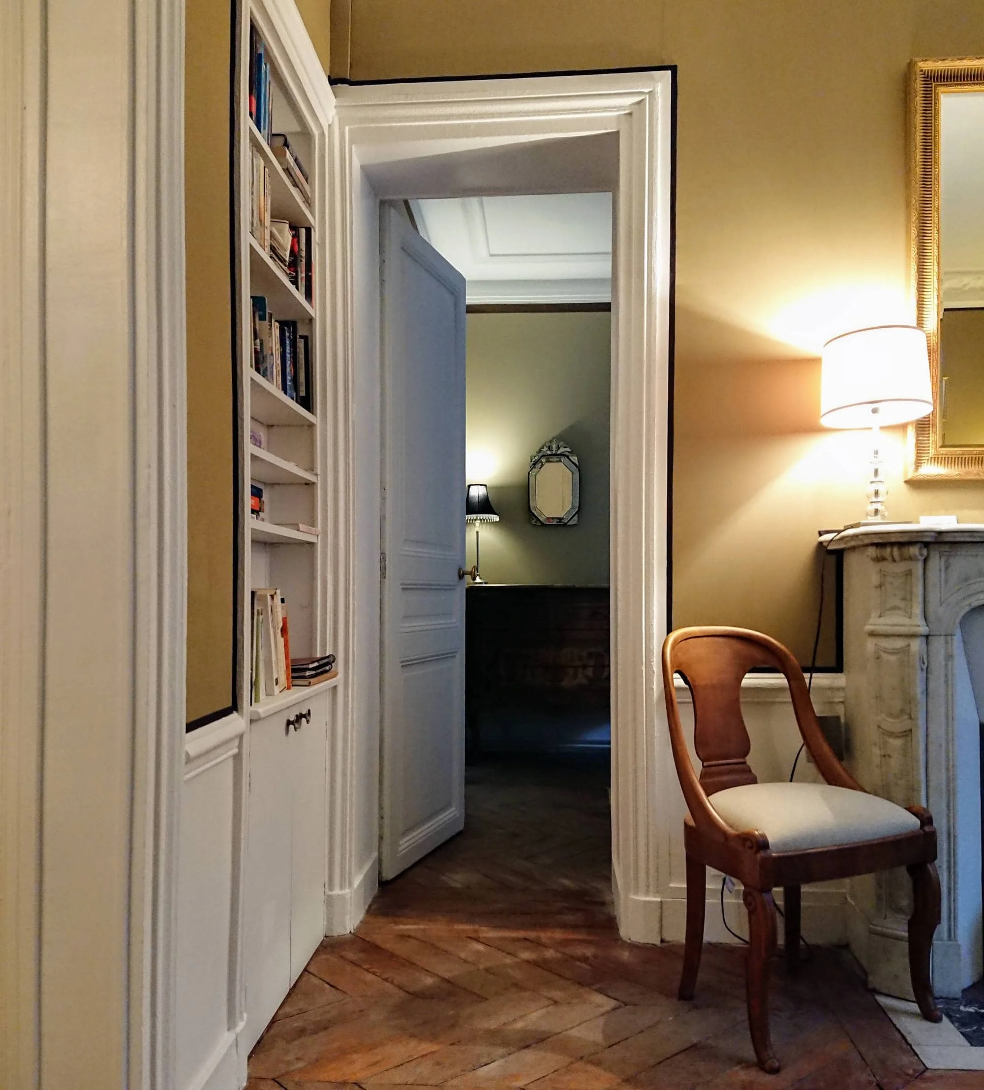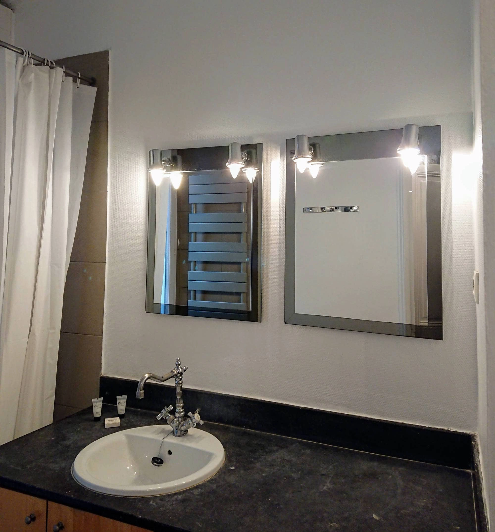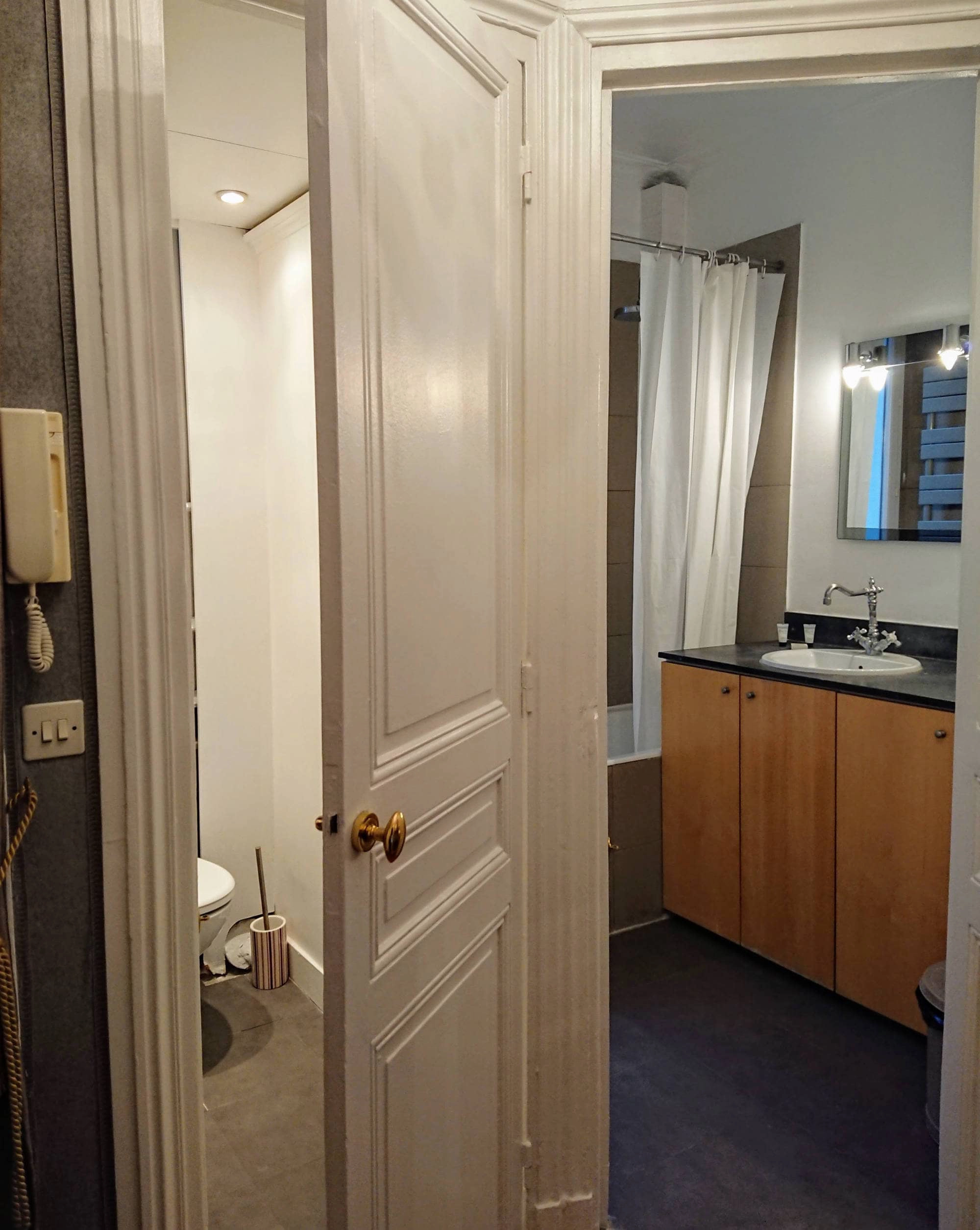 The washbasin sits in a black granite countertop with two well-lit mirrors above it. The large window to the courtyard lends a bright and airy feel to the room. The washing machine is stored underneath the countertop. As is common in Paris, the WC is in a separate room next door to the bathroom.
