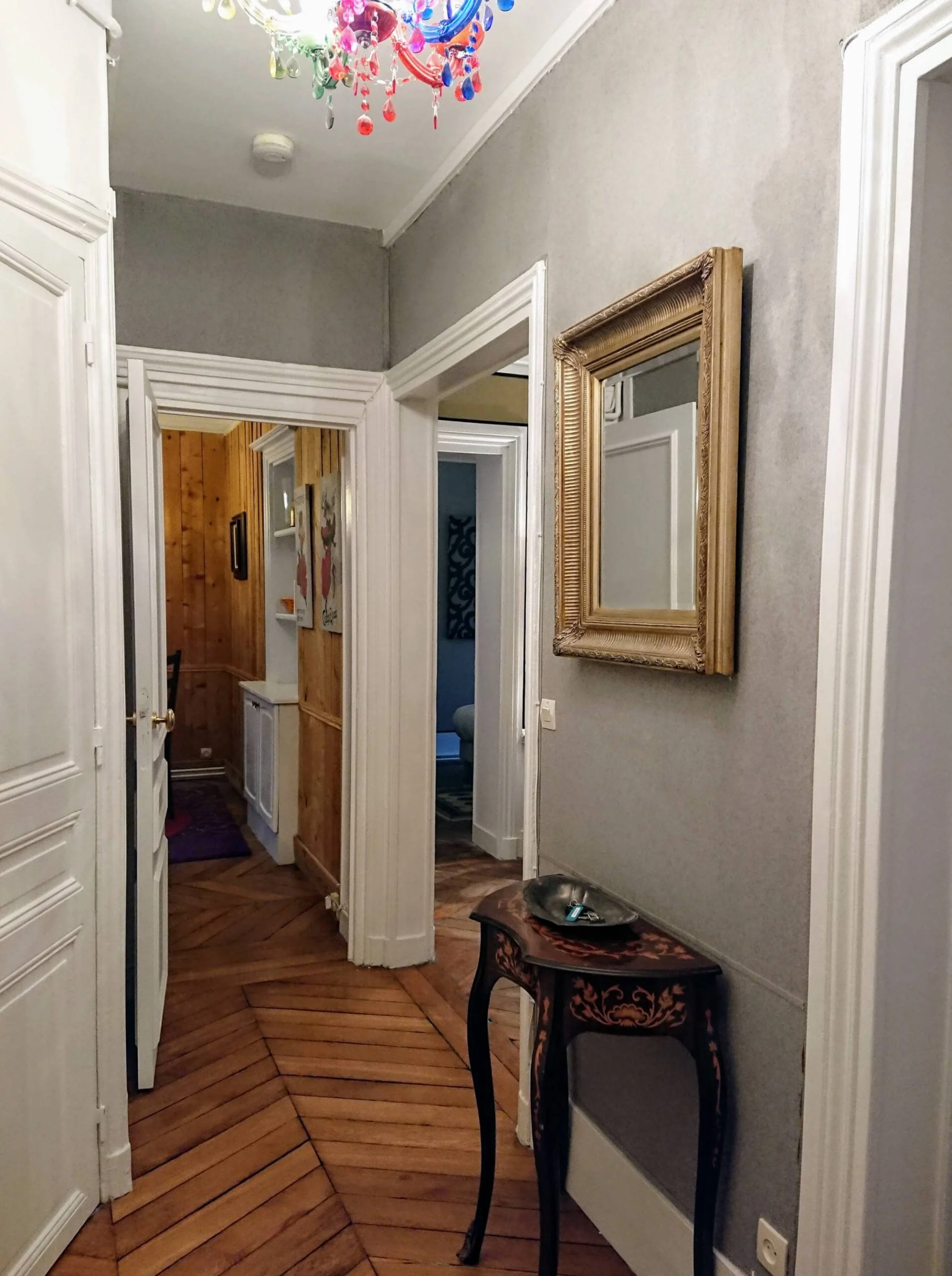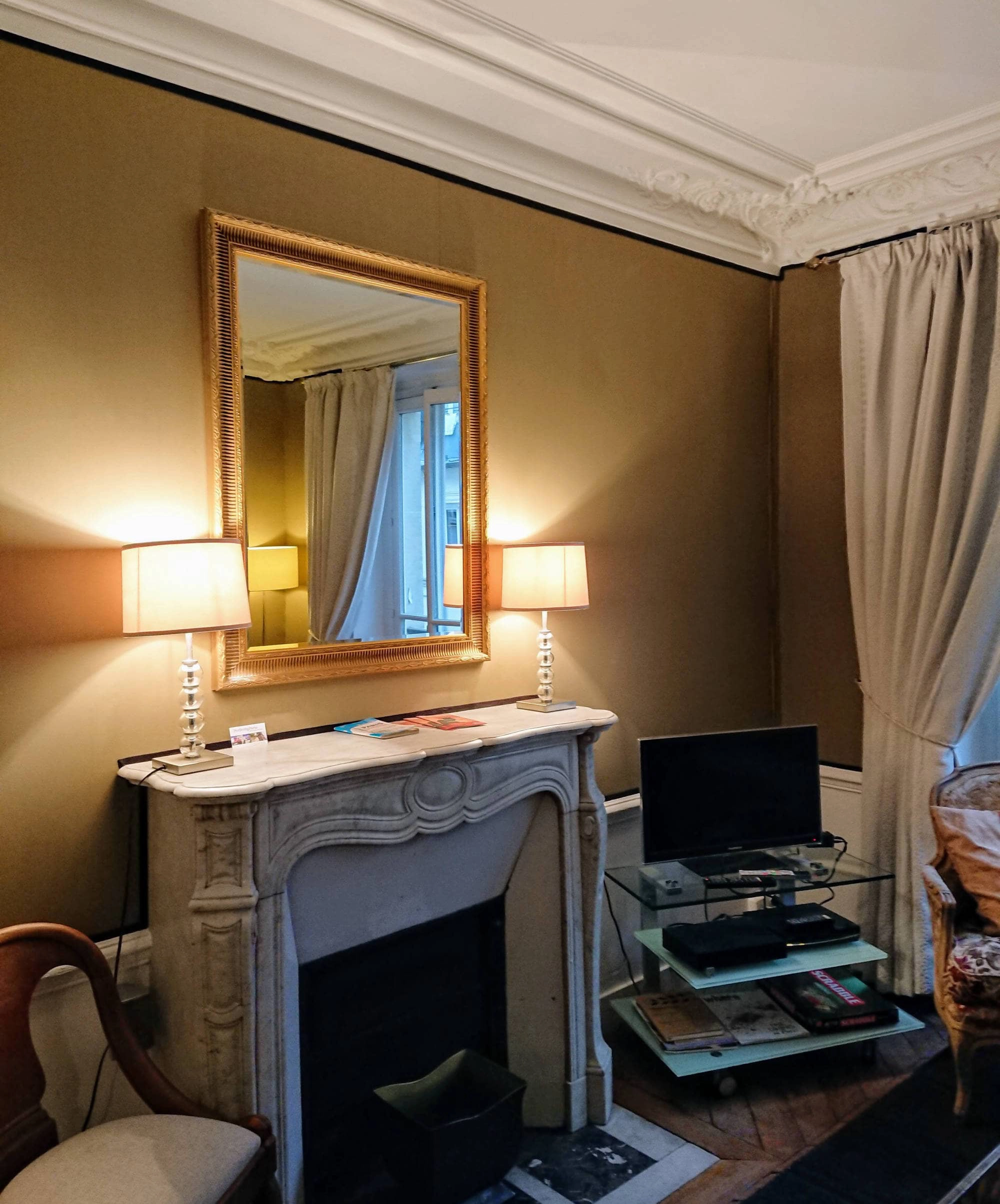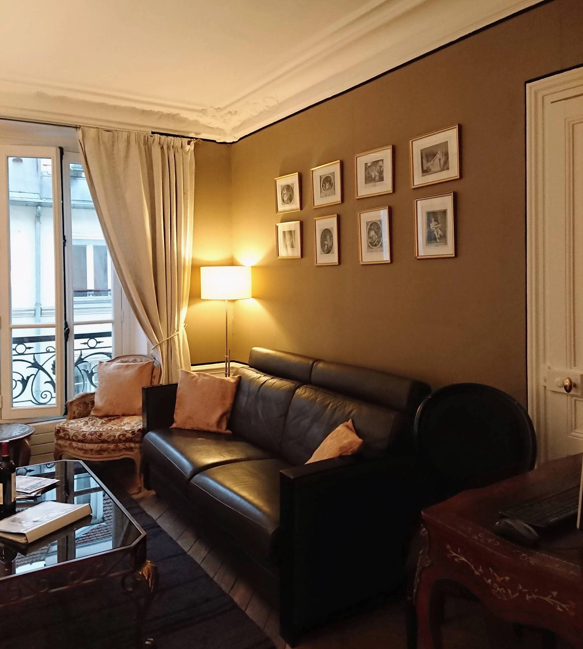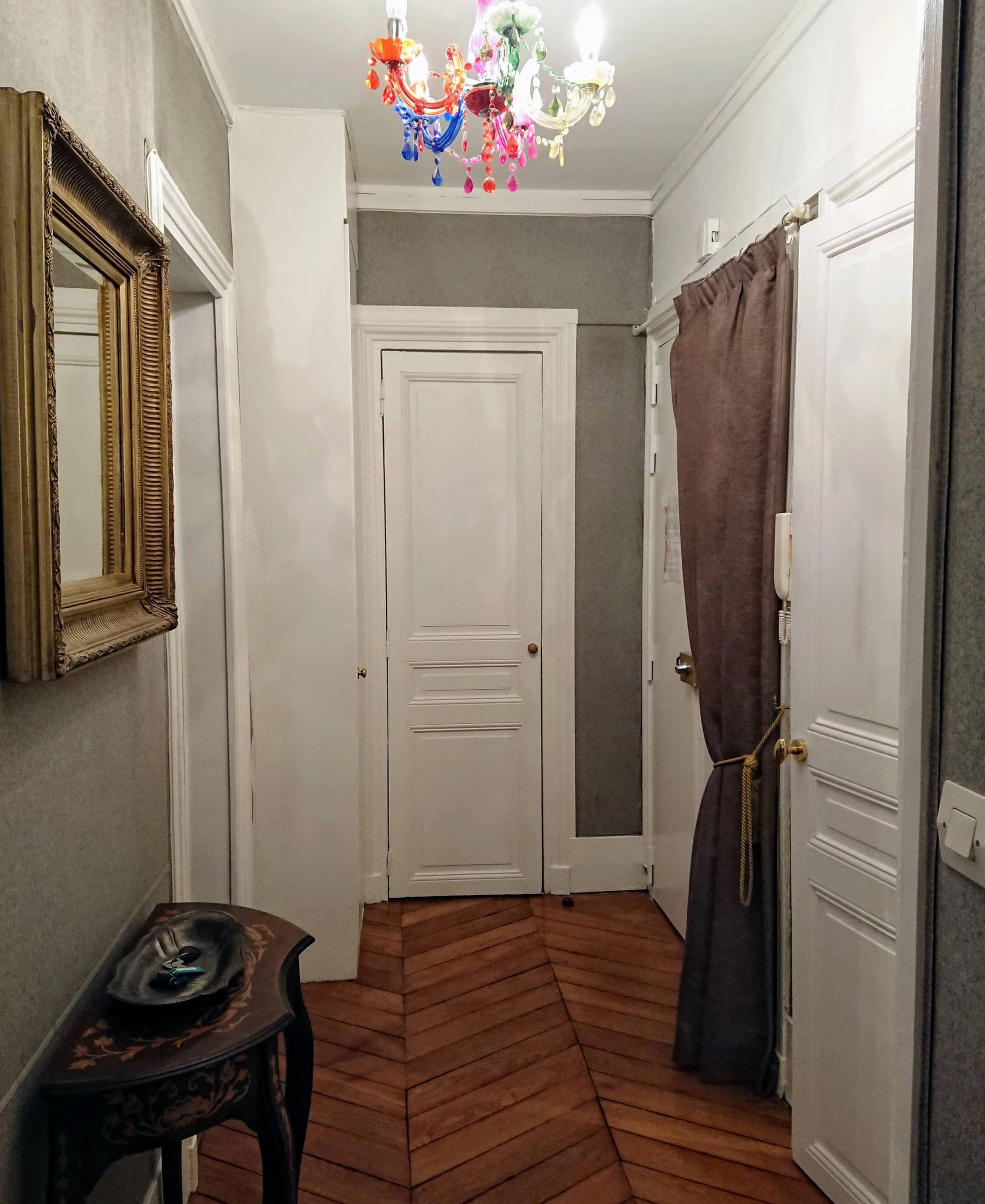 The living room features an original marble fireplace and has a double window looking onto the quiet street below. There are comfortable armchairs along with a leather sofa which converts to a full sized double bed. There is a Louis XV style desk with reading lamp which is perfect for working on your laptop. Upon entering your Paris furnished apartment, the first thing you may notice is the Louis XV style half-moon table with an original art-deco lamp and a gilt mirror above.