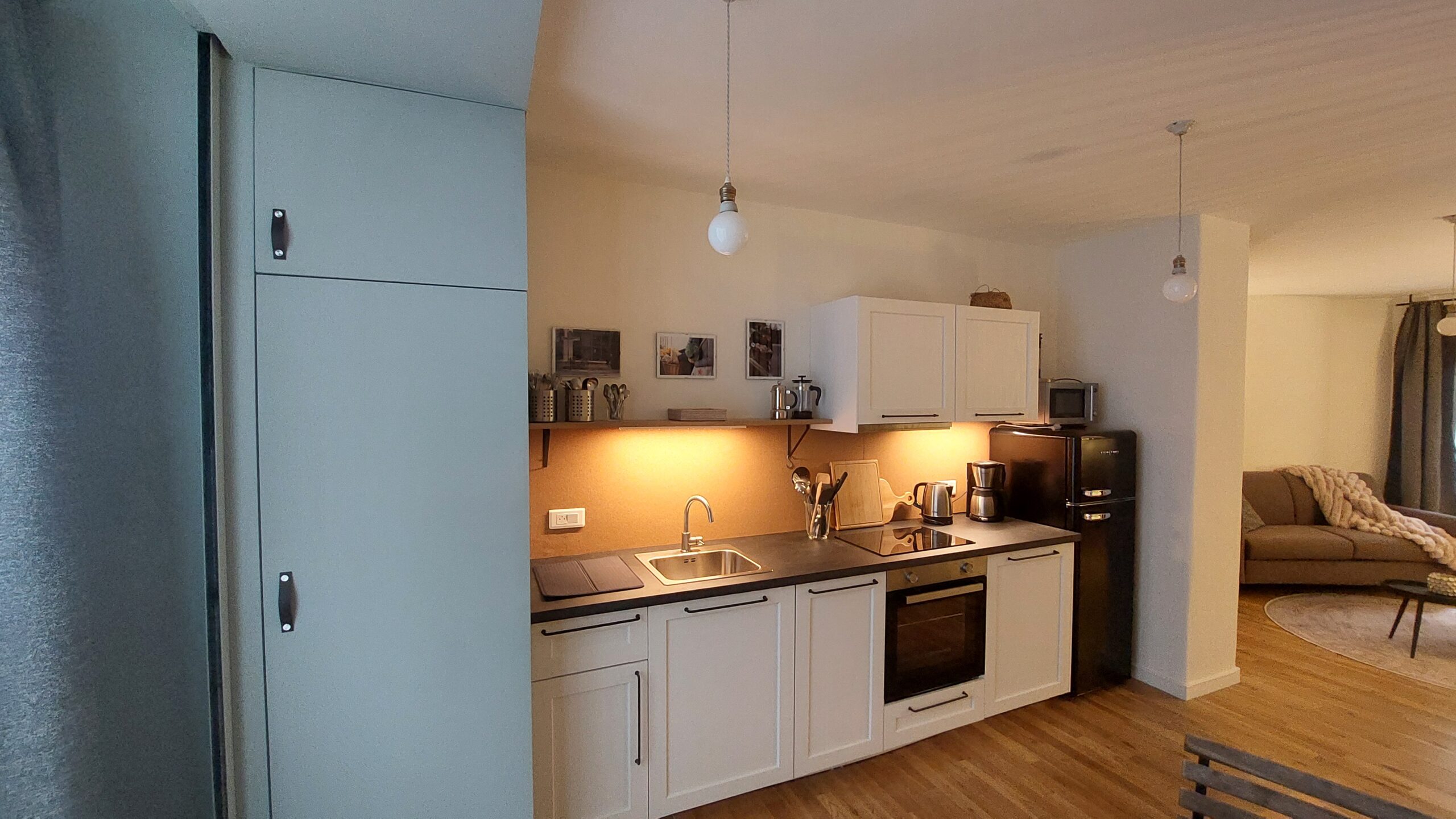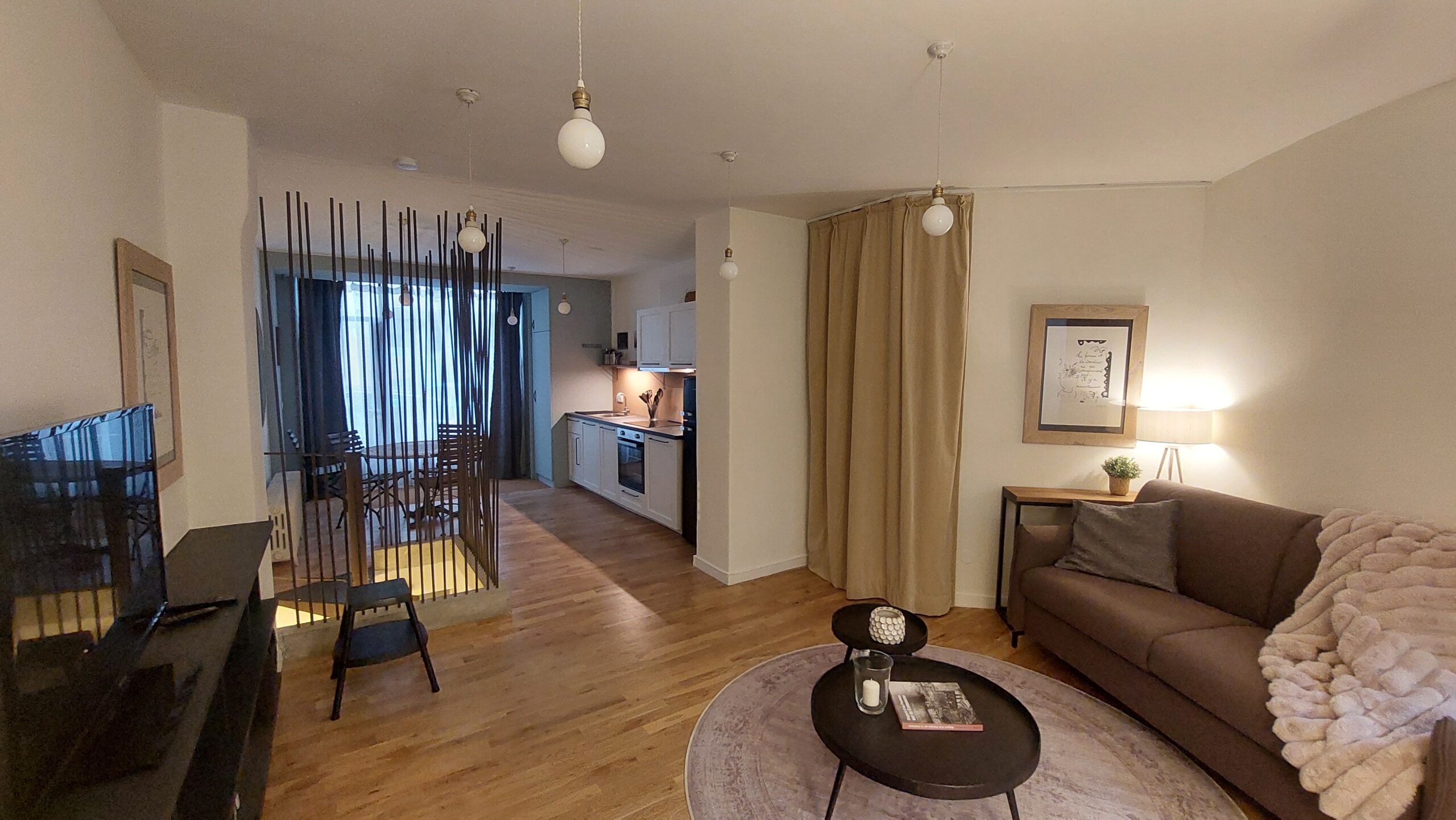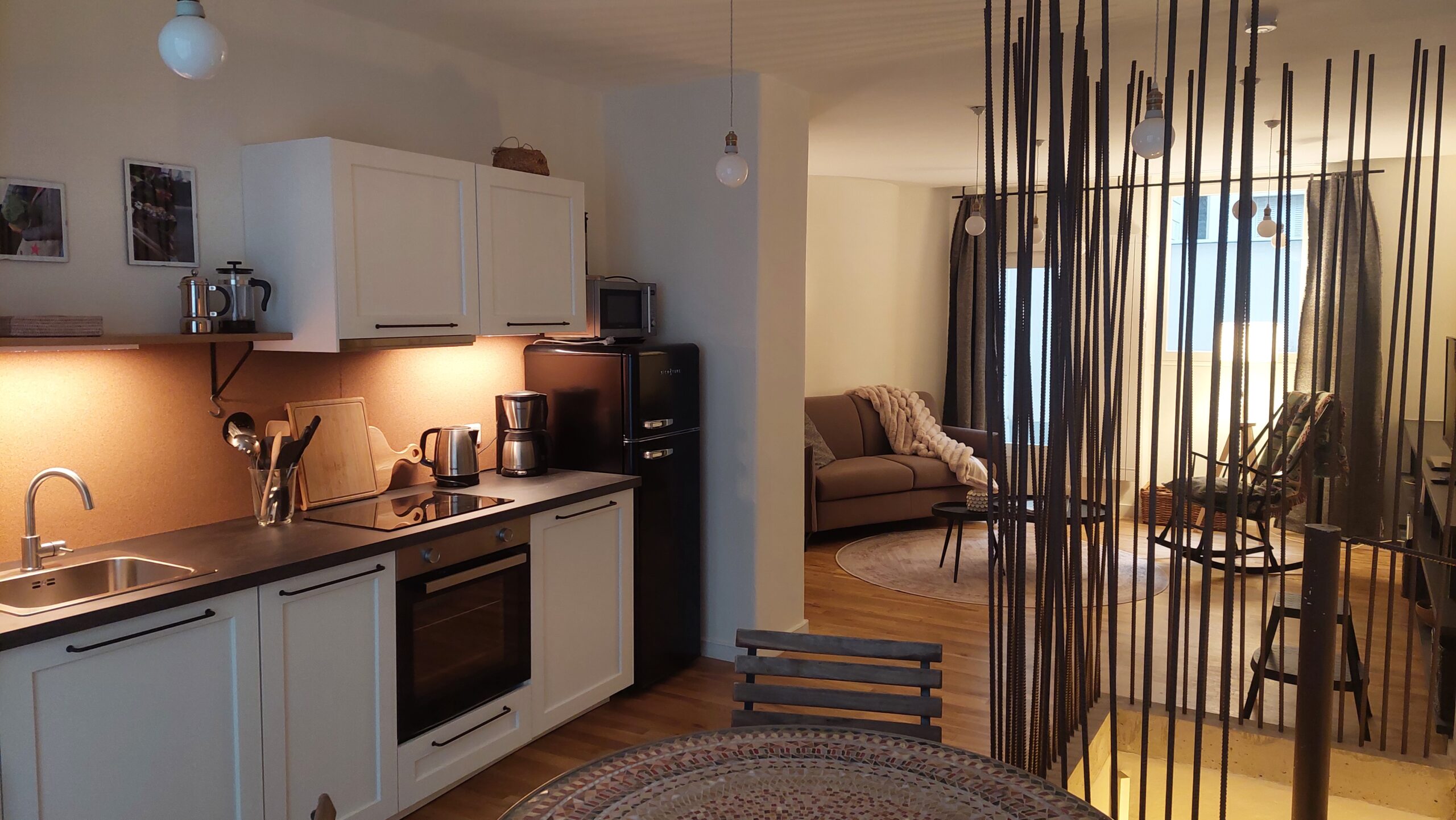 Relax in the salon, featuring a comfortable double sofa bed, a charming rocking chair, and an entertainment suite with a Smart TV and Bluetooth audio. A door at the far end of the apartment leads to a shared courtyard, perfect for letting in a fresh breeze - just remember to lock it securely. The beige curtain to the left of the sofa covers another door that connects to the rest of the building. You would only need to go through that door to access the rubbish bins.