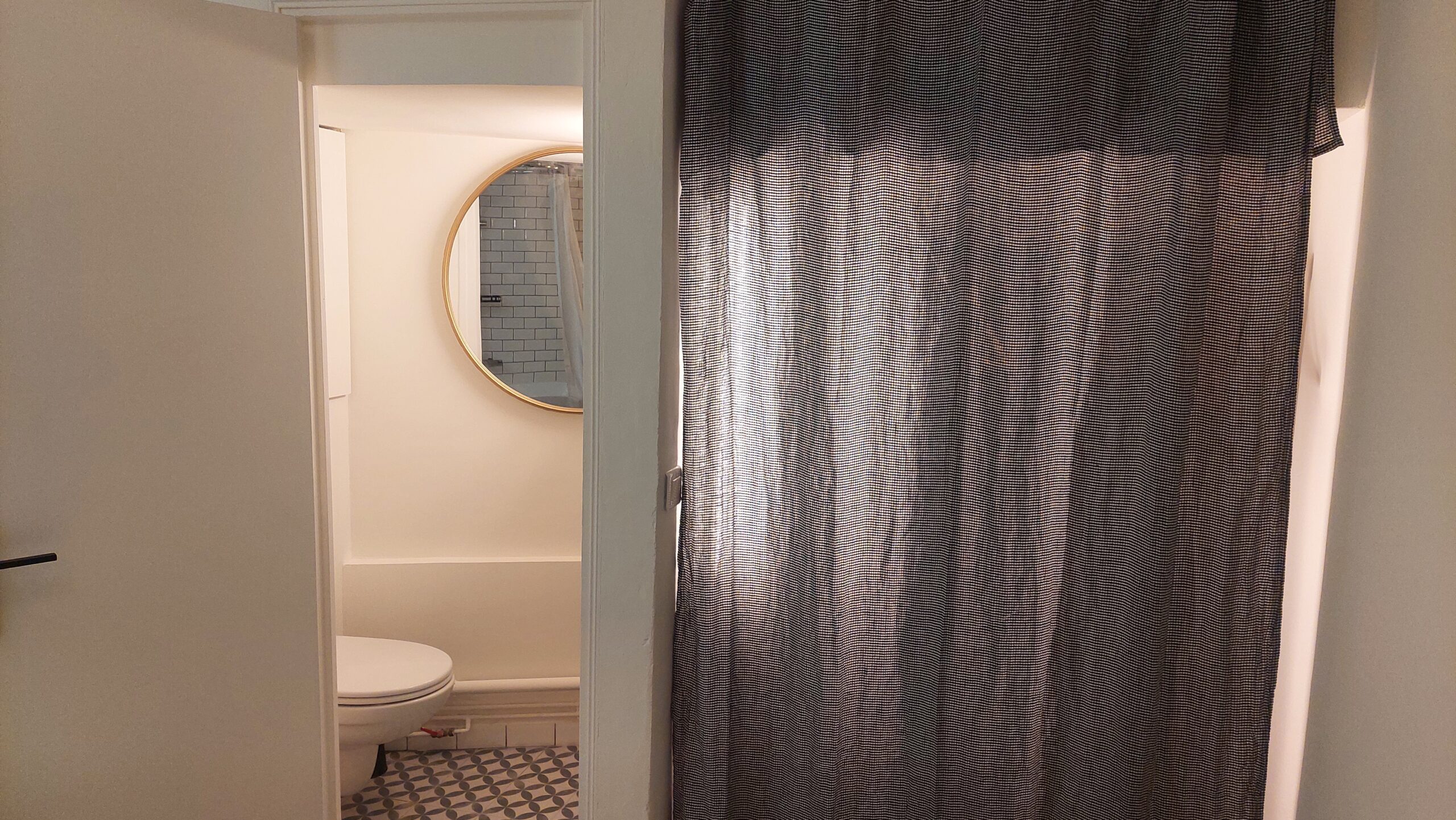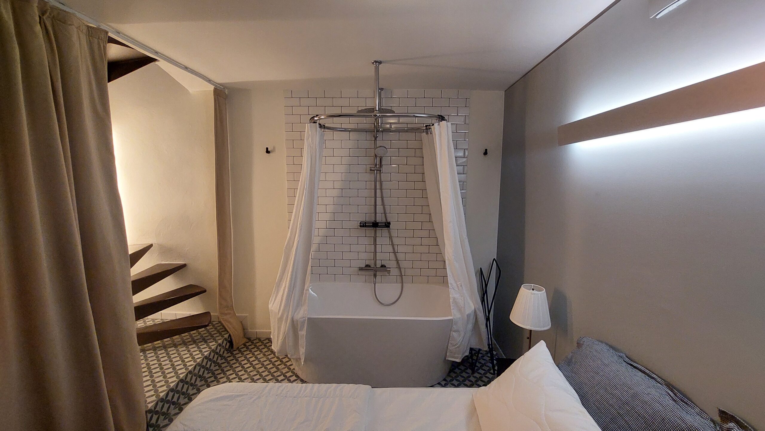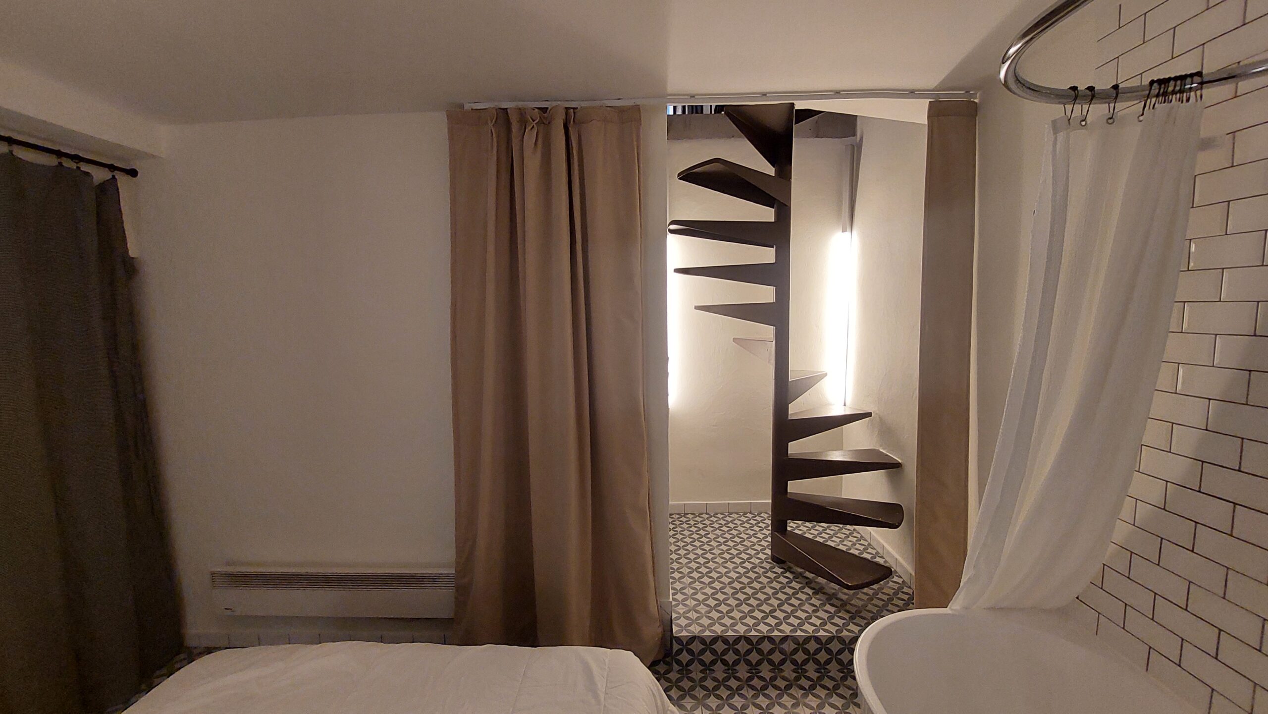 Descend the spiral staircase to find a peaceful bedroom suite. This level features an inviting bathtub with an integrated shower, a comfortable double bed, and soundproof curtains to ensure a restful night's sleep. The toilet is also downstairs and the checked curtain hides a clothes rack.