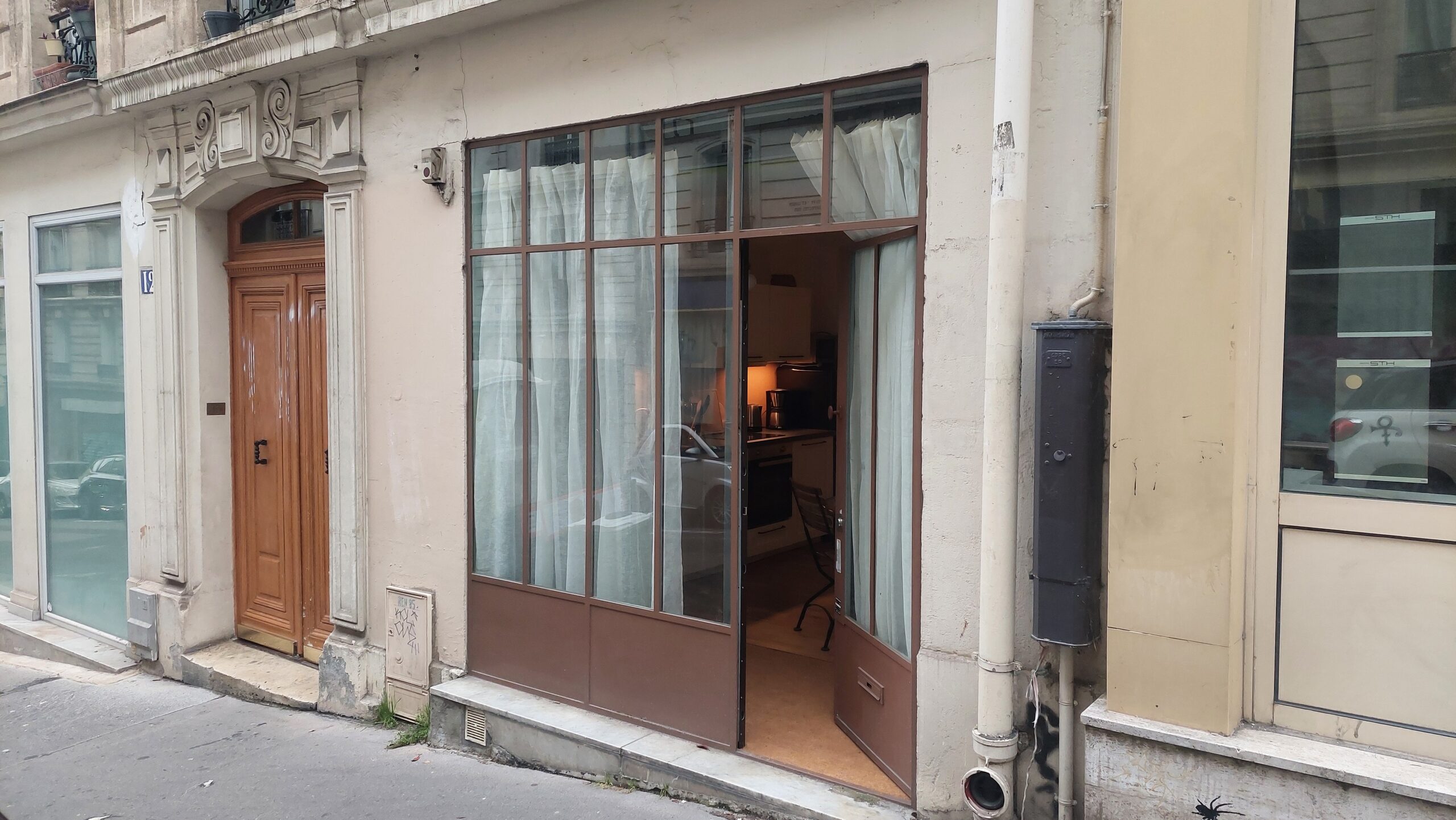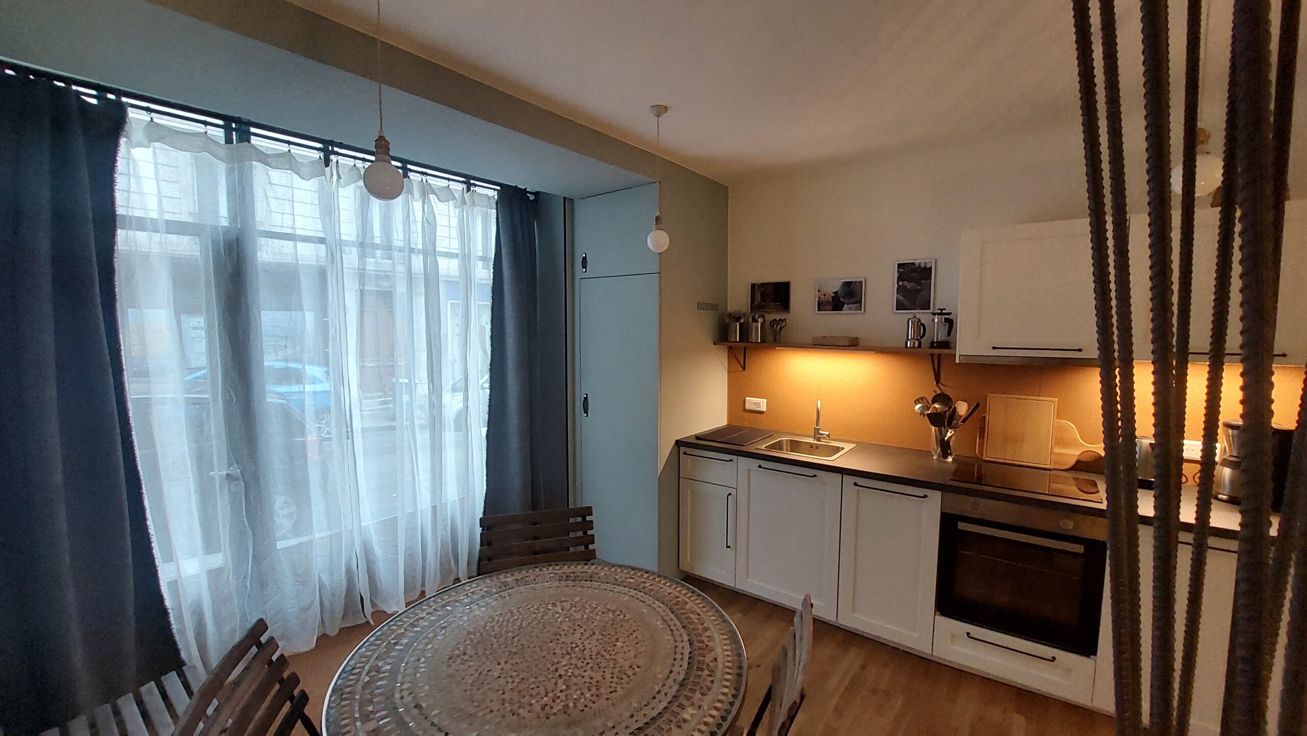 Enter this furnished Paris holiday flat through the original storefront windows into an open-plan living area. To your left, a chef-ready kitchen, exceptionally spacious for Paris, boasts modern amenities, a dishwasher, and a discreet washer-dryer hidden in the cupboard to the left of the sink. To your right, the dining table sits beside a spiral staircase.