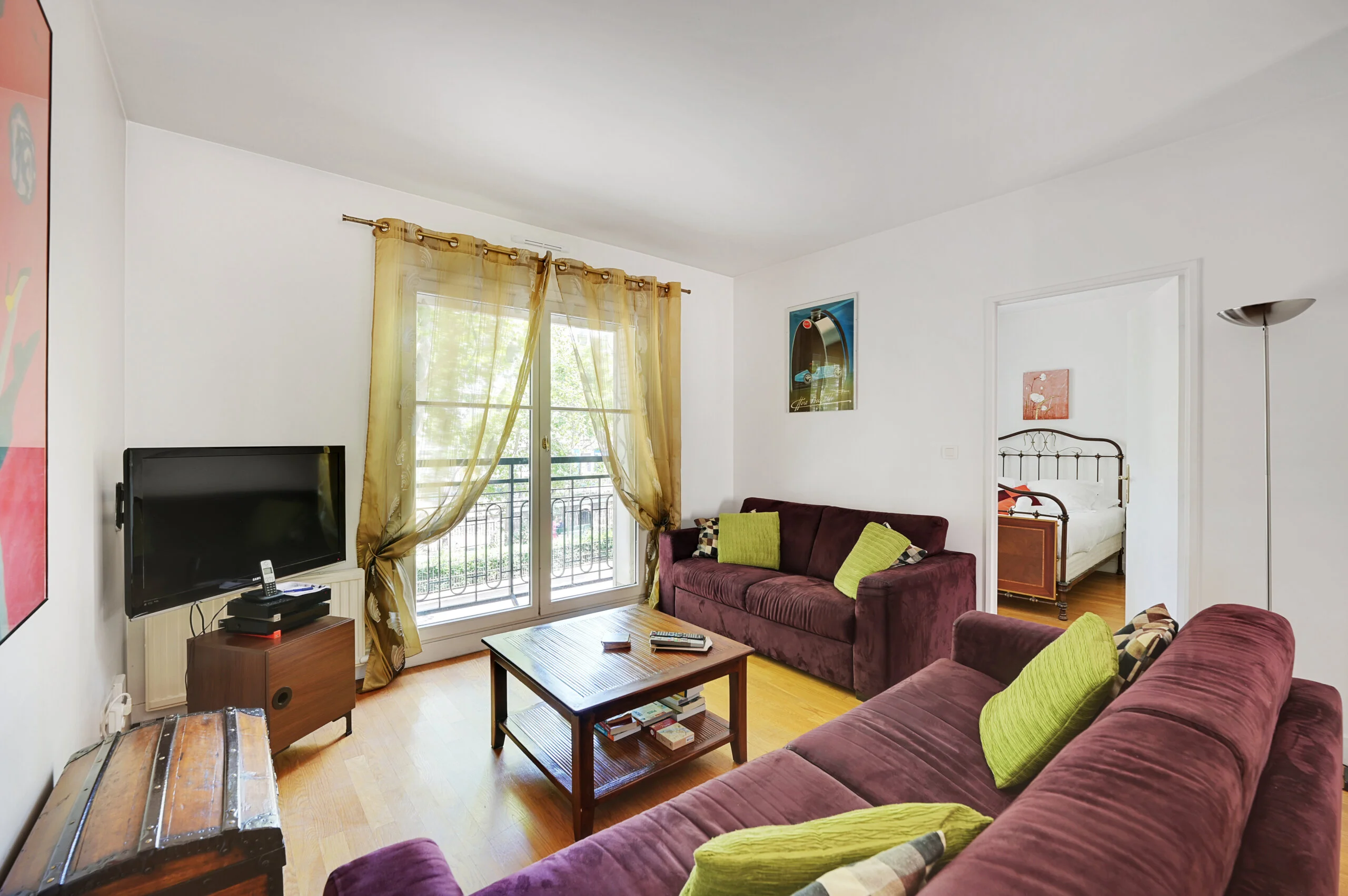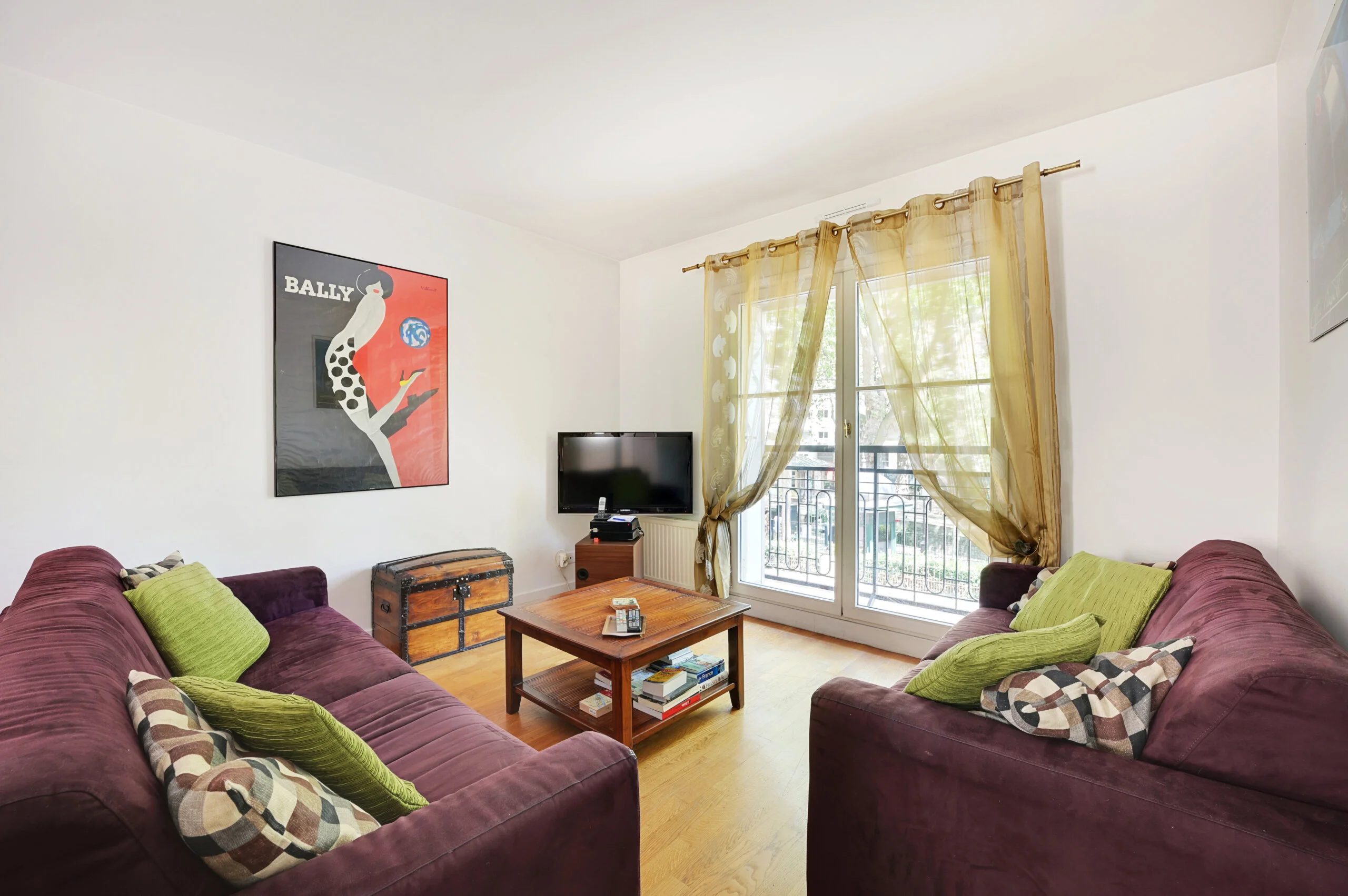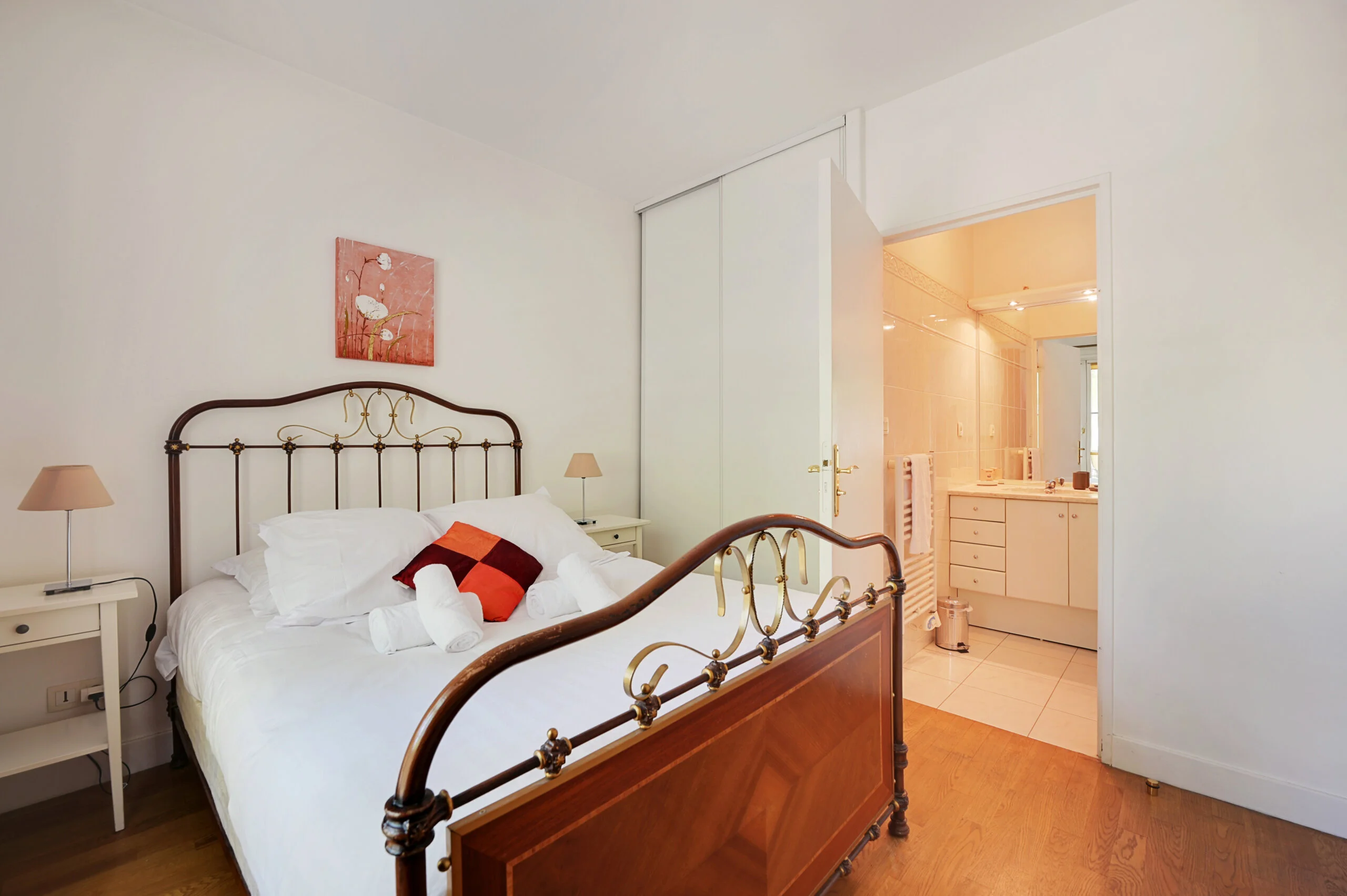 The comfortable sitting room has a two-seater sofa and a queen size sofa bed (both by Natuzzi), a 42 inch flat screen TV, Cable TV with integrated Blu-ray DVD player and a music player docking (iphone, ipod and MP3). The dining area has a square dining table allowing for comfortable dining of up to 8 people. The large pictures on the walls are by Bernard Villemot, a famous French graphic artist known primarily for his iconic advertising images. The bedroom has a double bed, a large closet. The ensuite bathroom has a shower with bathtub and a basin. The toilet is off the entrance hall in the flat and includes a wash hand basin and mirror.
