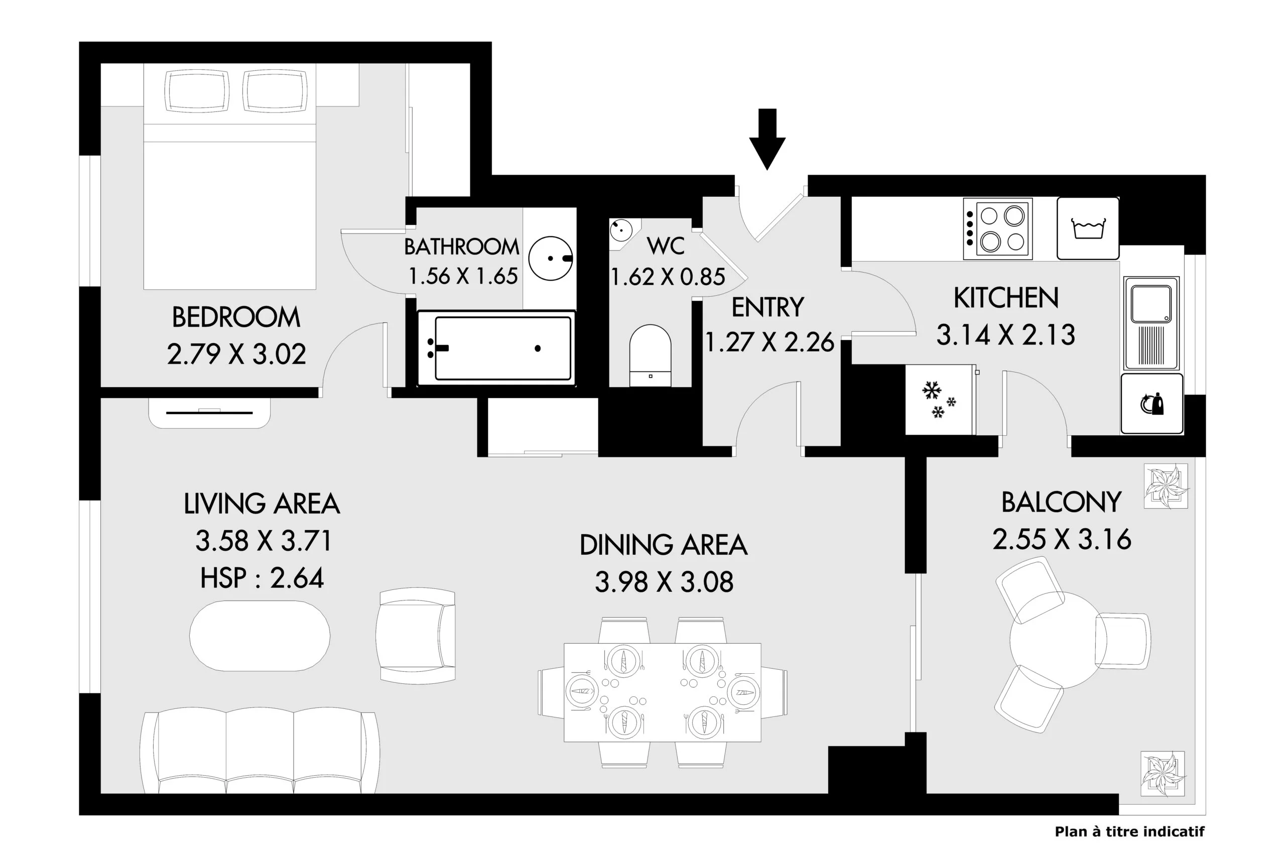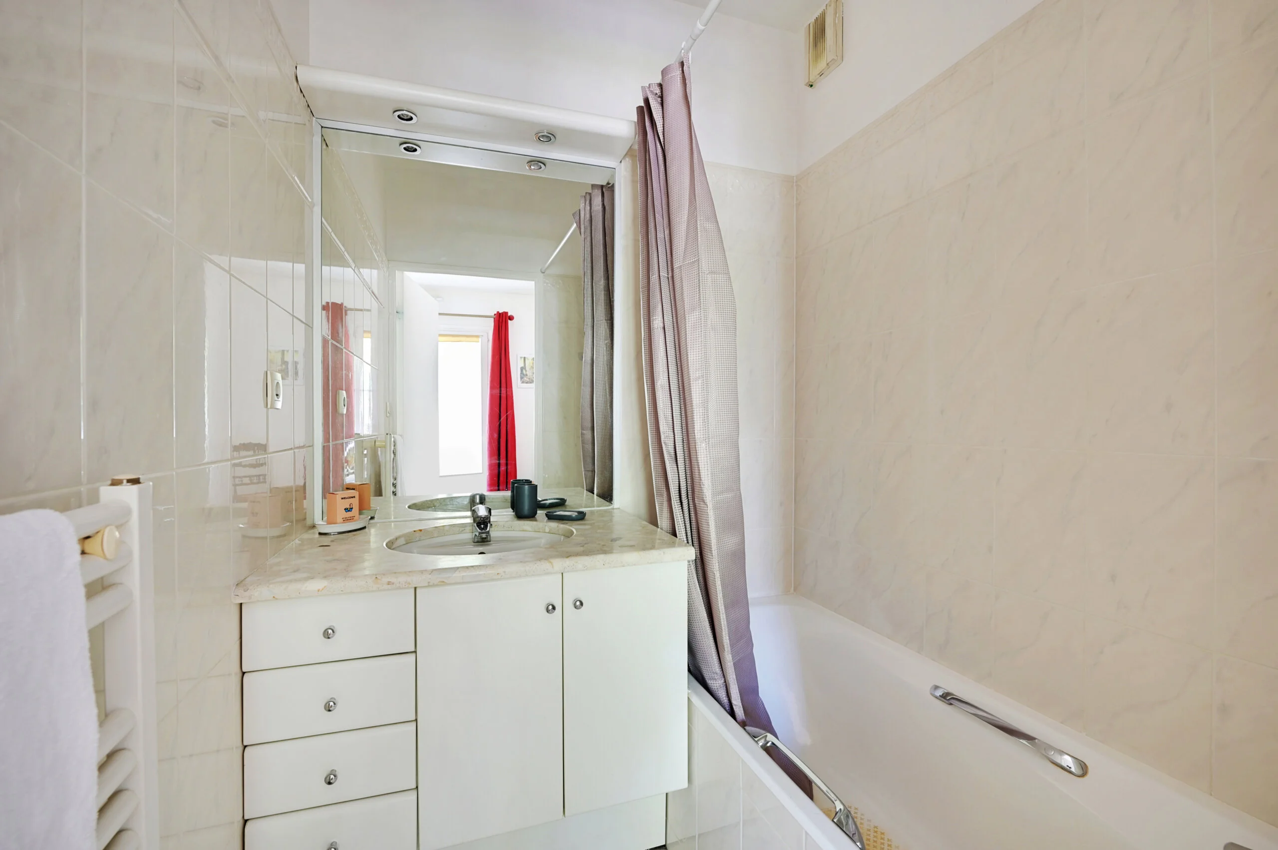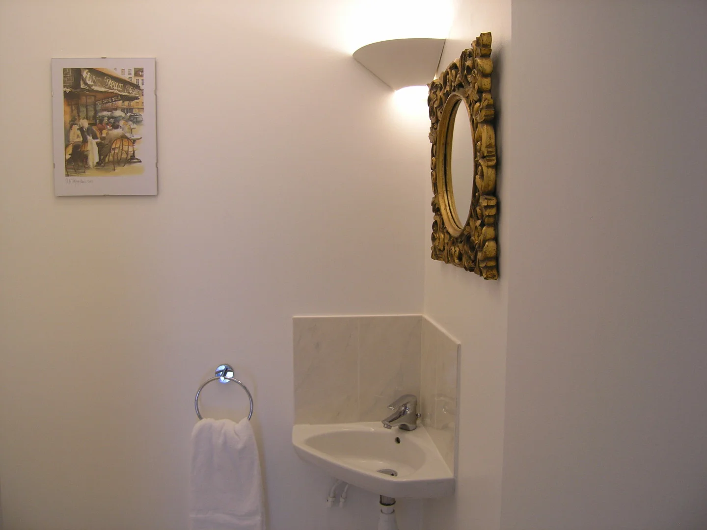 The comfortable sitting room has a two-seater sofa and a queen size sofa bed (both by Natuzzi), a 42 inch flat screen TV, Cable TV with integrated Blu-ray DVD player and a music player docking (iphone, ipod and MP3). The dining area has a square dining table allowing for comfortable dining of up to 8 people. The large pictures on the walls are by Bernard Villemot, a famous French graphic artist known primarily for his iconic advertising images. The bedroom has a double bed, a large closet. The ensuite bathroom has a shower with bathtub and a basin. The toilet is off the entrance hall in the flat and includes a wash hand basin and mirror.