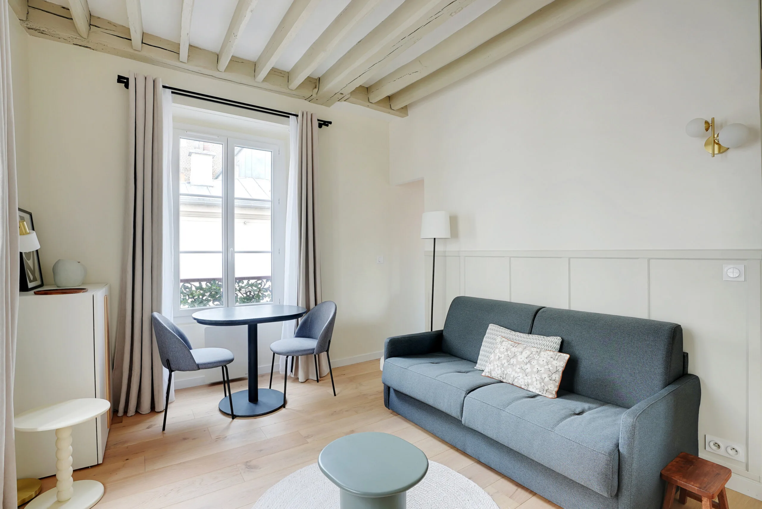 The comfortable sofa bed was purchased in May 2025 and has a high-quality mattress. The two windows provide natural light, and there is a third window in the kitchen.