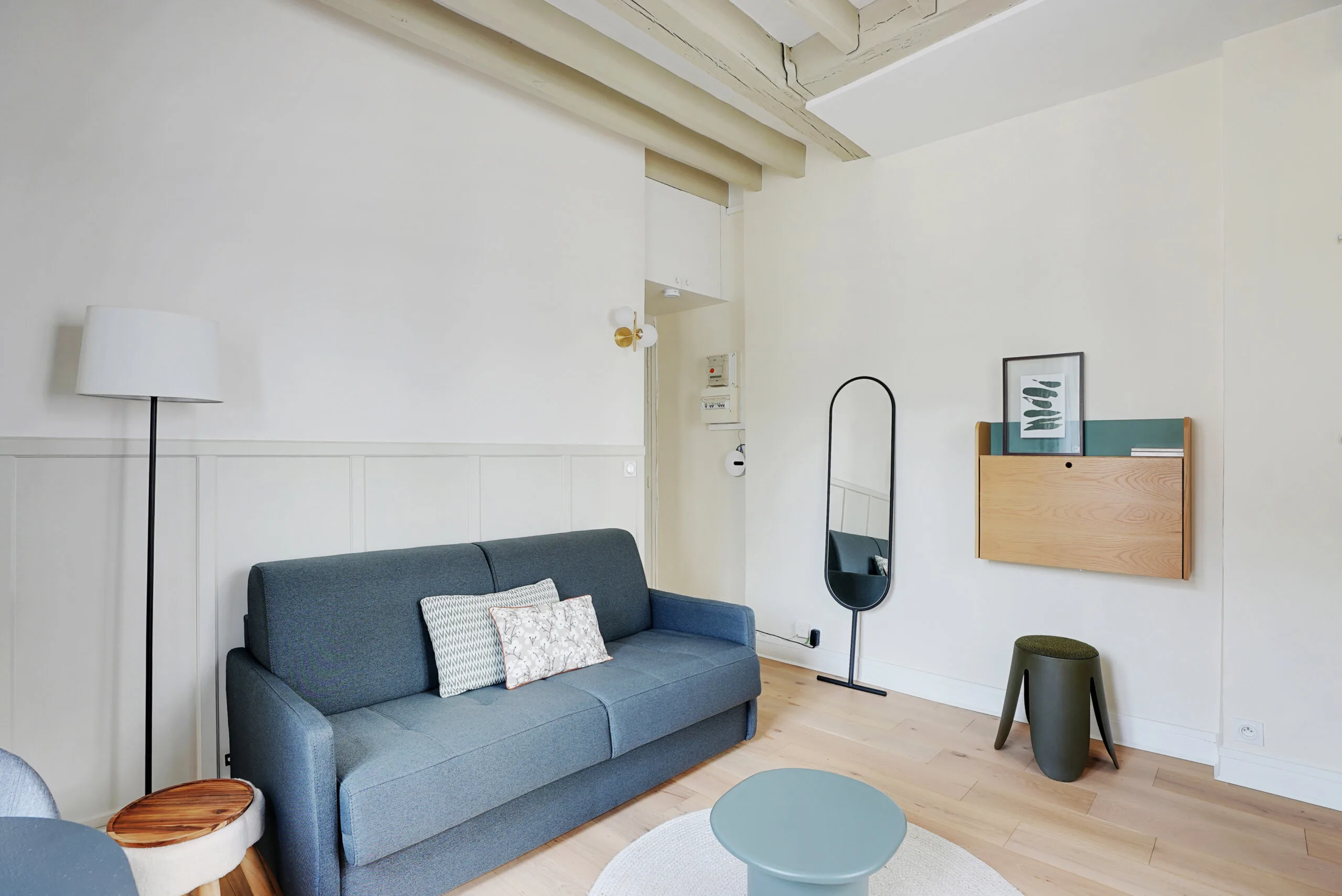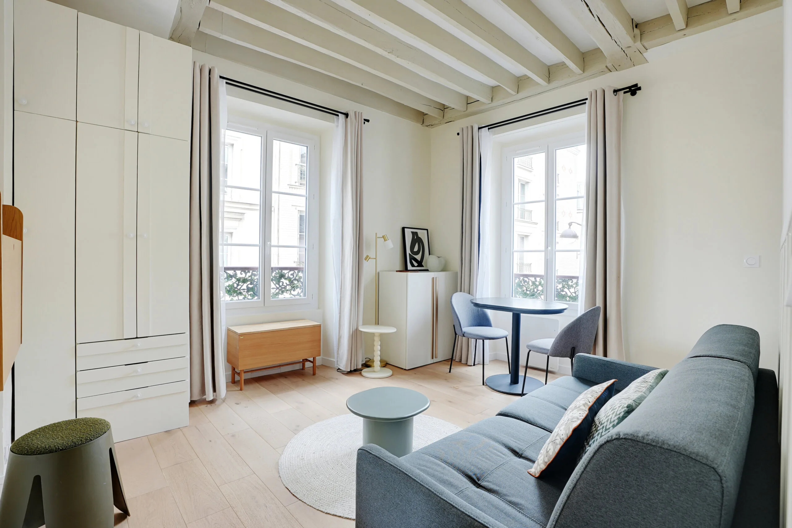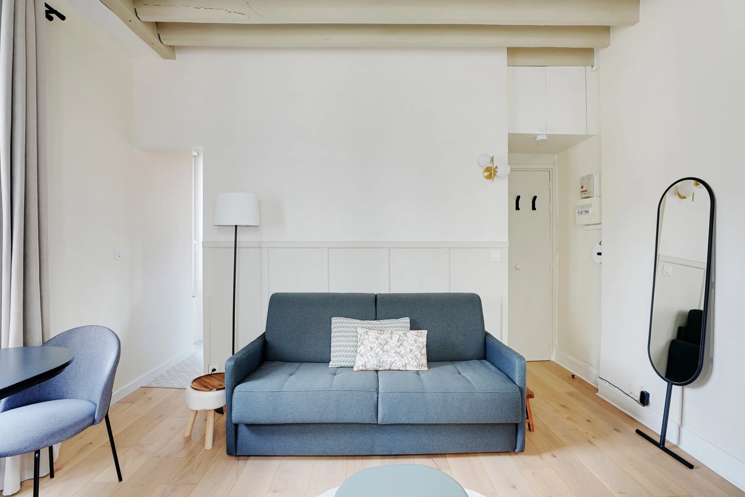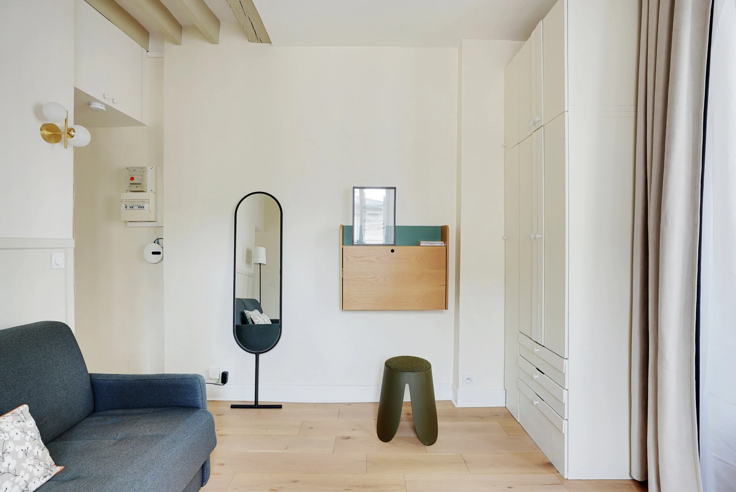 Walking into the living area, just after the full-length mirror is a desk that folds up and a stool, making it a perfect workspace. A large, floor-to-ceiling cupboard has plenty of space for storage. The bench by the window also contains space for storage, as does the white cupboard by the dining table. The entryway has a cupboard high up to the ceiling for more storage.