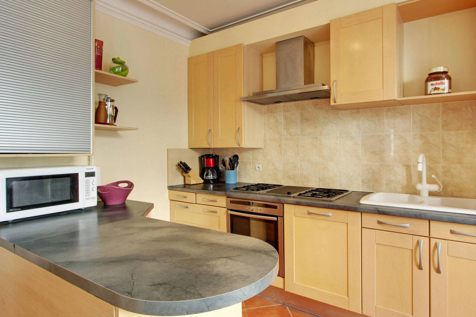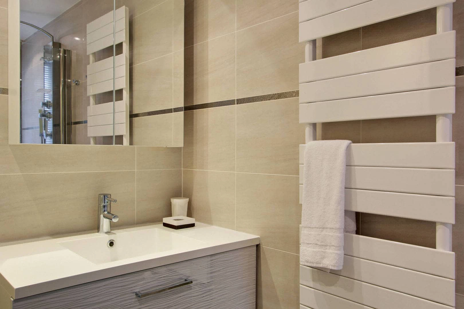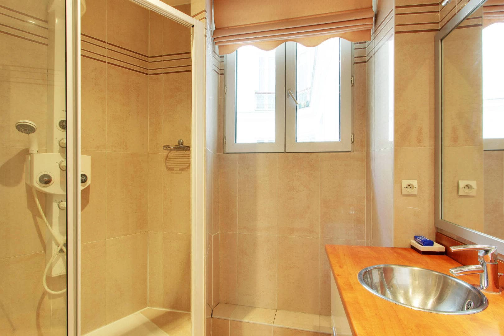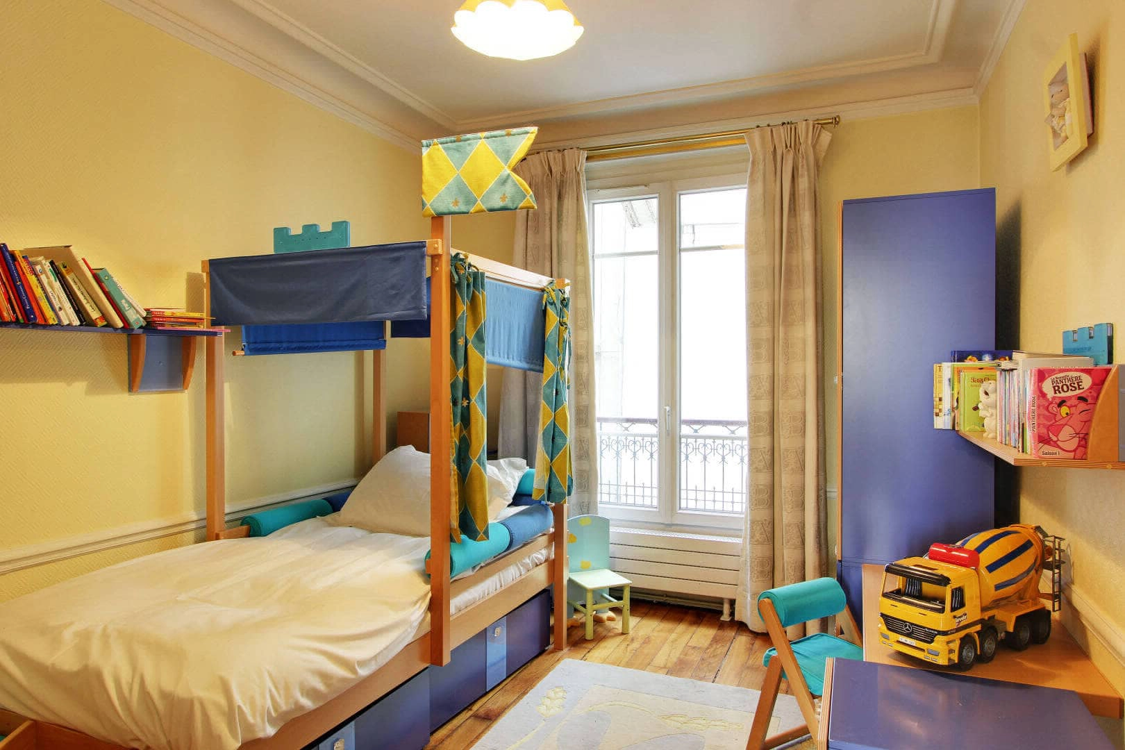 Enjoy your morning coffee and croissant from one of the many fabulous local boulangeries as you watch the passersby shopping at the various market vendors on the street or watch the sunset as you enjoy your glass of wine. The apartment combines both modern comfort and a classic French style. There are two bedrooms on the first floor - the master bedroom and a child's room. The master bedroom contains a queen-size bed, a large-screen tv (basic channels) and a spacious walk-in closet. The second bedroom on this floor is a charming child's room with a custom-built, fortified castle-like bed fit for any little prince or princess. The bedroom also has a folding bed that transforms into an additional single bed for another person allowing two adults to sleep in this room.