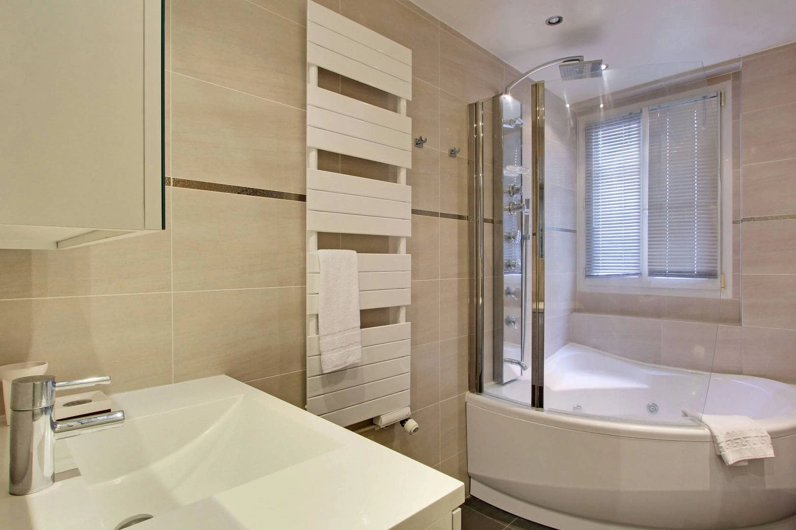 Three of the four bedrooms are courtyard-facing. Two of the bedrooms (brass bedroom and library) face the street but you won't have to worry about street noise since there are noise-blocking double-glazed windows throughout the entire apartment. The luxurious residence has two full bath/shower/toilet rooms and one shower room with a separate WC. A separate toilet is located just next door to this shower room. On the second floor, you will find a third shower room, which is both spacious and modern.
