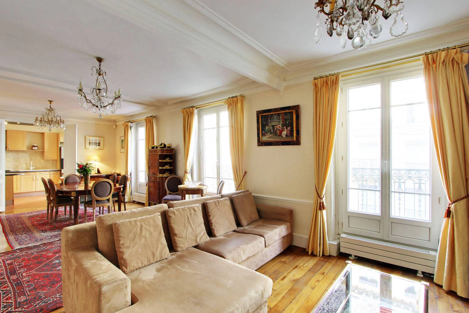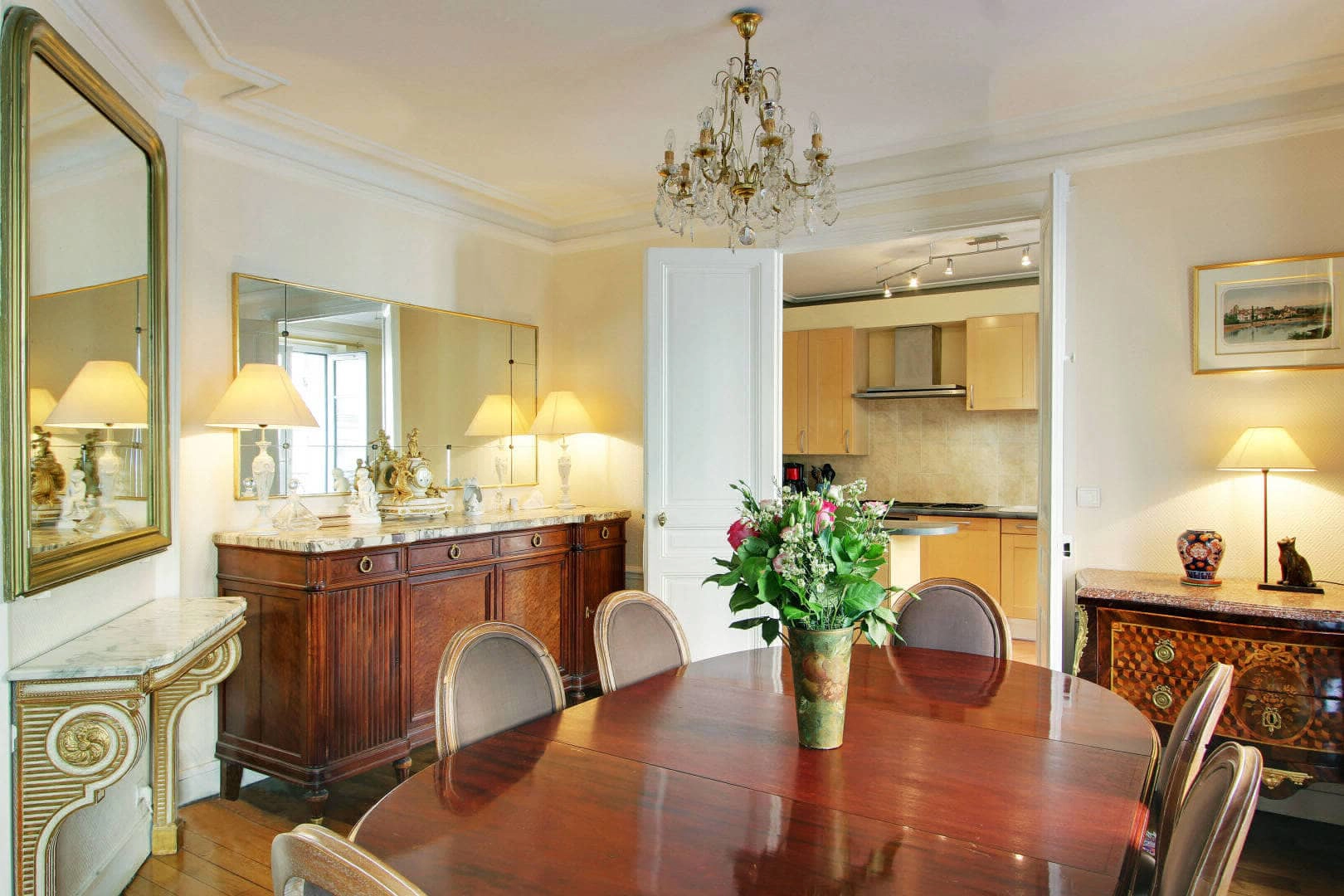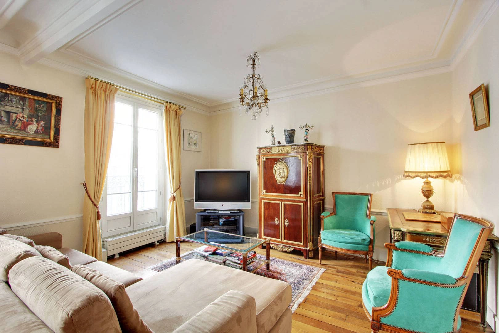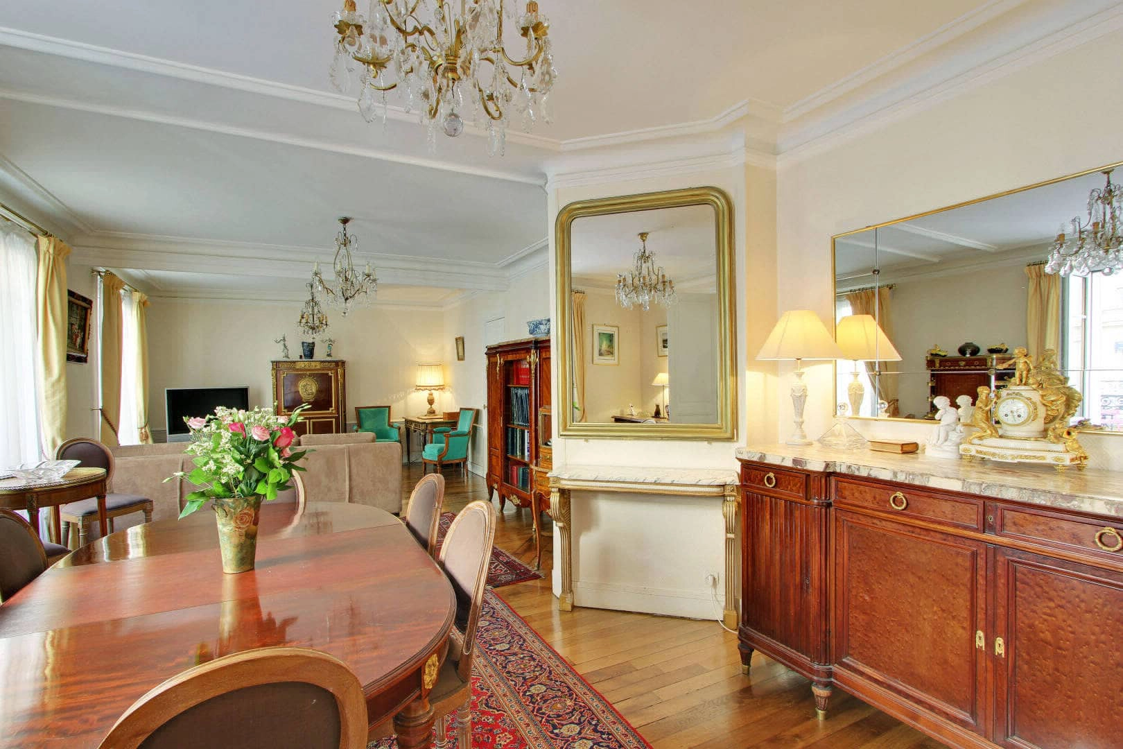 Supporters of the Chateau de Versailles and lovers of the furnishings of the 18th and 19th centuries, the flat owner chose several pieces of furniture that stand out in this space as a testament to his admiration - including a Louis XVI secretary, a copy of furniture from the Wallace collection in London and a Louis XV dresser with ornate marquetry. The apartment remains inviting, calm, and discreet. Bright colours, beautiful artwork and original pieces of furniture both modern and classical, come together harmoniously.