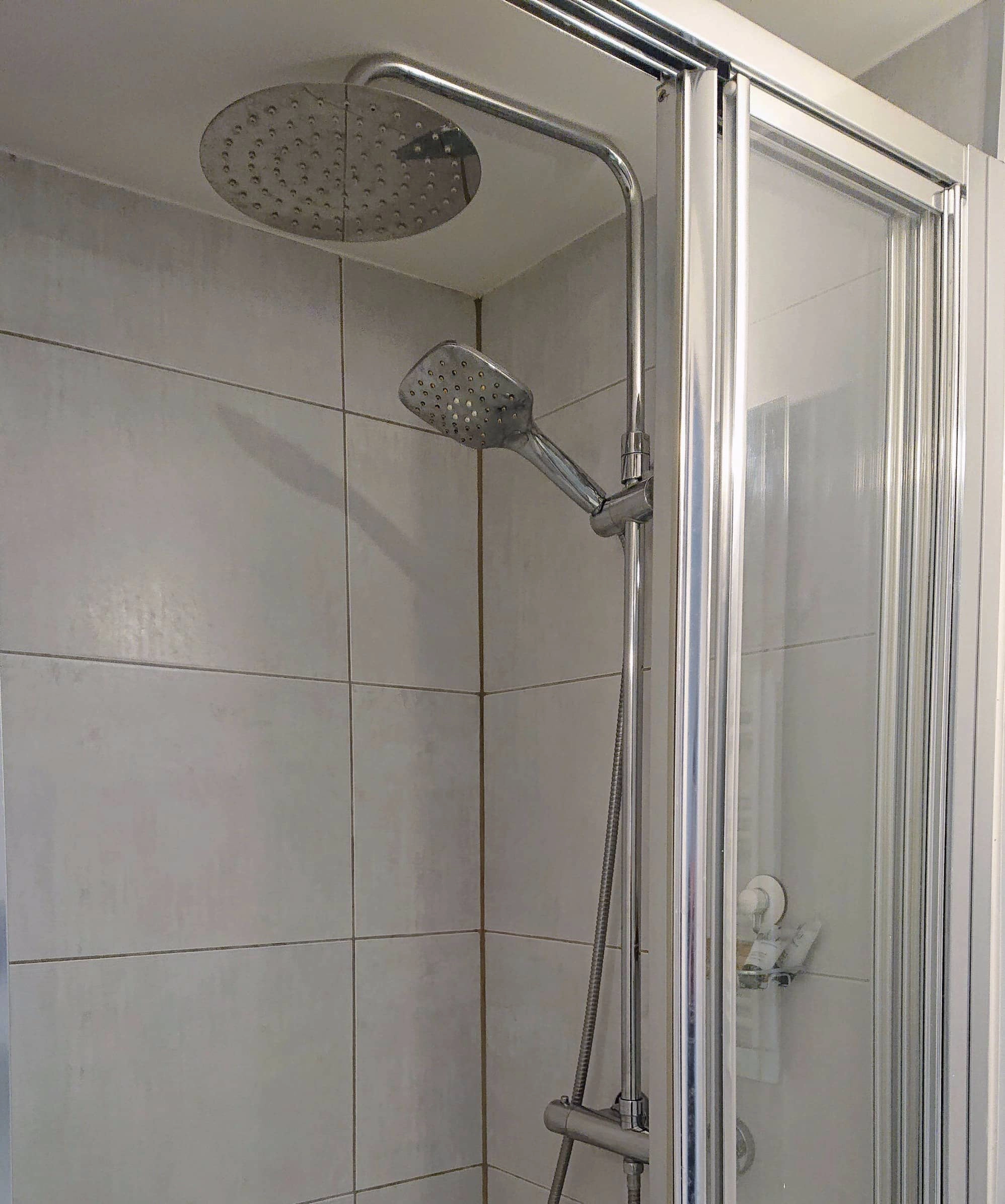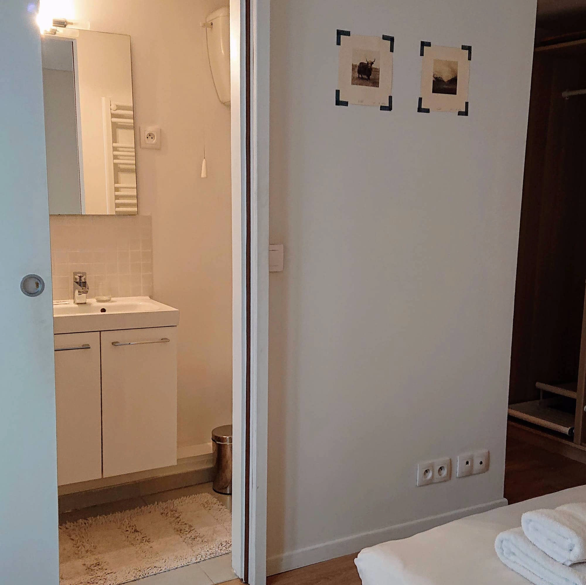 The bright window makes it a pleasure to wake up in this room and the perfect place to go to bed at night. The toilet and shower are located off the bedroom in the room shown on the left. There is also a towel warmer in the bathroom. The shower cabin as an overhead shower as well as a handheld one.