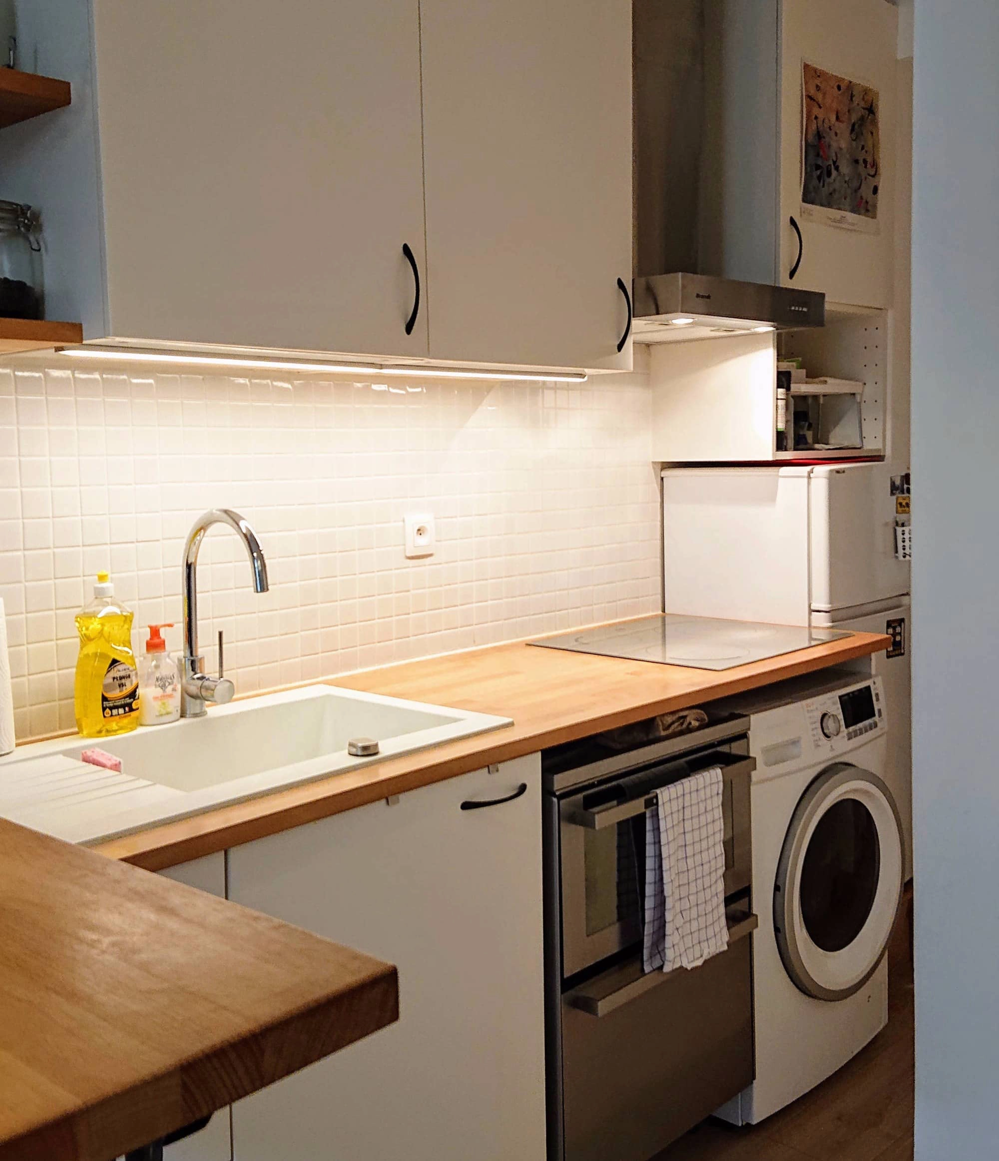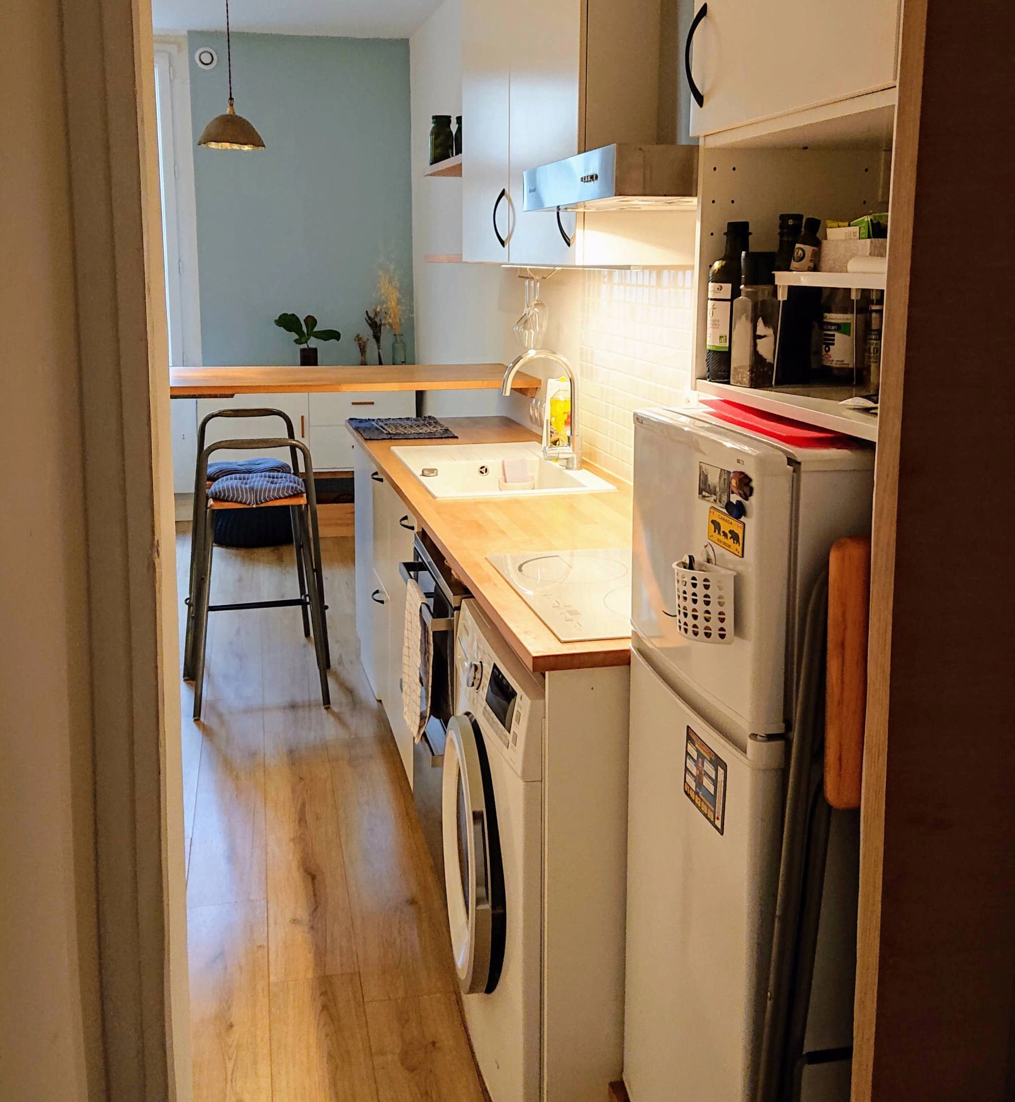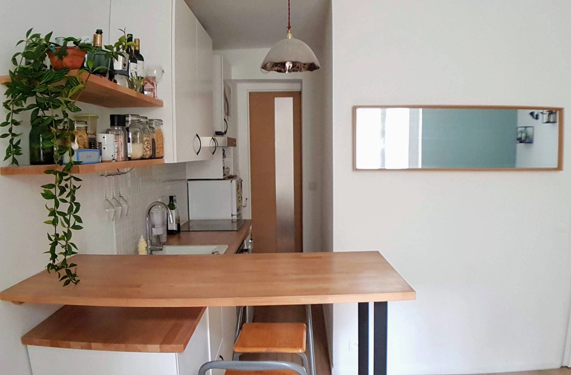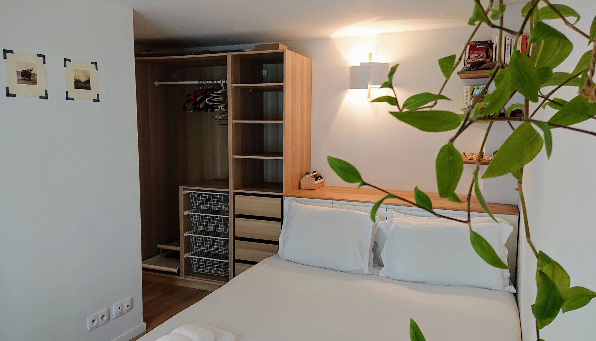 The dining bar is conveniently beside the kitchen counter. The owners enjoy cooking with fresh ingredients they purchase on the rue de Levis market street. There are many amenities such as a combination washer/dryer, dishwasher, oven, stovetop and more. The bedroom and bathroom are located through a sliding door at the end of the corridor where the kitchen is. There is a queen sized bed in the room along with a lot of closet space - very rare in Paris!