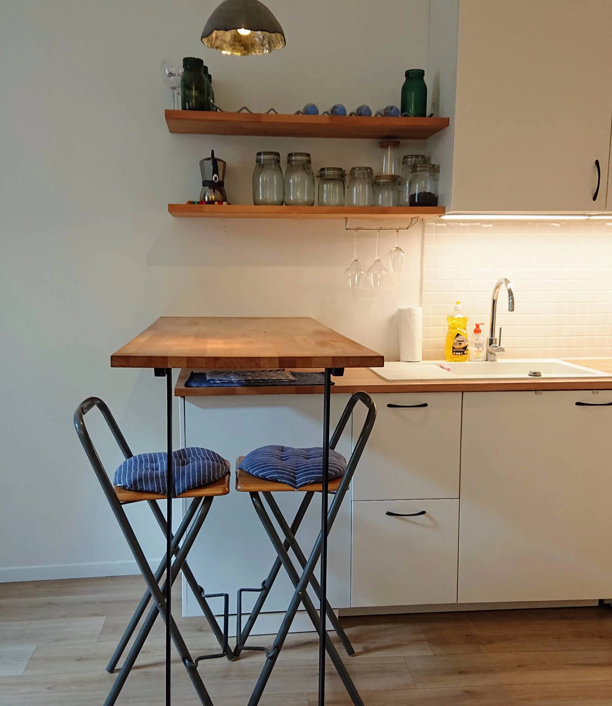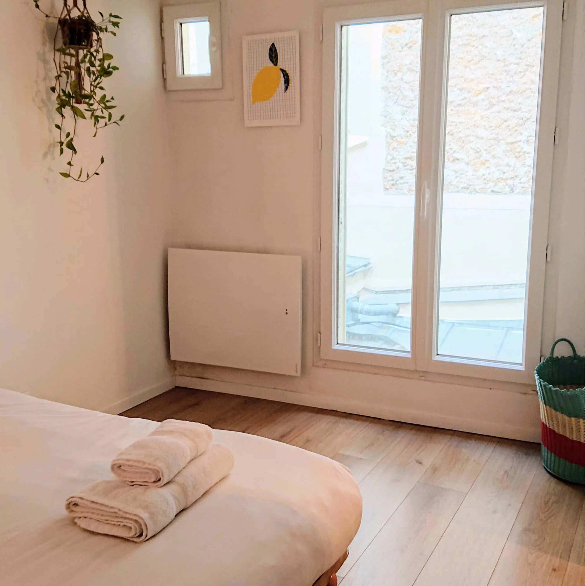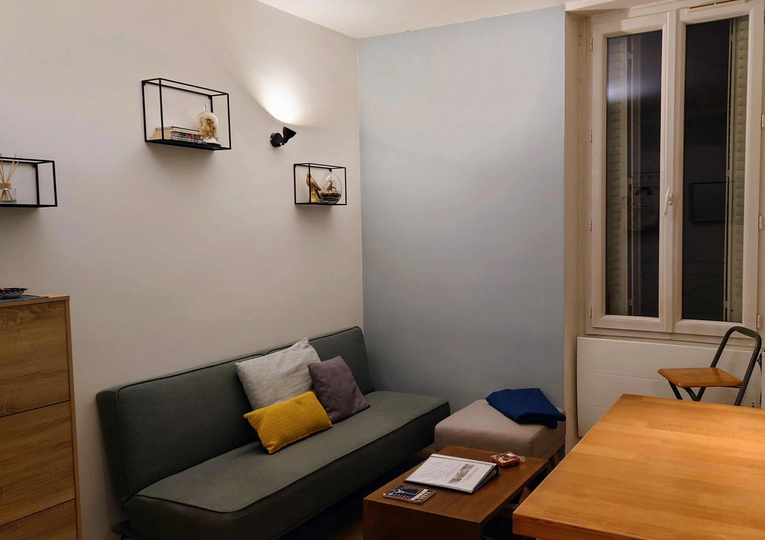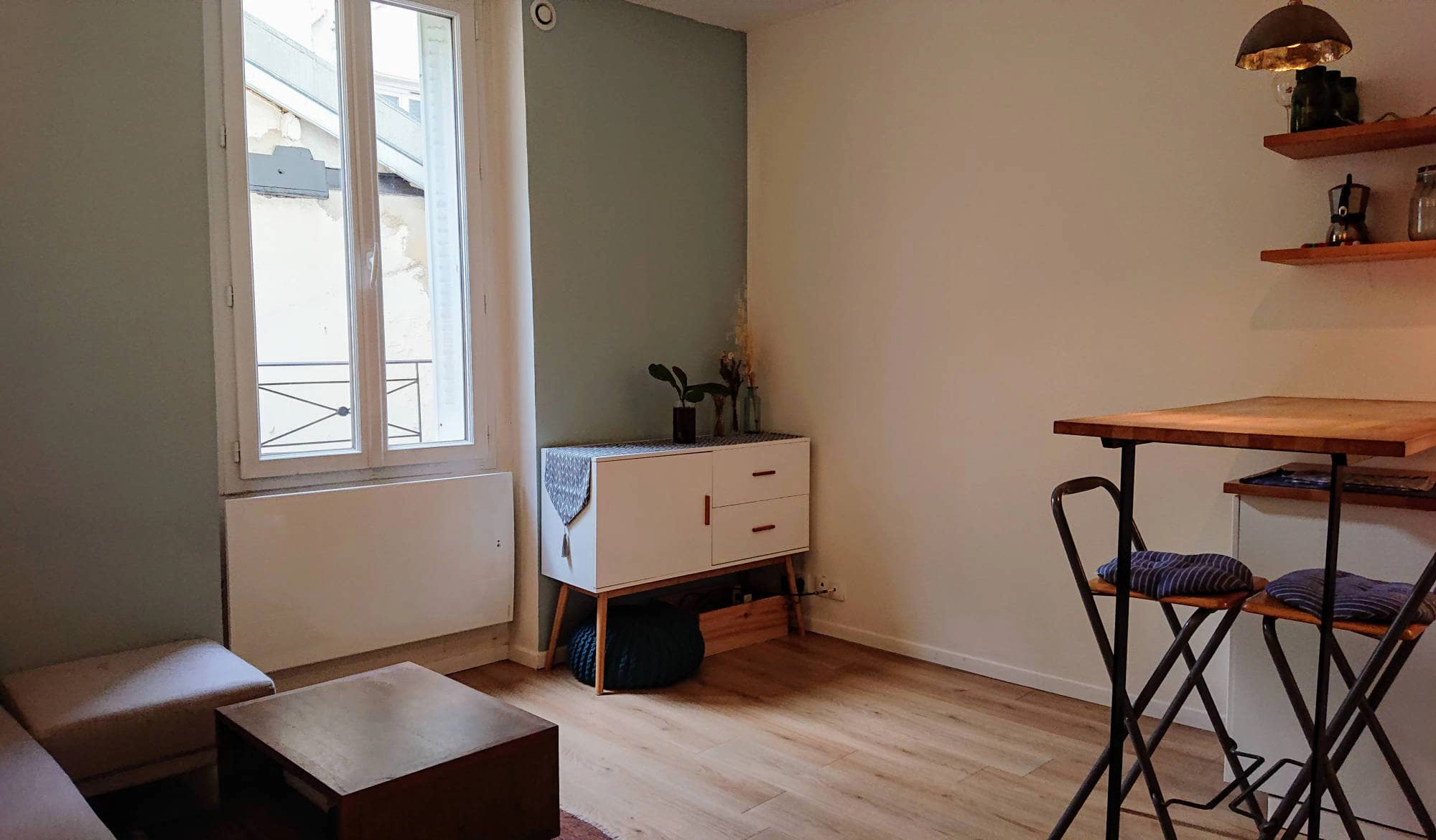 The open concept living area is very comfortable and inviting. Your apartment is located on a quiet inner courtyard. There is a desk area which could be used as a perfect spot to set up your computer should you need to work. The window in the salon has external shutters should you wish to have more privacy.