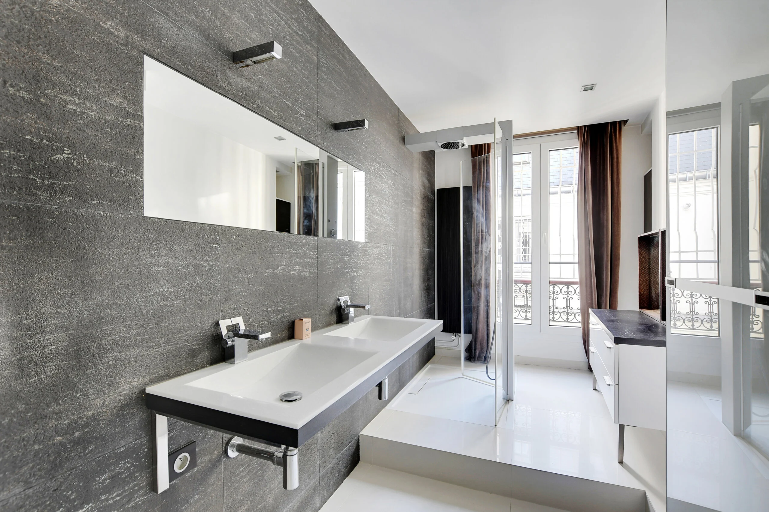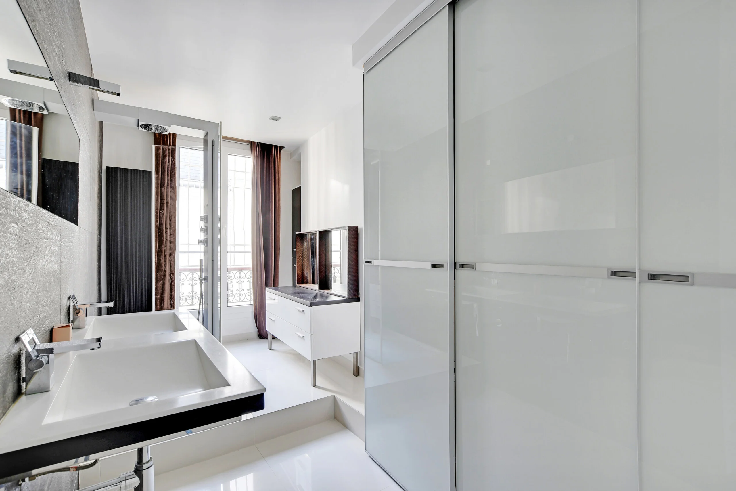 The main sleeping quarters are off to one side of the apartment. The owners’ suite features a large, spacious bathroom with a luxurious shower, double sinks, and ample storage space. Please note that there is no toilet in this bathroom. The second bedroom offers large closets as well.
