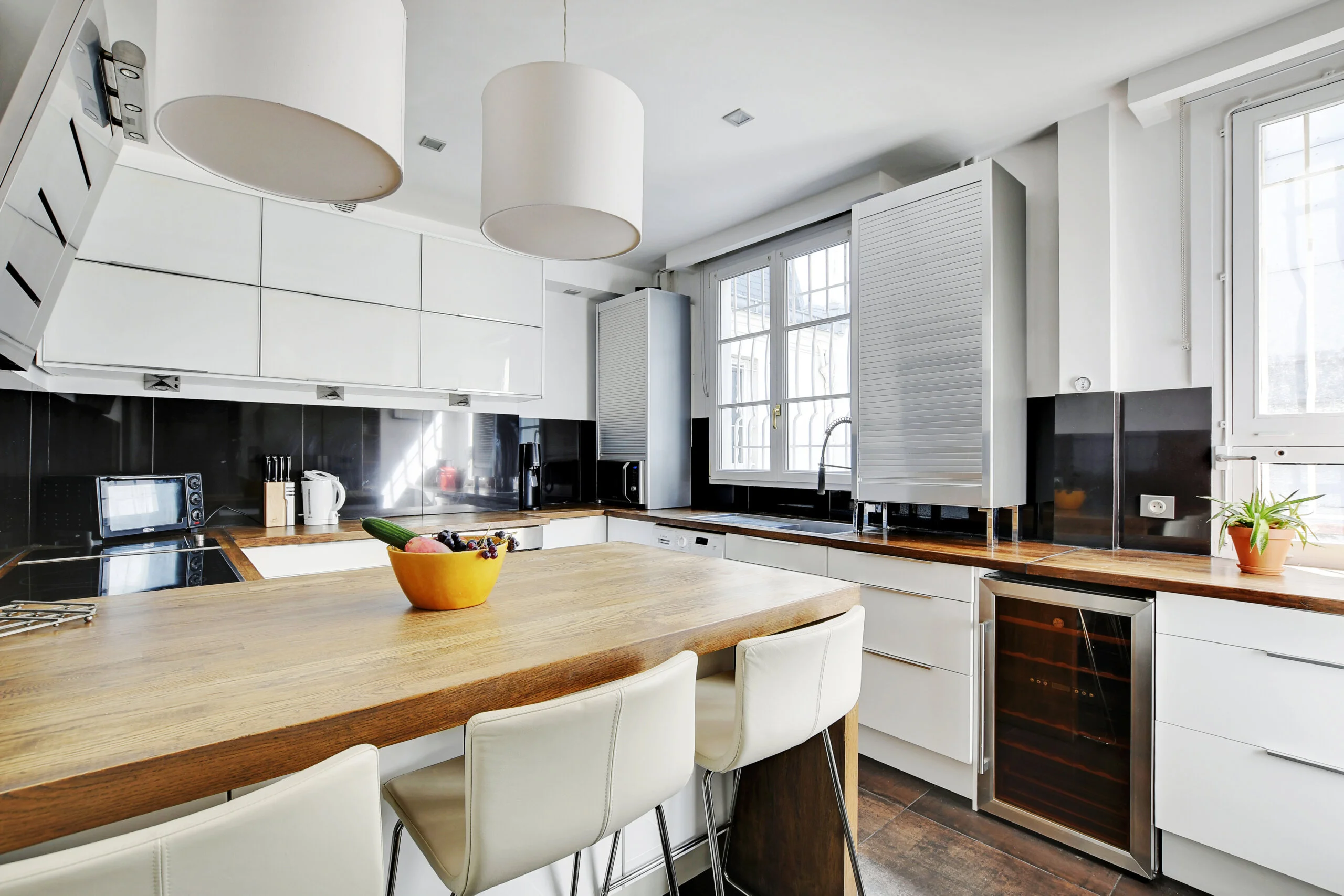 The extra-spacious kitchen is complete with all modern amenities, including a wine fridge. You will be impressed by the space you have to prepare your meals. The large bar sits three people, to sit and have a morning coffee or sip a glass of wine while watching food preparations.