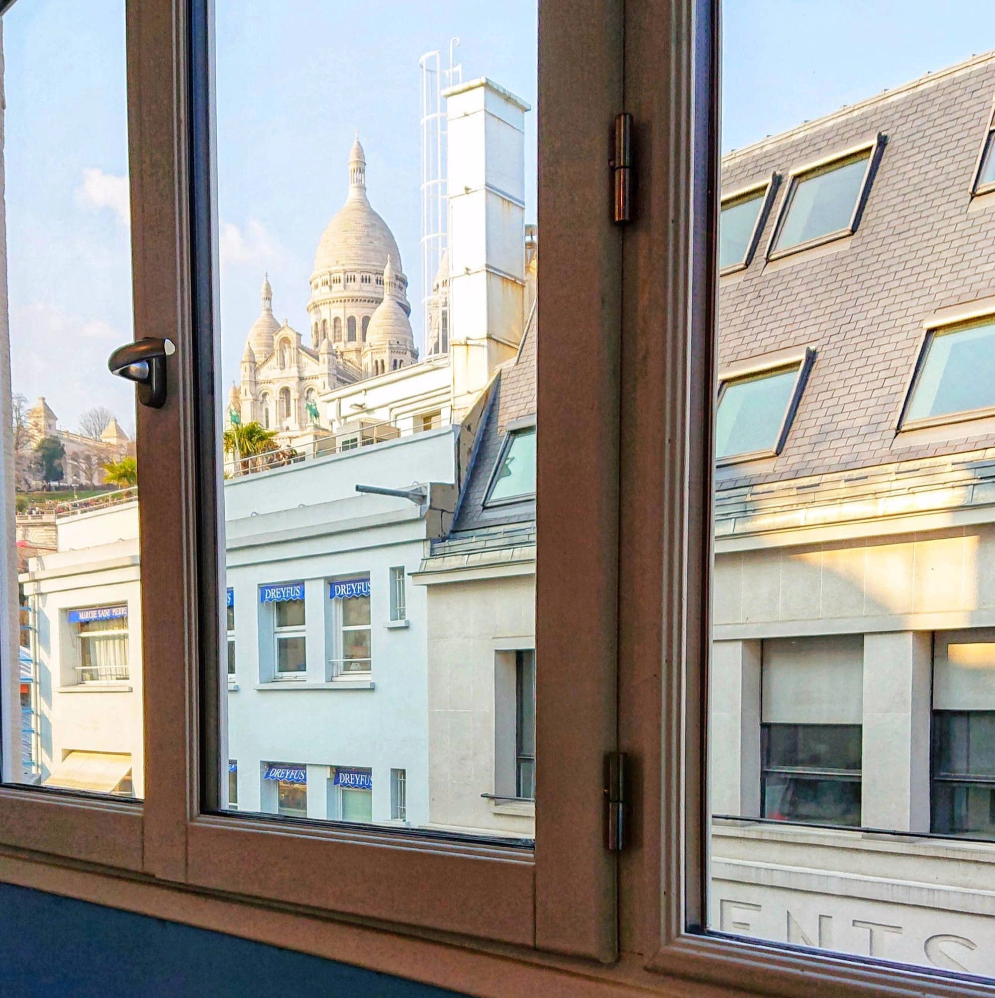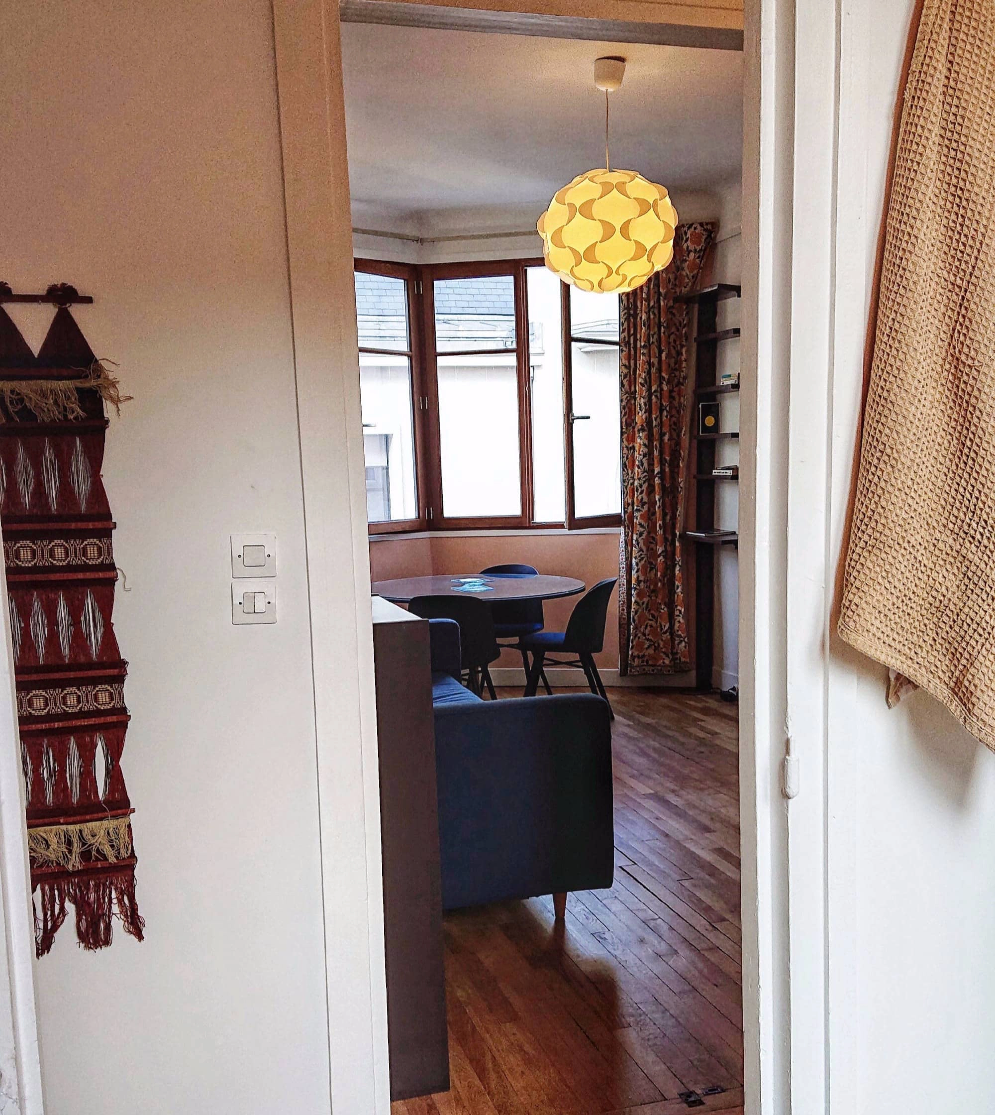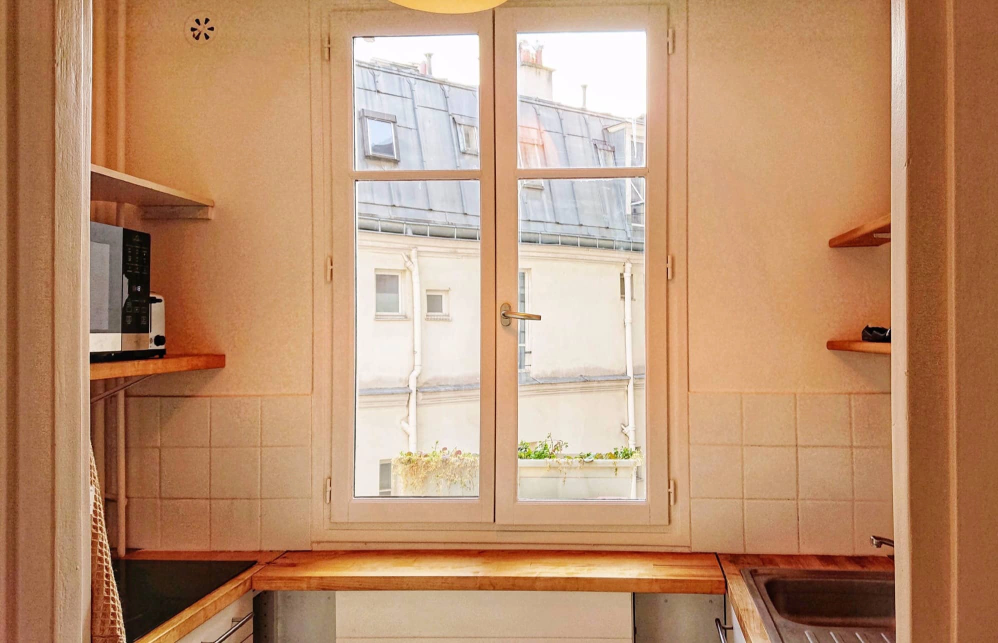 With parquet floors, simple decoration and windows in every room, the apartment is bright and welcoming even in the dullest weather. When you enter the flat, the kitchen is immediately to your right and salon to your left. There is a door at the end of the hallway that leads to the bedroom and, just before this door is the bathroom. The living area has a comfortable sofa bed which can sleep two people if you have guests visiting you. There is a comfortable dining table with seating for four - pick a seat by the window so you can gaze out at Sacre-Coeur!