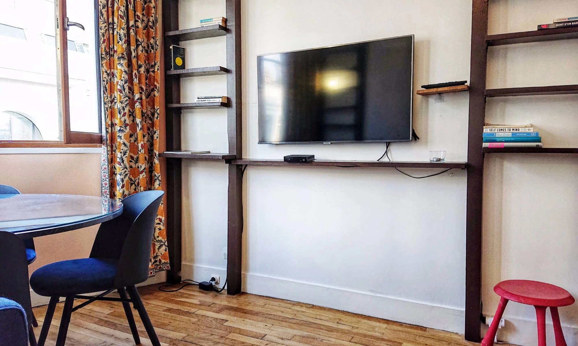 There is also a wall-mounted, Smart television. The compact kitchen is equipped with combination microwave-oven, induction stove, dishwasher, fridge, electric kettle, toaster, coffee maker and more. The large bedroom has a double bed that lifts up with storage underneath. There is also a desk and chair should you need to work. It may be difficult though as you could end up staring out of the window at Sacre-Coeur. The toilet is in the bathroom which also has a tub, handheld shower, sink and a washing machine. There are plenty of cupboards in here for storage. You could hardly have a more perfect Parisian location.
