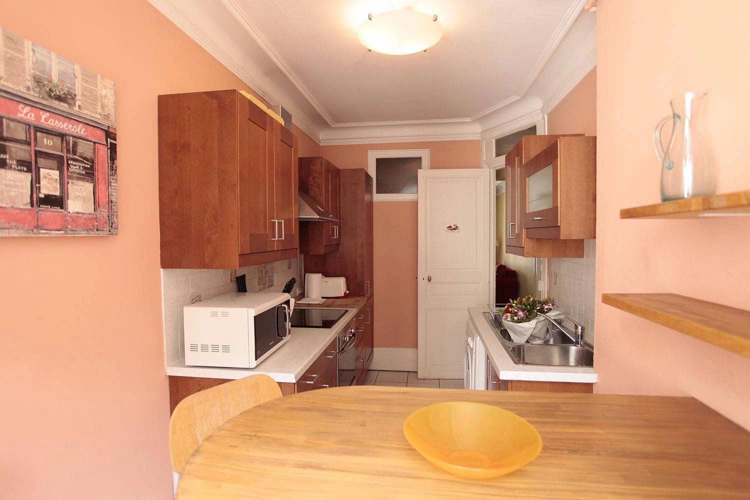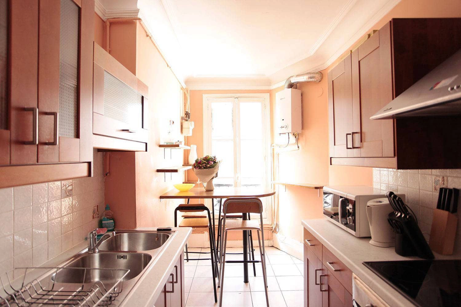 The kitchen window looks onto the courtyard of the building so it is a very peaceful spot to enjoy your morning coffee and croissants. With windows on both sides of your Paris furnished let, you are guaranteed a constant stream of light in the day. The bathroom is equipped with a modern shower and bathtub. There is also a window in this room to allow for ventilation on those days where you feel like relaxing with a steamy shower or bath. As with most places in the city, your Paris furnished apartment has the toilet in a separate room.