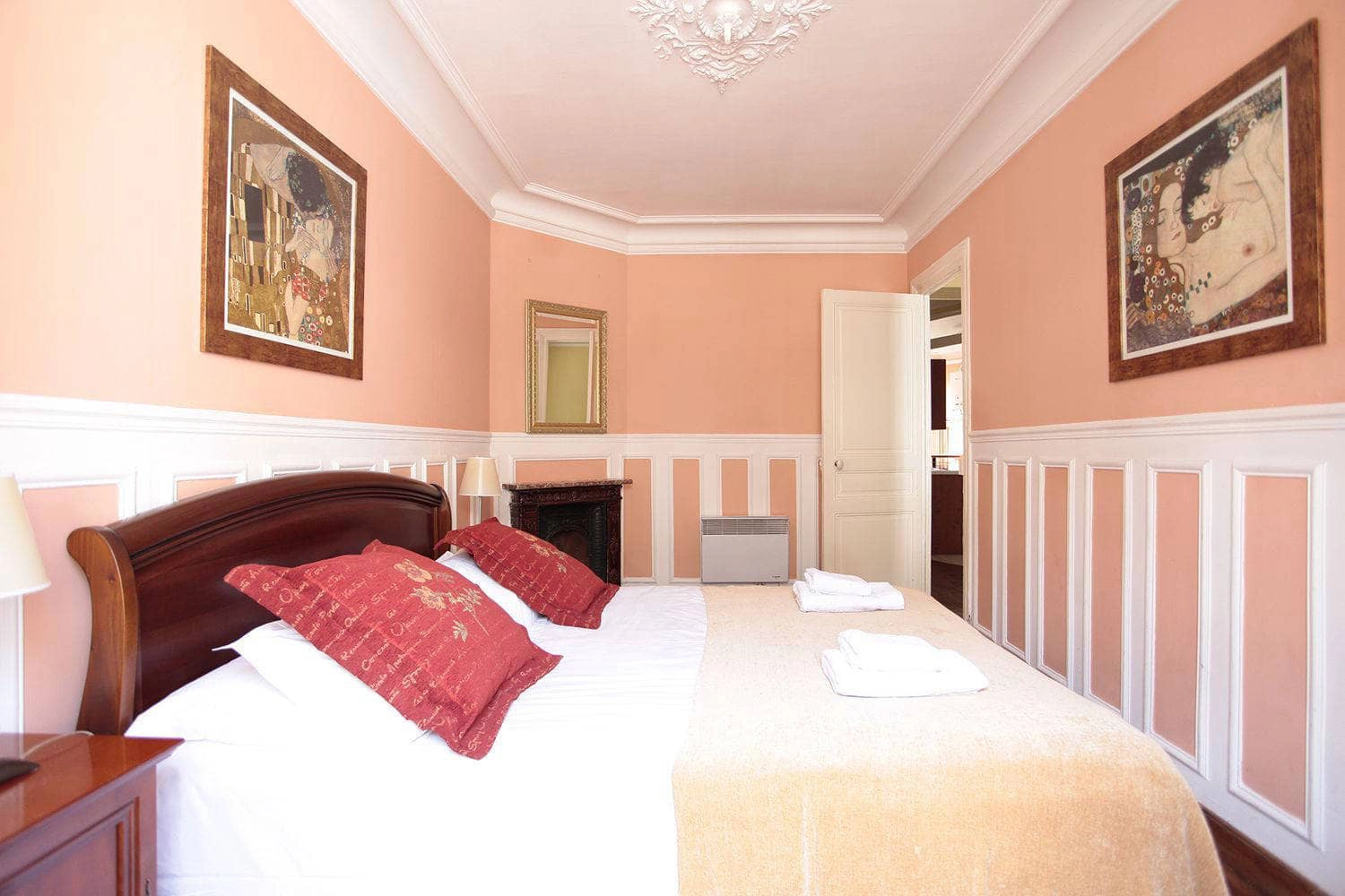 The master bedroom has an original, antique marble fireplace to give you an extra cosy feeling. The large window allows you to wake up to the warmth of the sun. The bedding provided is quality linen directly from our professional cleaning service. Heating in this apartment is electric. There is a heater in the bedroom to make sure you wake up toasty warm as well as one in the living room. The bed features convenient drawers below the mattress to store your personal belongings. You may also store things in the bedside tables, as each is equipped with shelves and drawers.