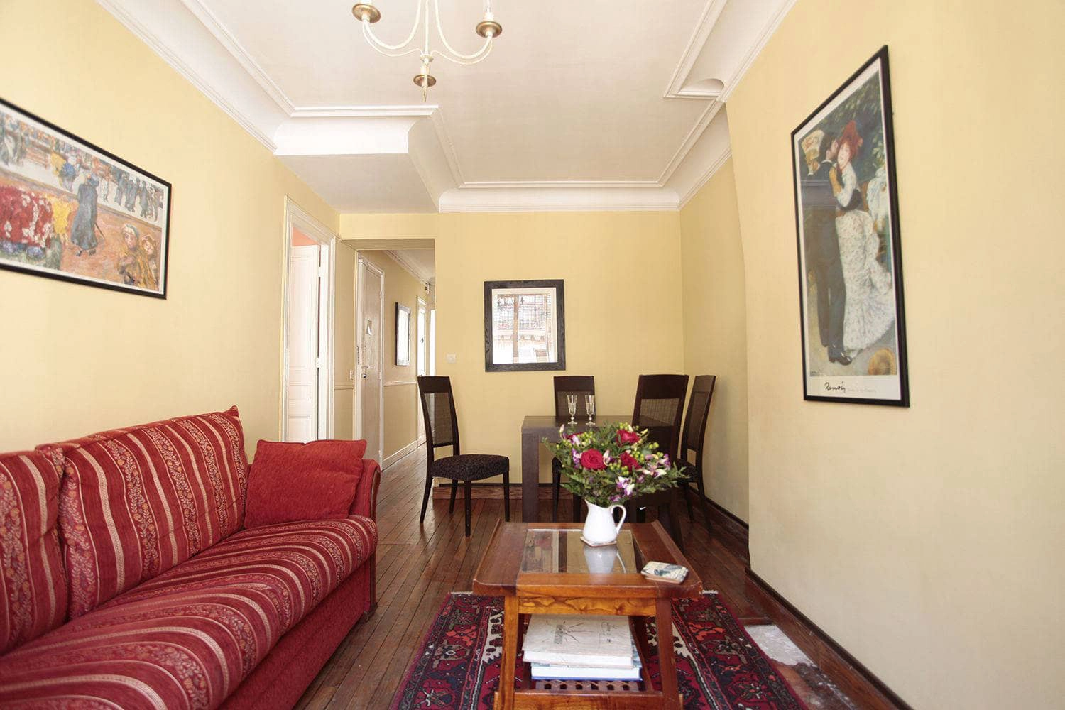 The flooring is the original parquet throughout apart from the bathroom - this room has original ceramic tiles, adding to the charm of this Parisian classic. When you walk into this Paris furnished apartment, the main living area and the bedroom are to your right with the bathroom, toilet and kitchen to your left. The living room area has a table with four chairs. There is modern sofa that converts to a double sized bed, comfortable enough to sleep two adults and a reading chairs sits in the corner by the window.