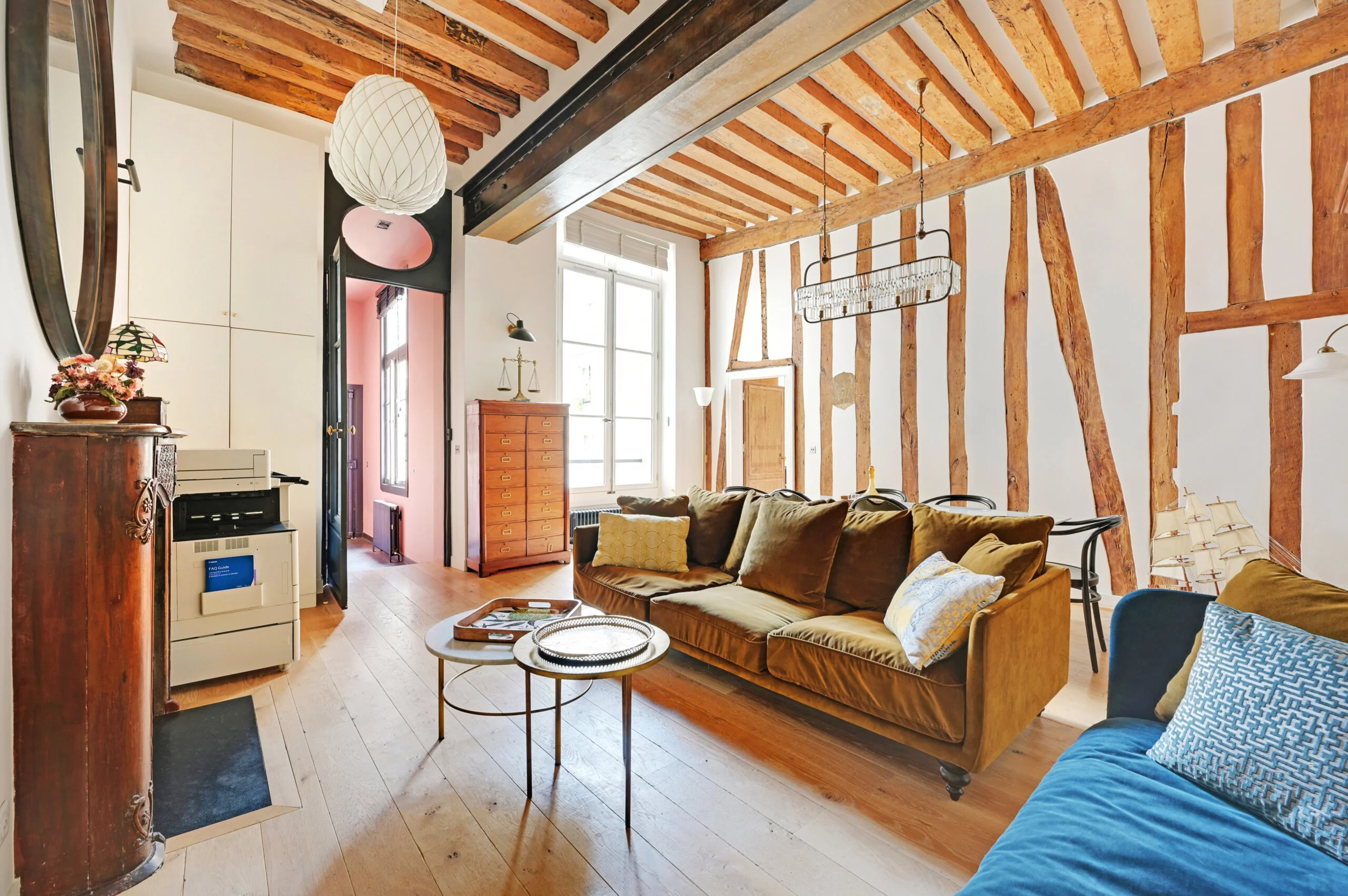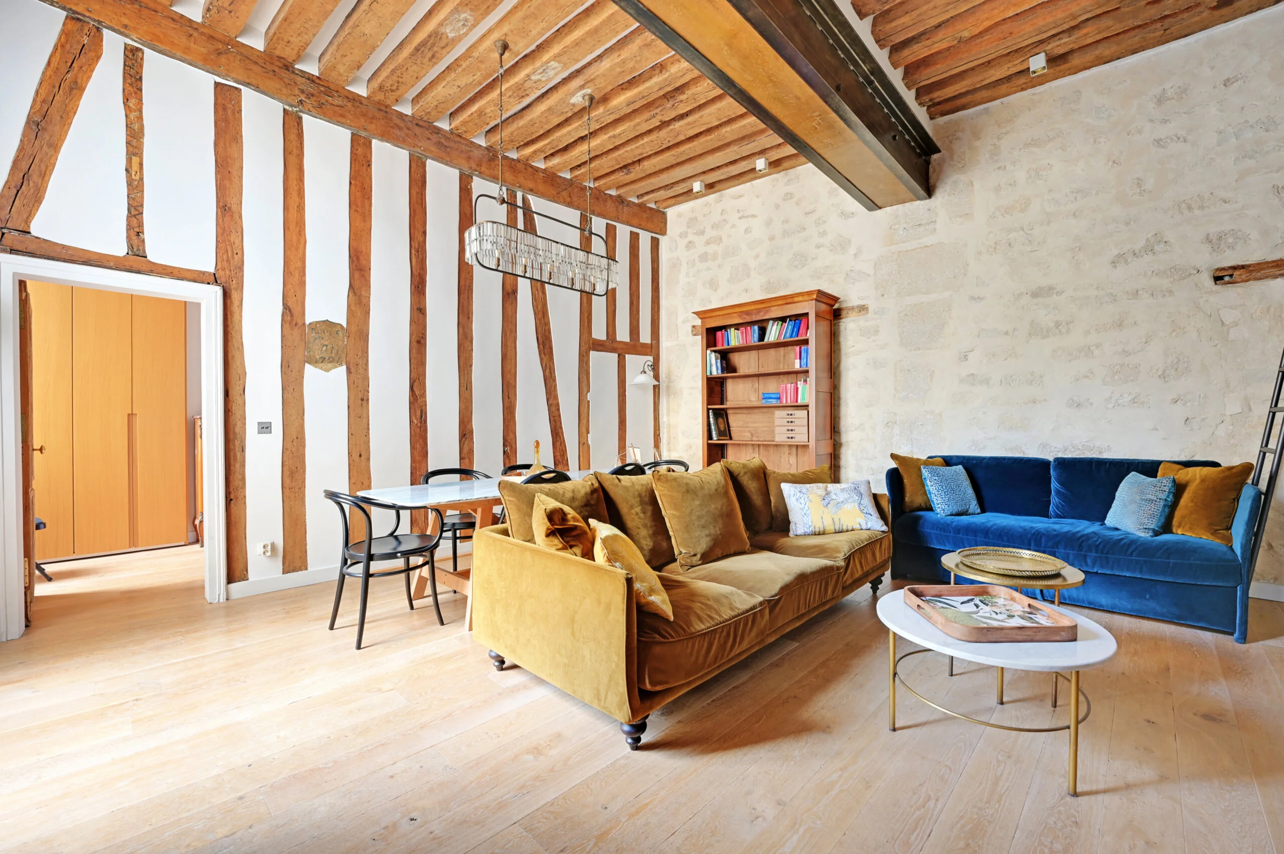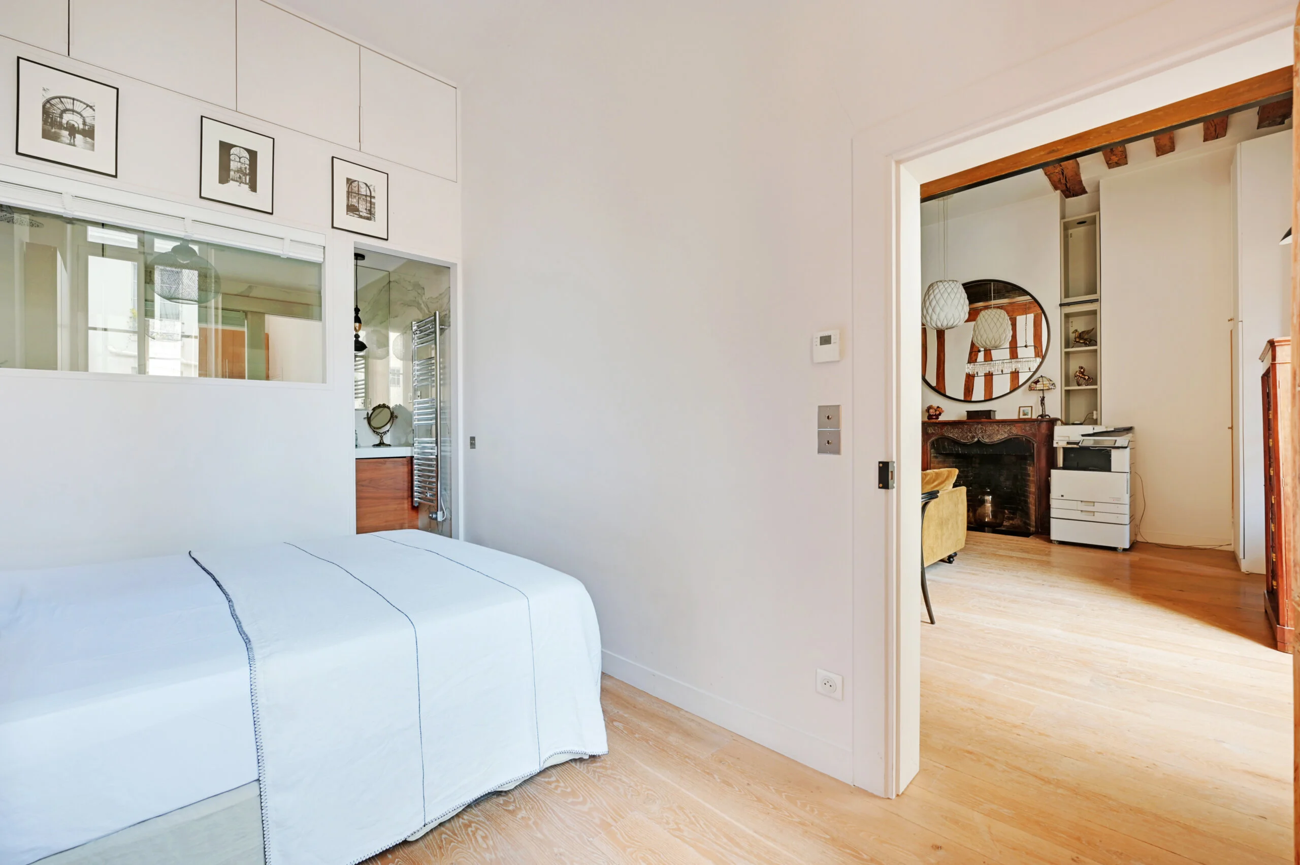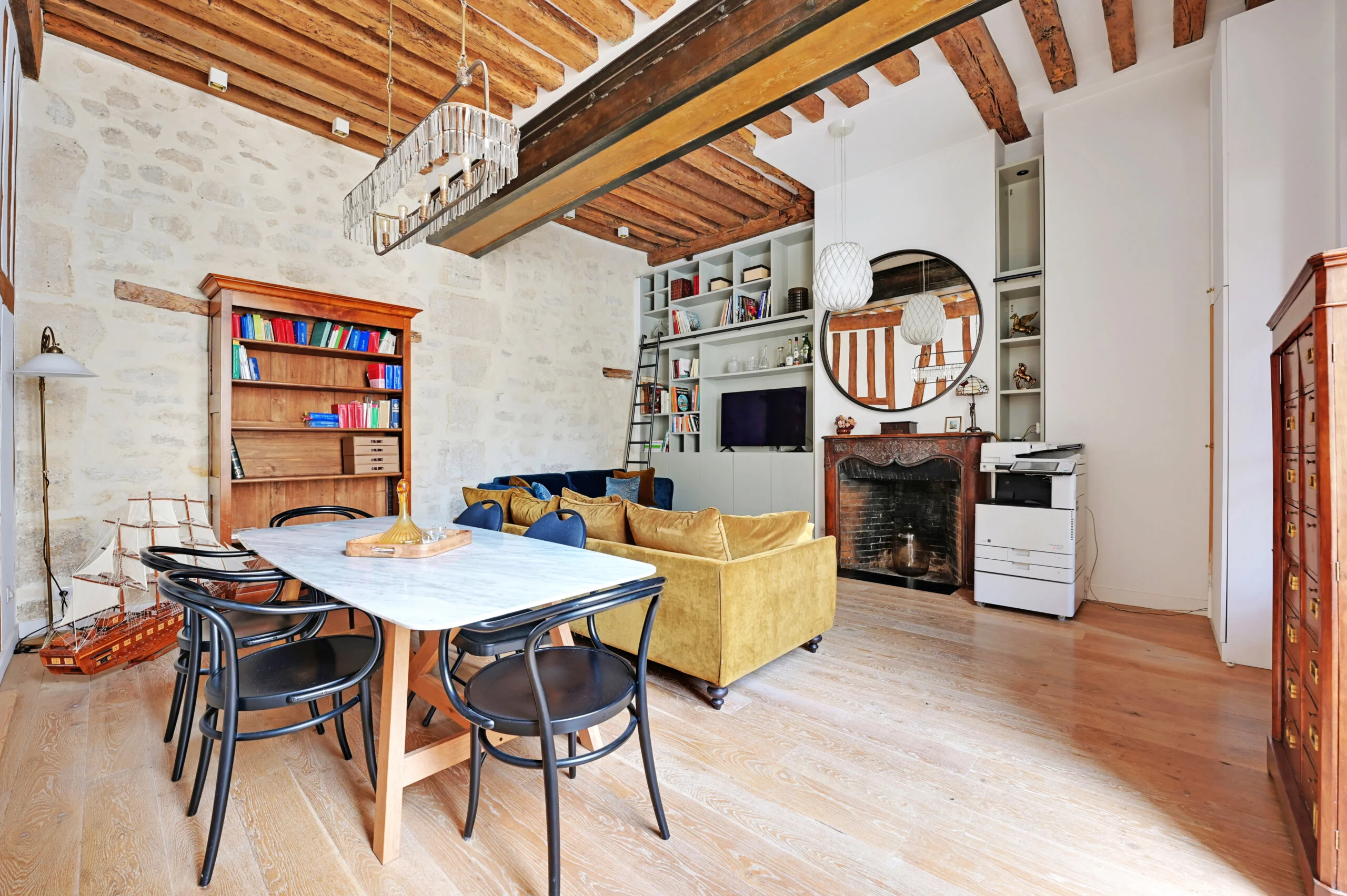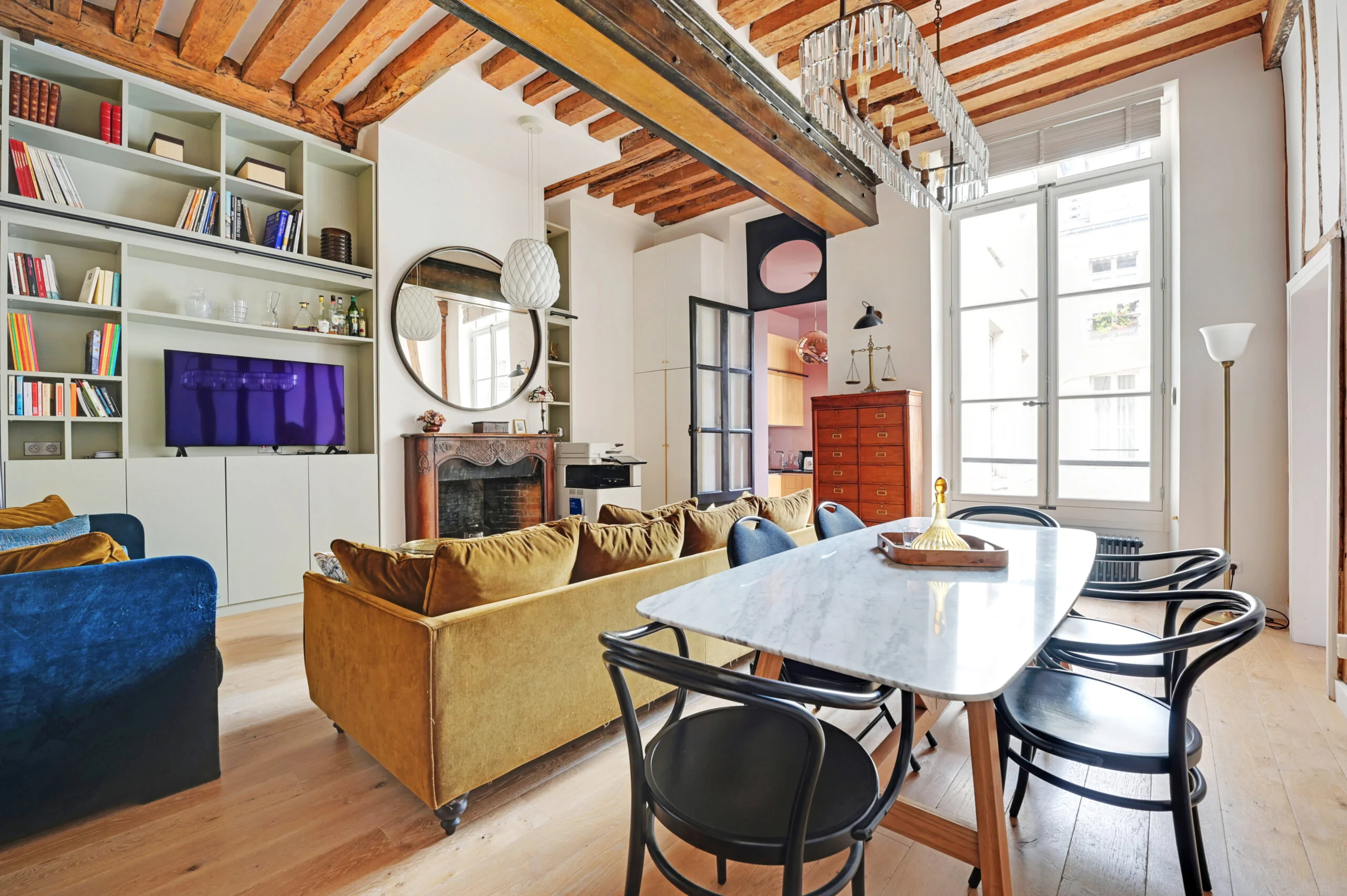 After pushing a 17th century door-cochère overlooking the prestigious rue Saint Louis en l'Ile, you cross a green, paved courtyard before climbing a large staircase to access the second floor where awaits the 57m2 apartment, completely restored by an architect, and benefiting in the living room of a ceiling height of almost four meters.