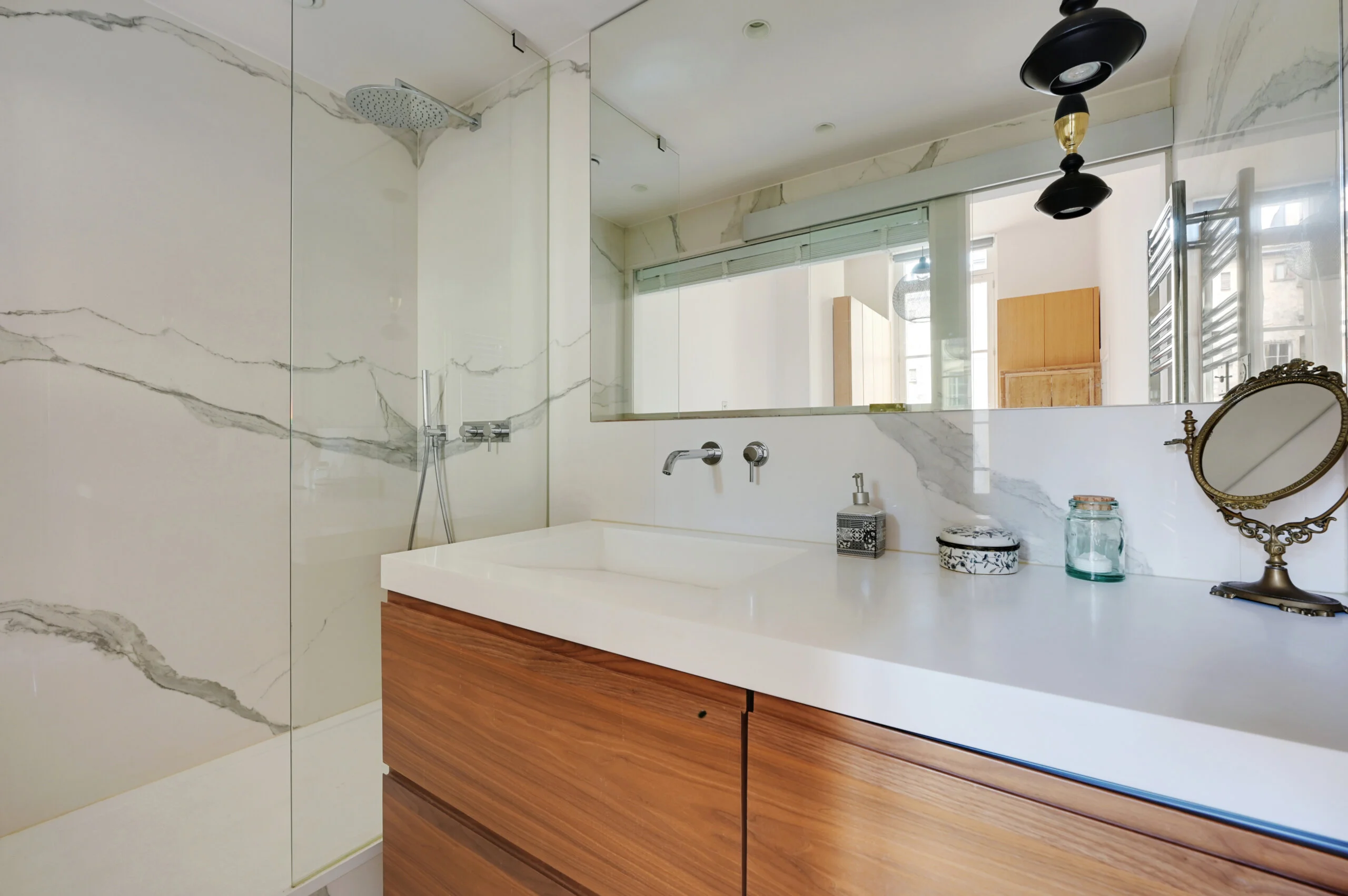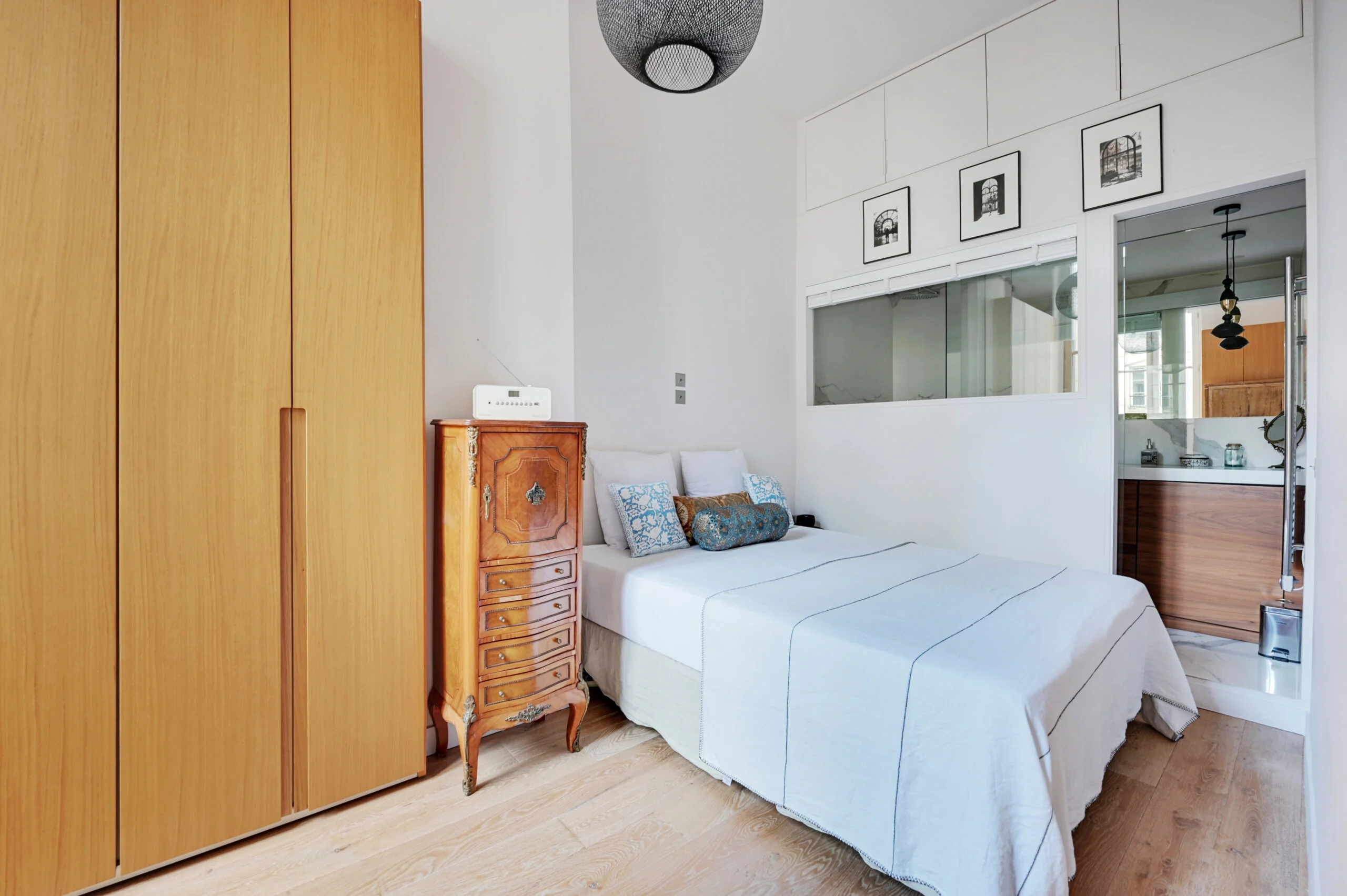 Escape to the bright, peaceful bedroom, separated from the living room, where a luxurious queen-sized bed awaits you, flanked by nightstands and ample storage space for your belongings. A Bluetooth speaker ensures your music accompanies you. The main shower room, adjoining to the bedroom and equipped with a large vanity unit incorporating a combination washer-dryer, offers comfort and convenience.