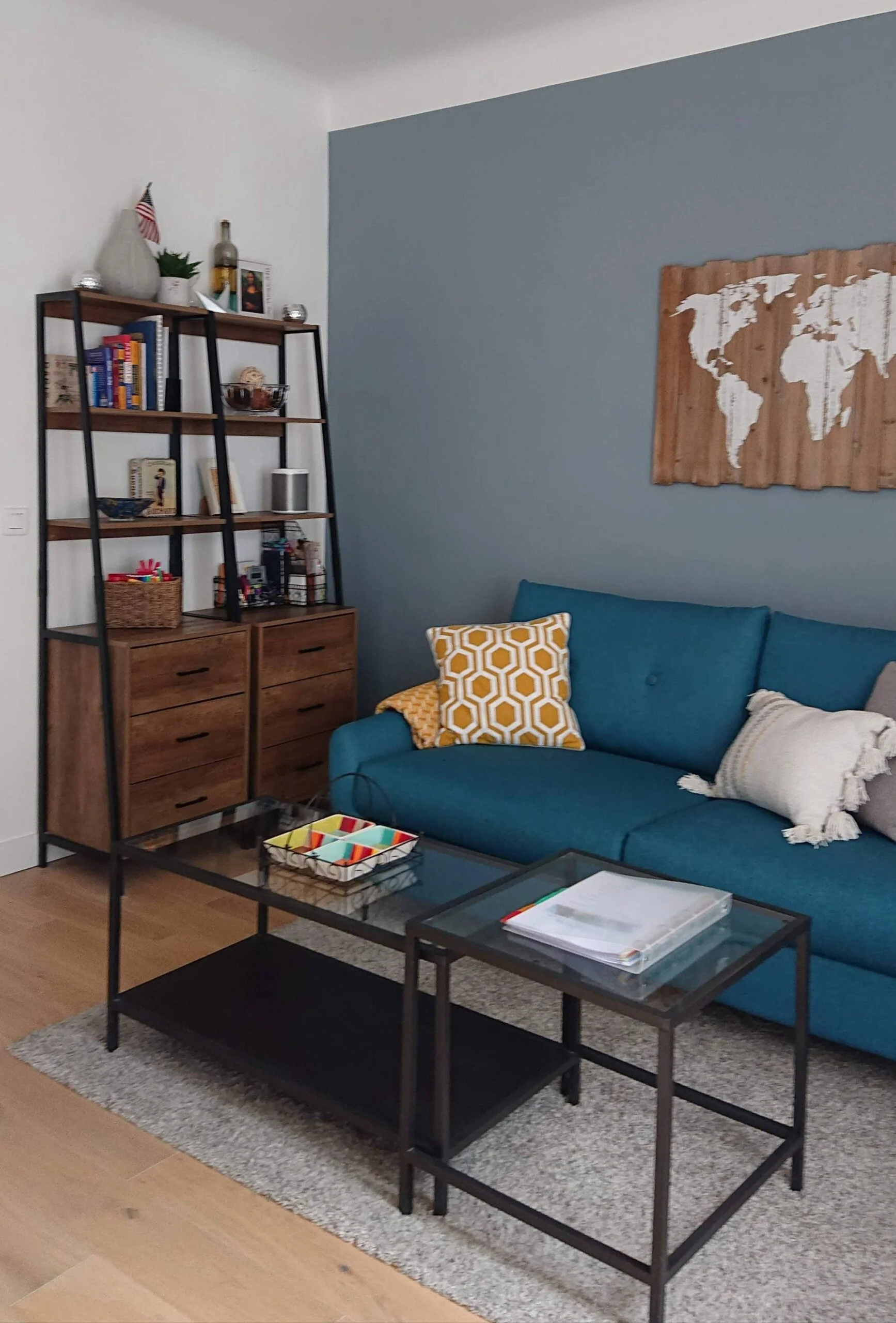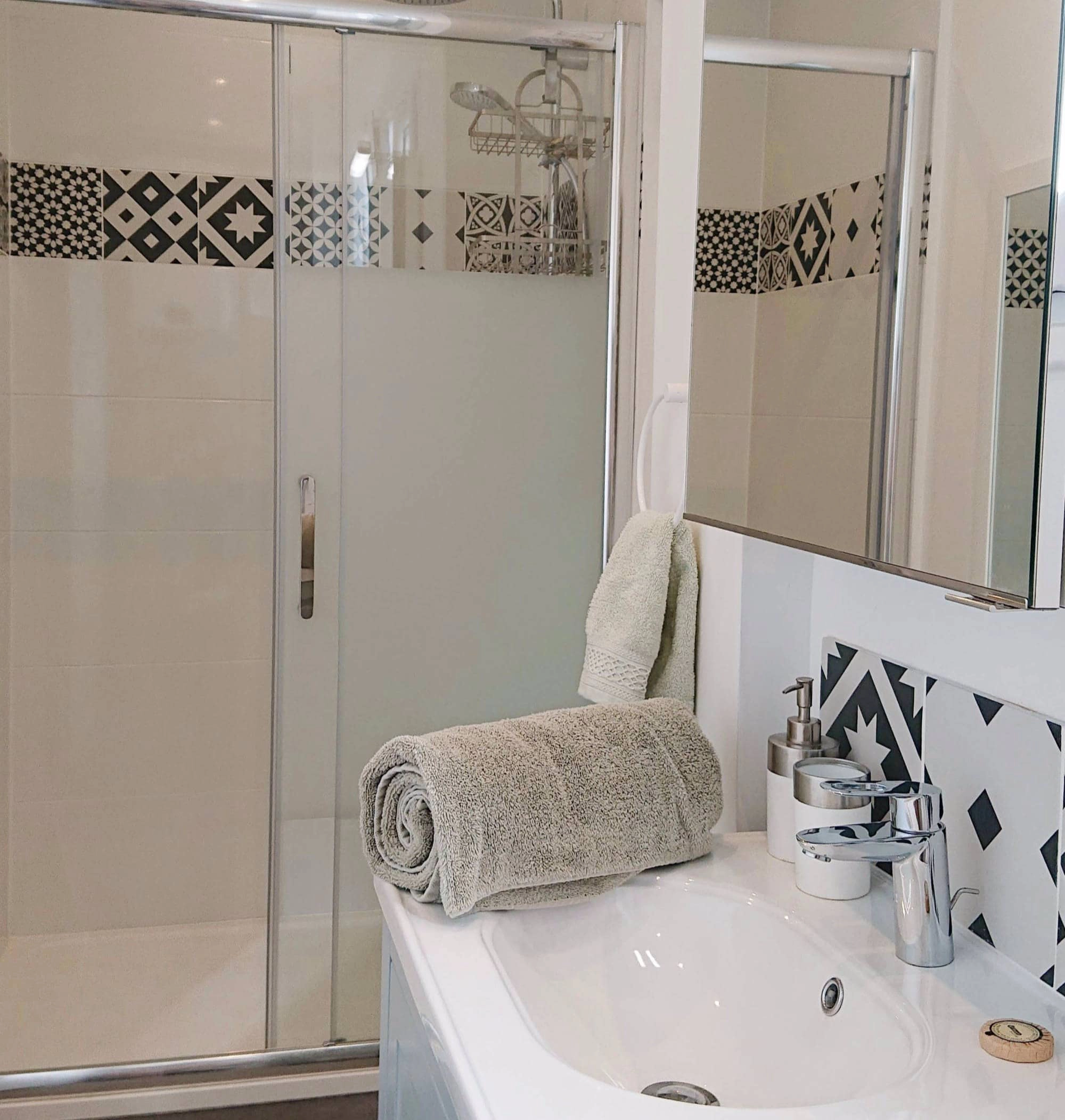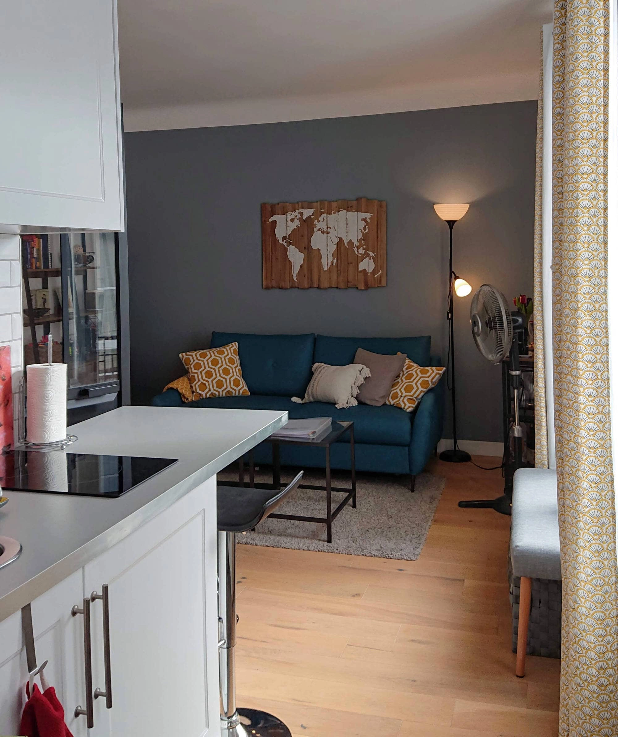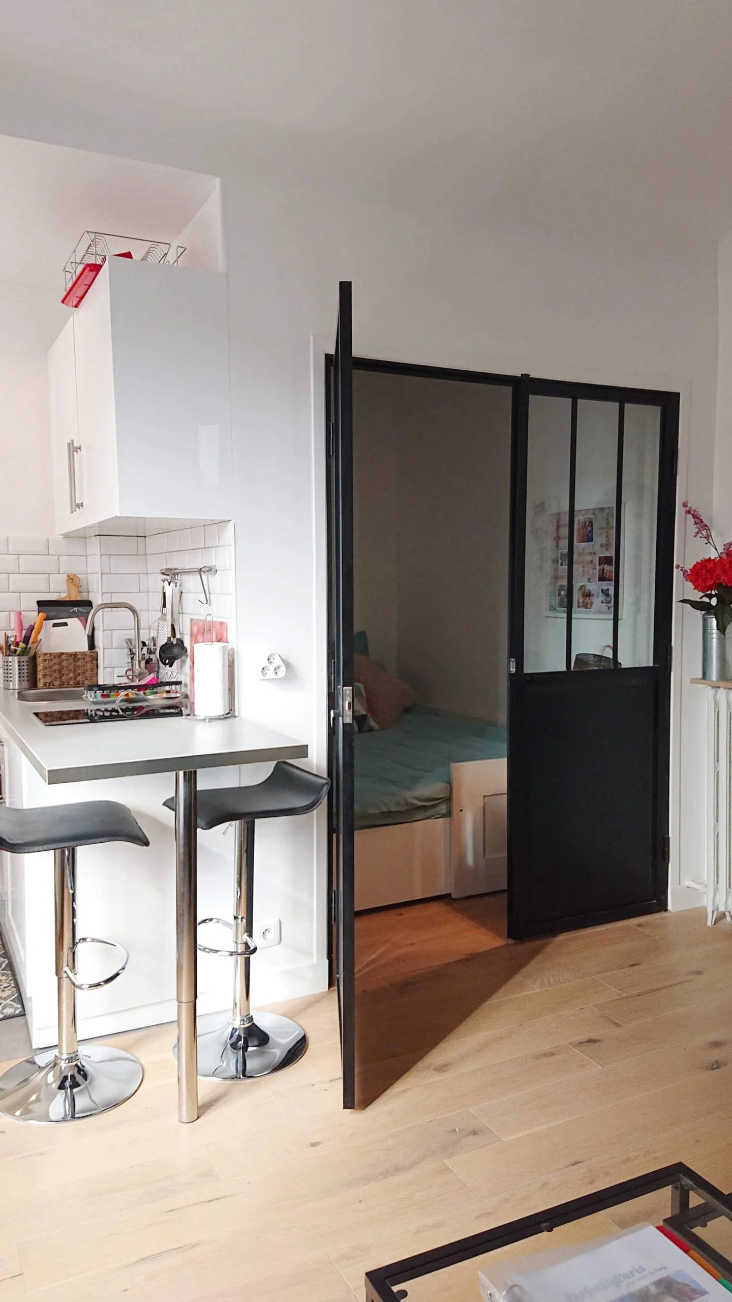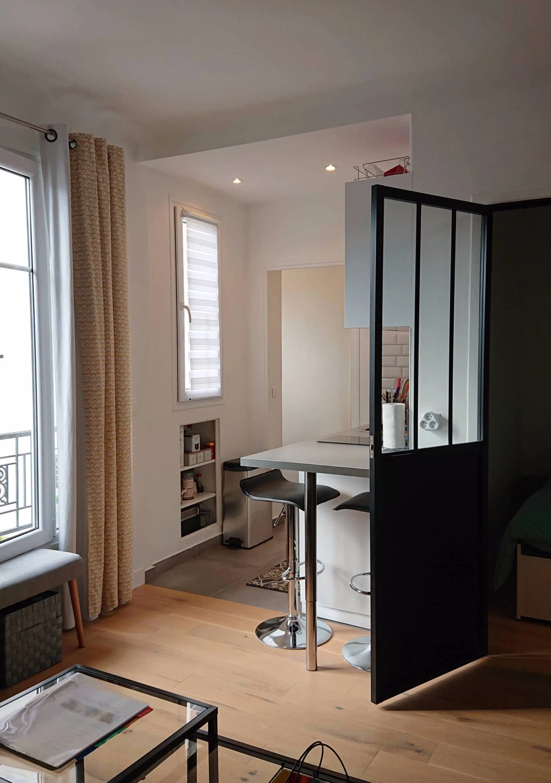 You then go through a second door to the living space, providing added insulation for your comfort and privacy. This cozy apartment makes wonderful use of space, and sleeps up to 4 people with an expandable trundle bed behind the black doors in the separate “coin nuit”, and sleep sofa in the living room. The kitchenette with seating for two at the bar has everything you need in your home away from home, including a stove top, mini fridge and freezer, and the bathroom features a large walk-in glass shower.