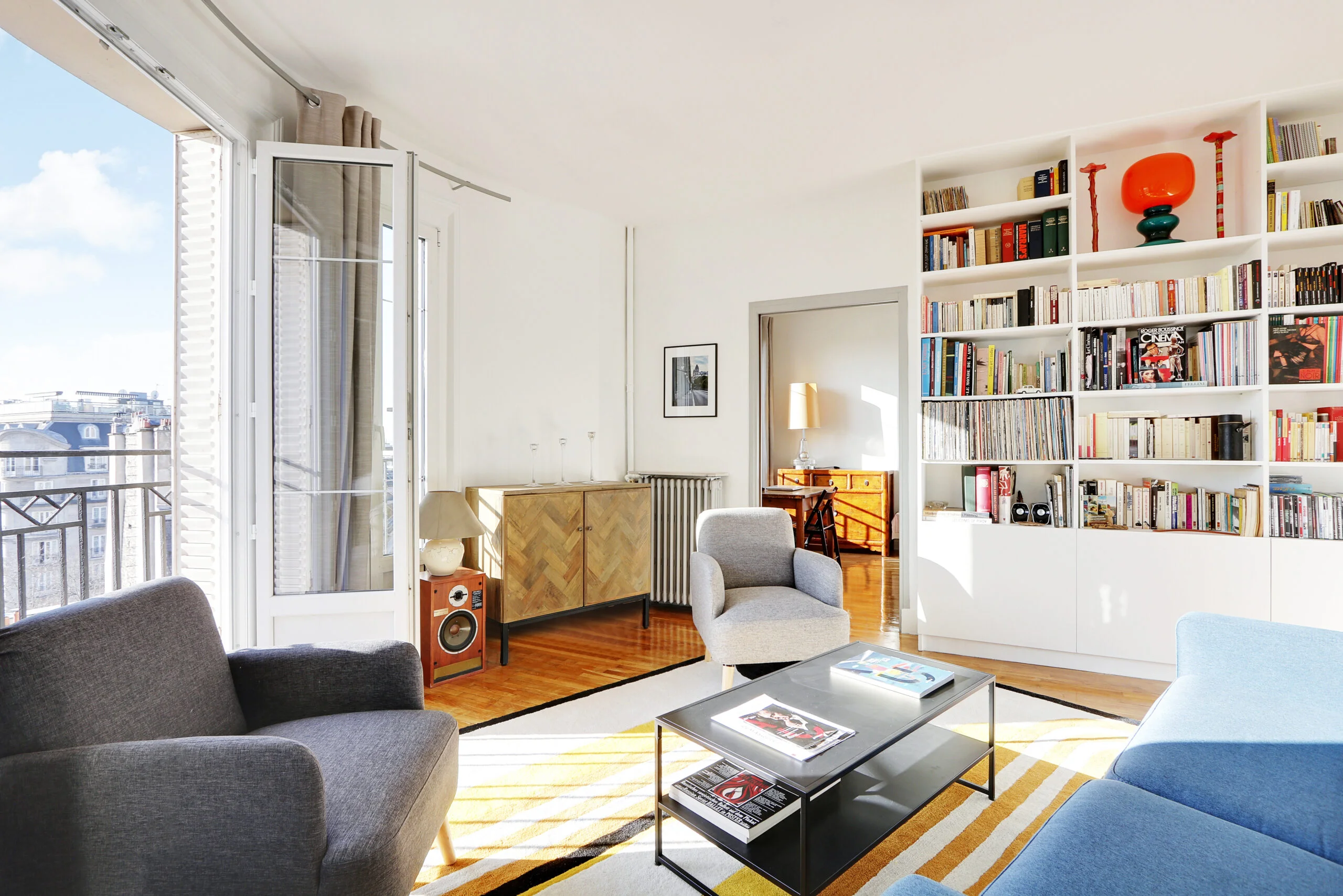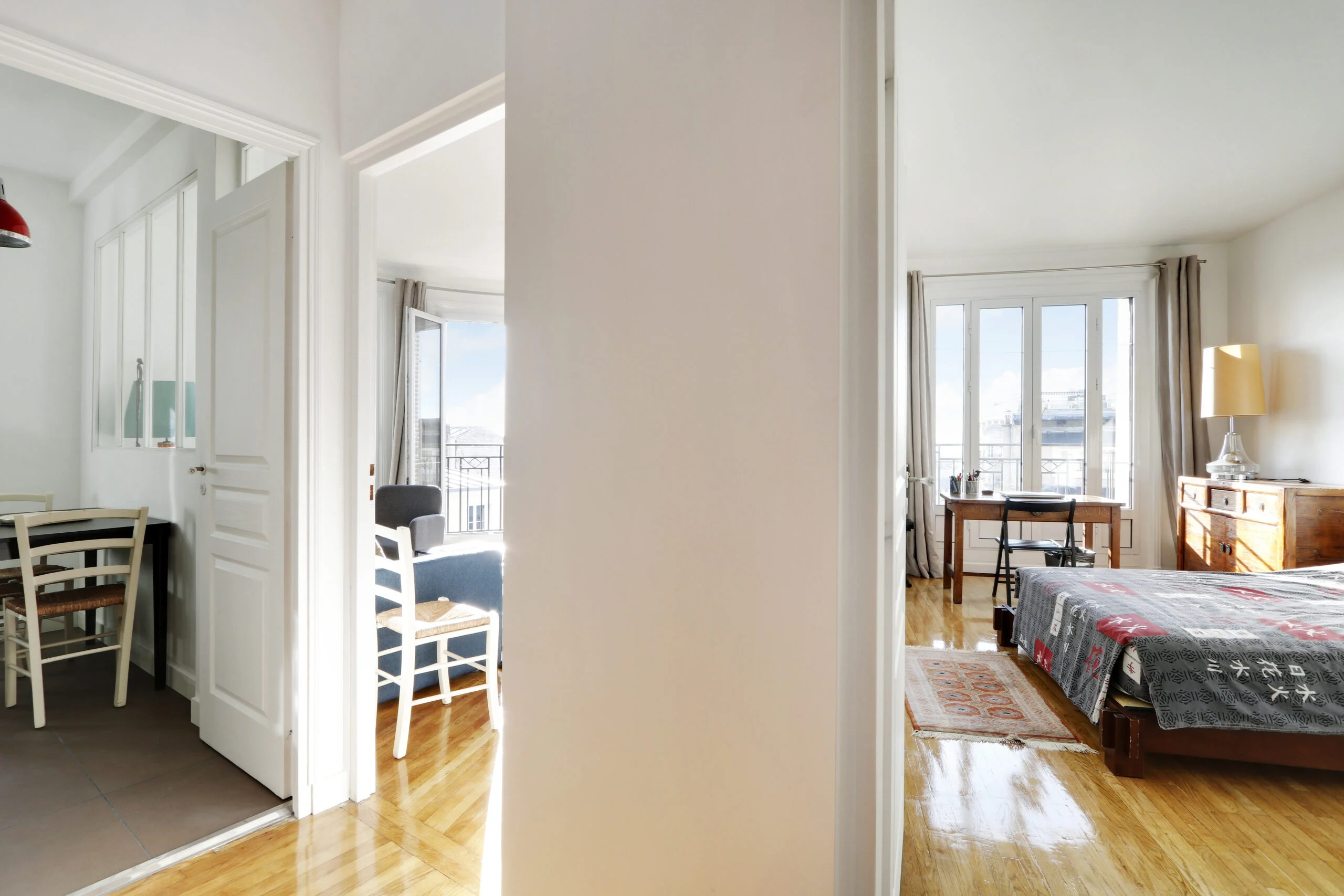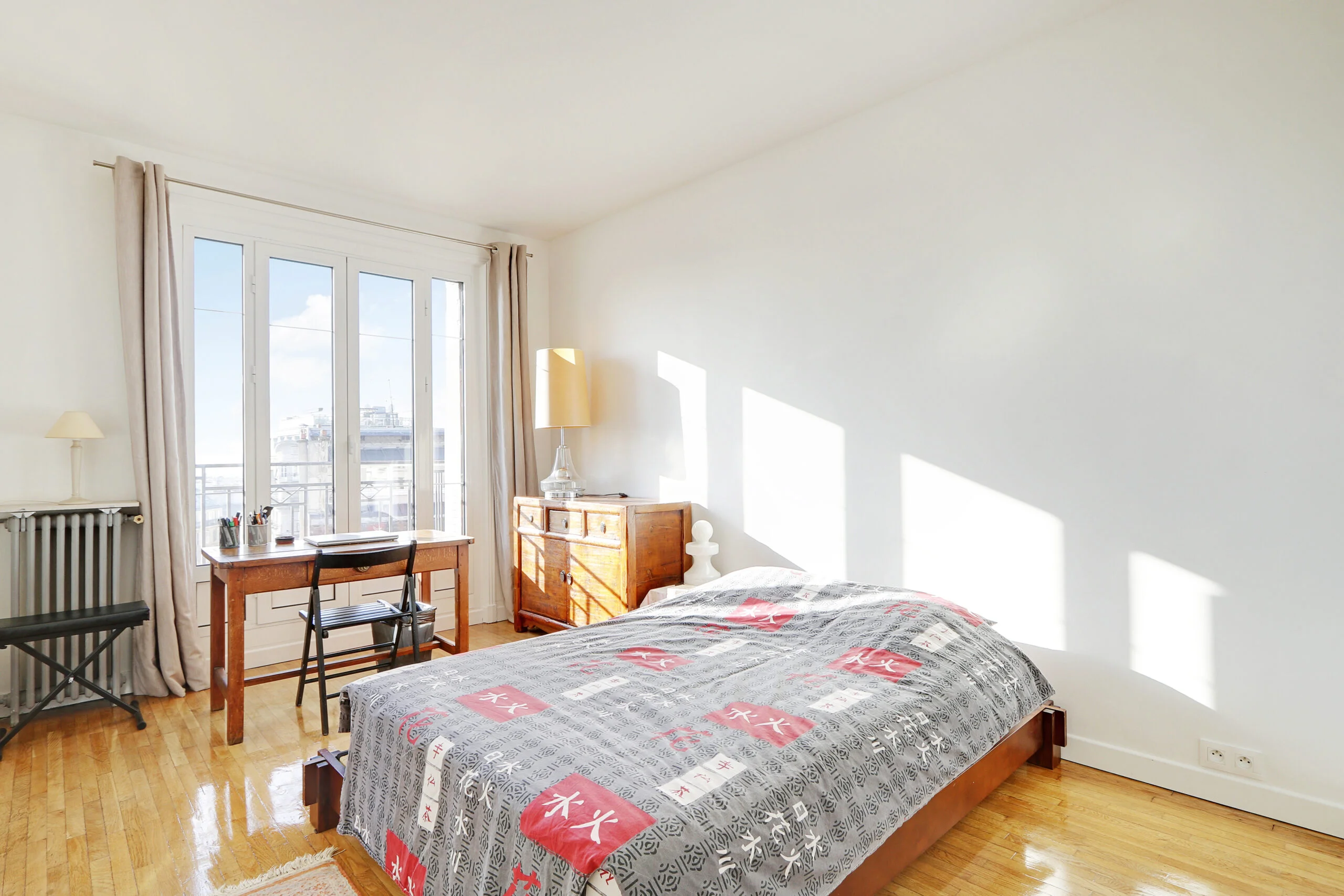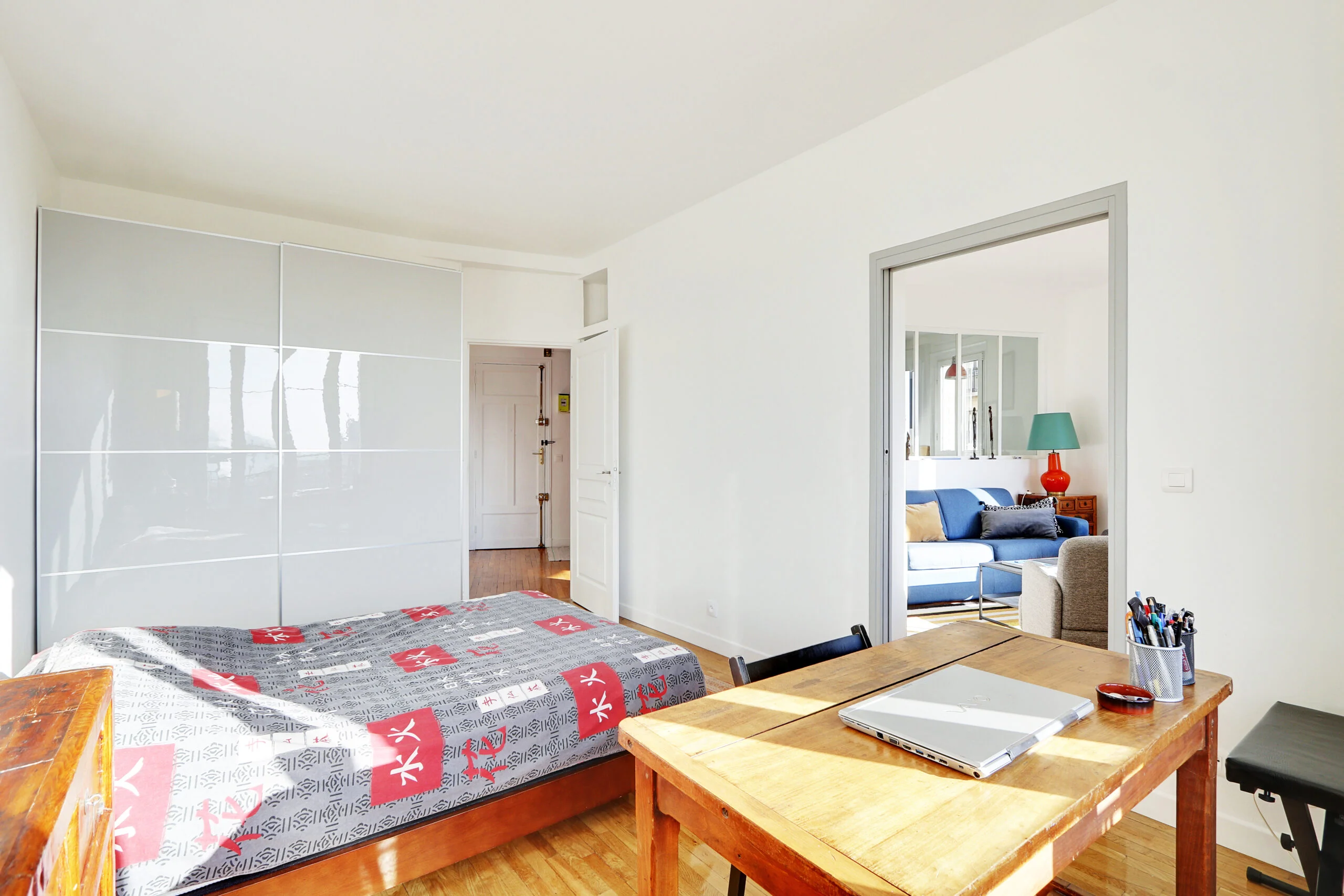 In addition to a full-sized wardrobe, there is a chest of drawers and a desk in the bedroom. Although not shown in the photos, there are also two bedside tables. If you look out of the bedroom window, you will be able to see the Eiffel Tower. The bedroom can be accessed from the entryway or from the living room where there is a sliding door.