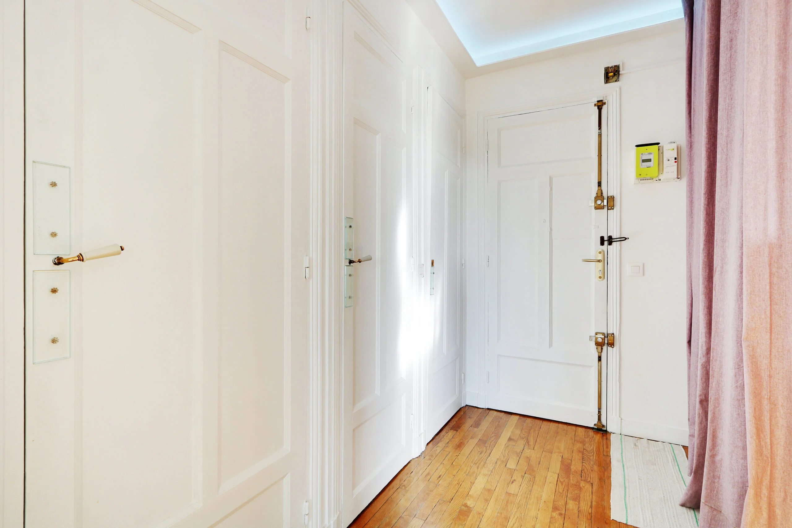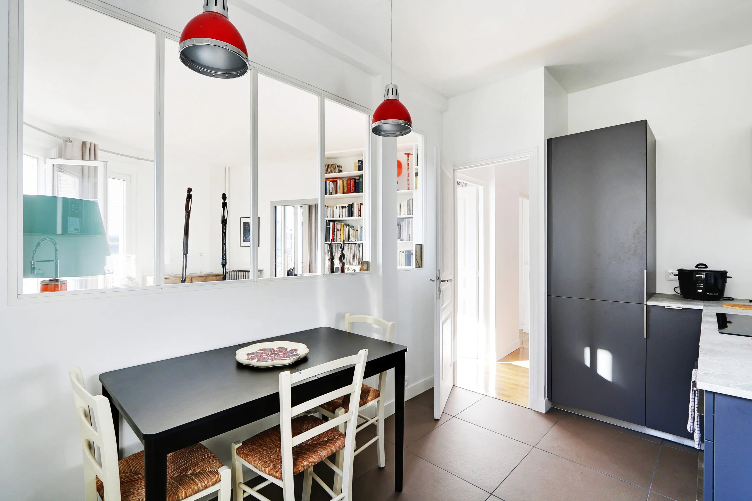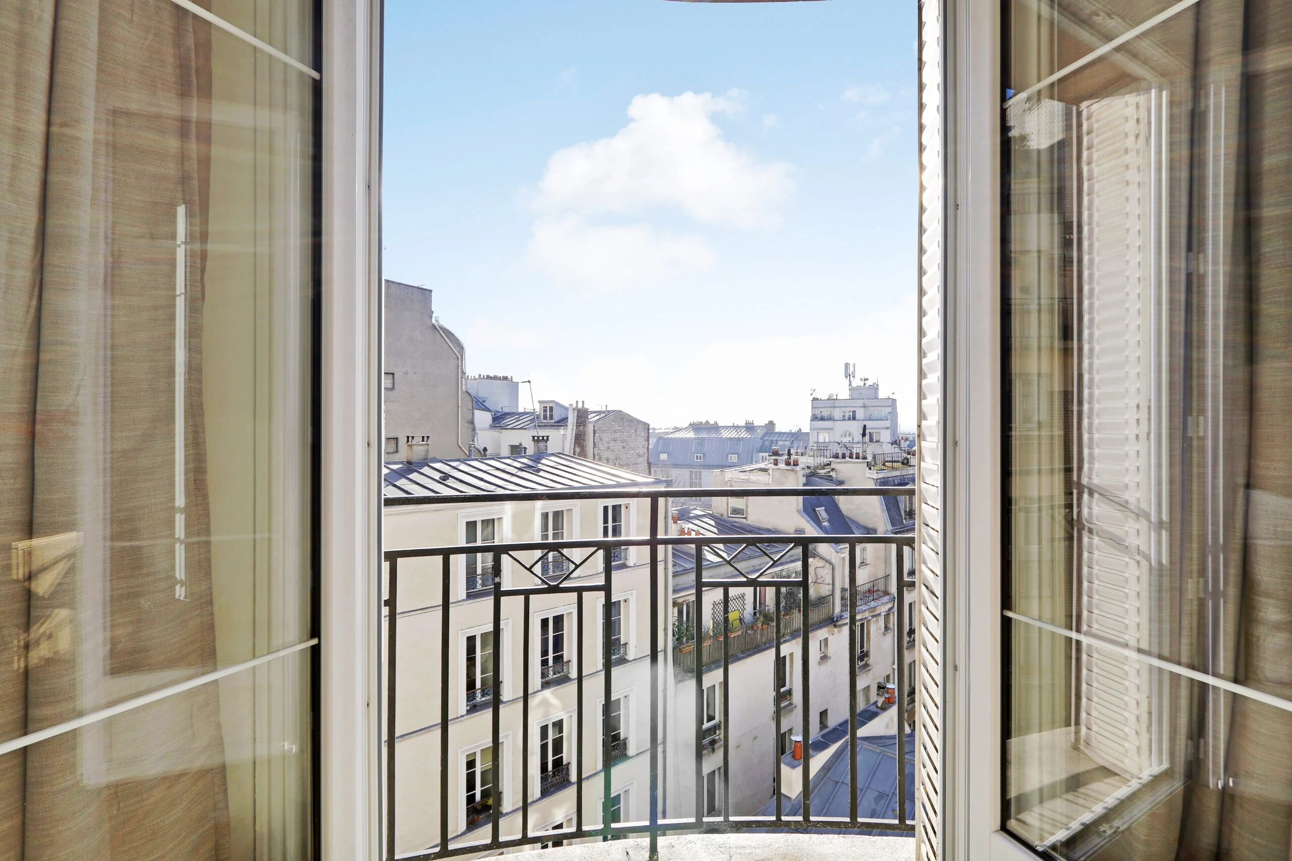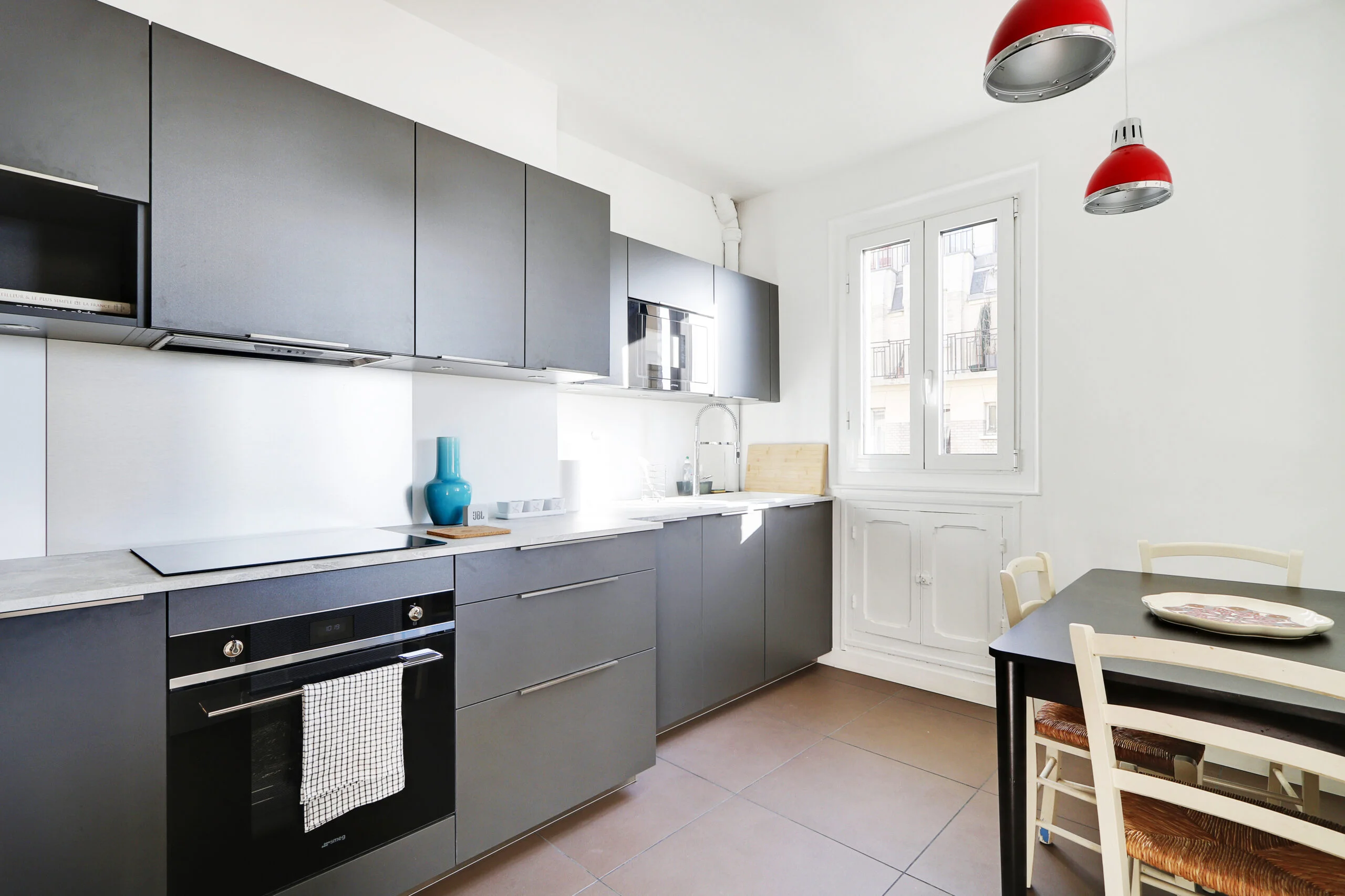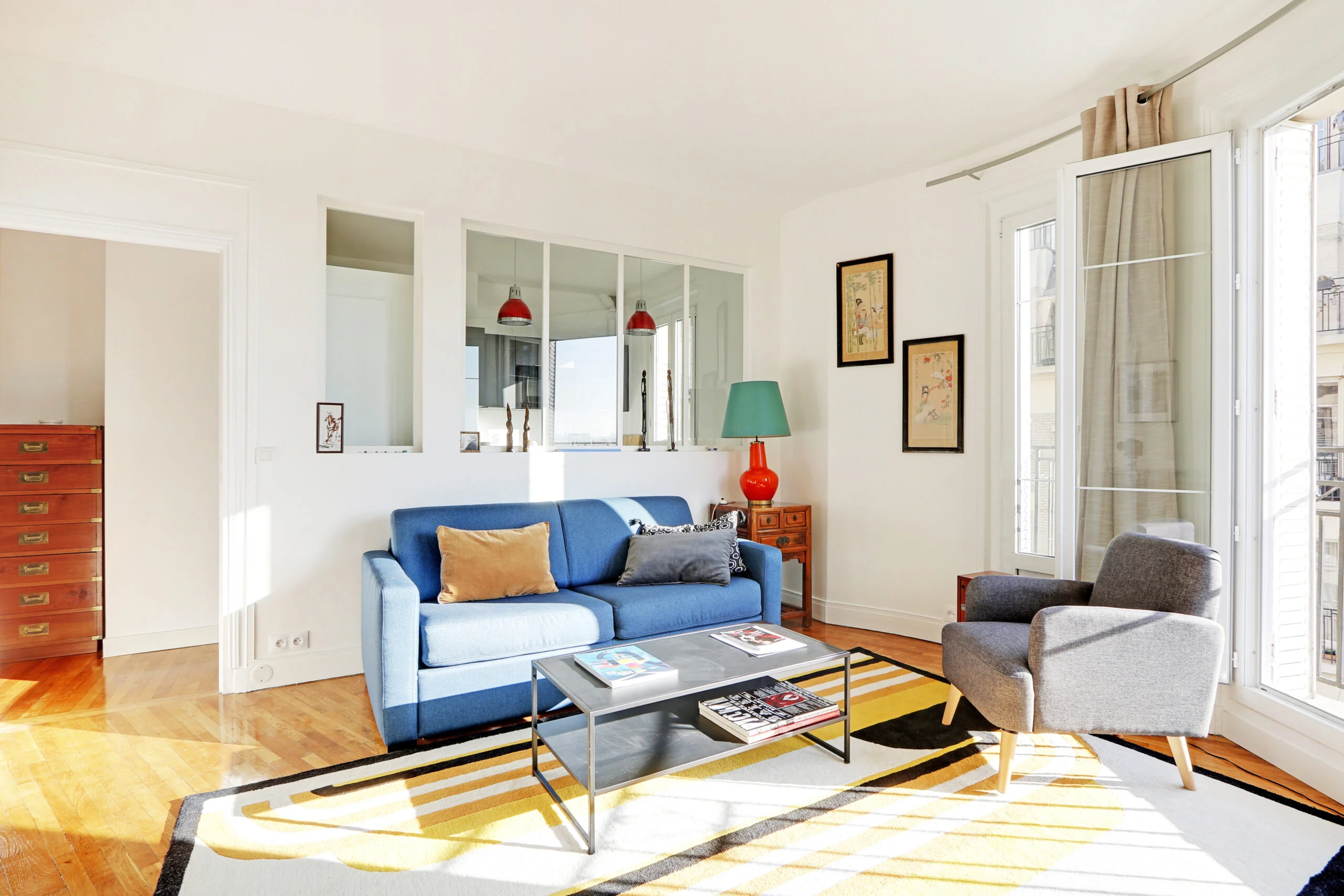 In addition to a full-sized wardrobe, there is a chest of drawers and a desk in the bedroom. Although not shown in the photos, there are also two bedside tables. If you look out of the bedroom window, you will be able to see the Eiffel Tower. The bedroom can be accessed from the entryway or from the living room where there is a sliding door.