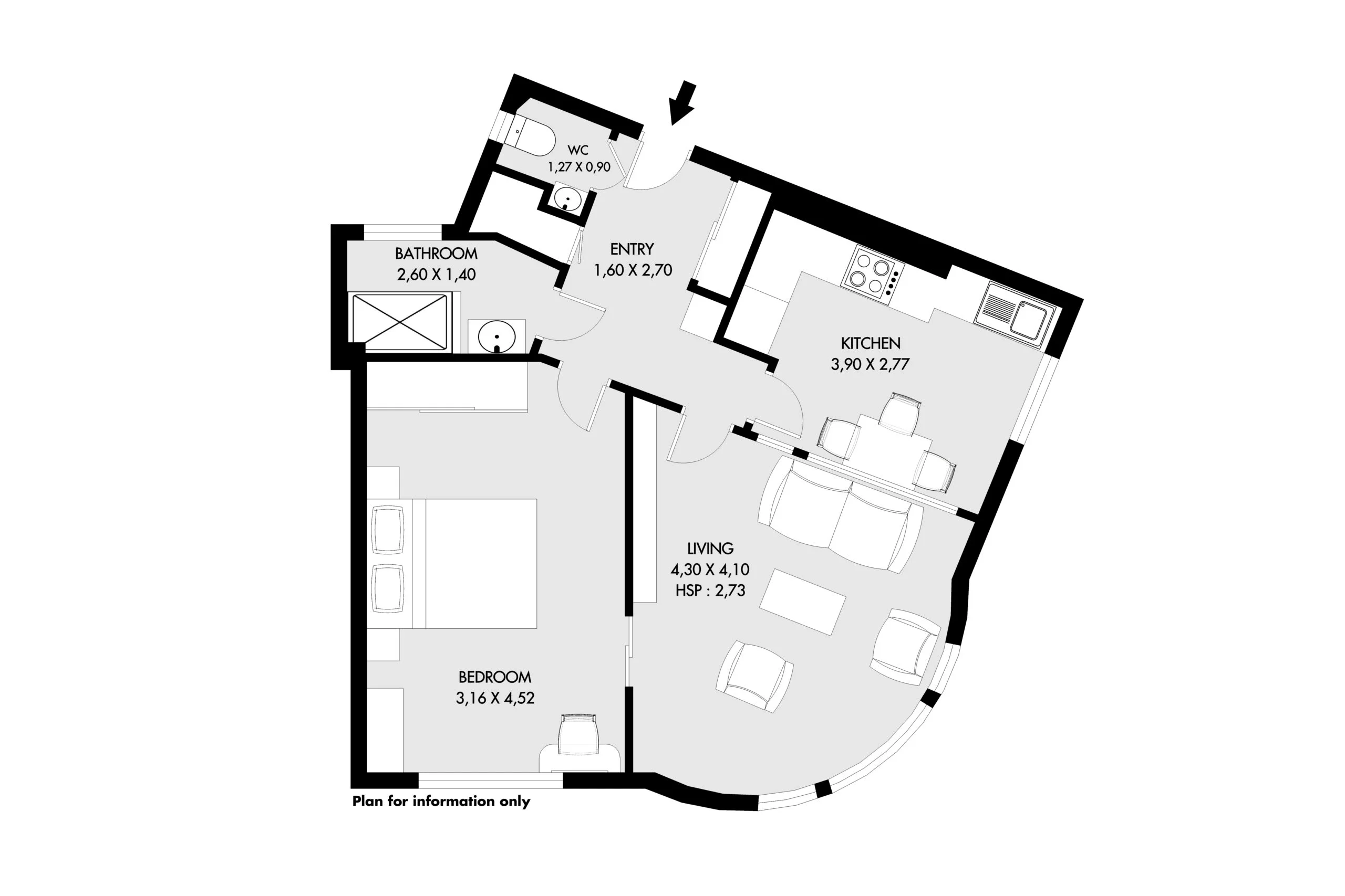 The bedroom is directly in front of you followed by the living room and then, the kitchen.