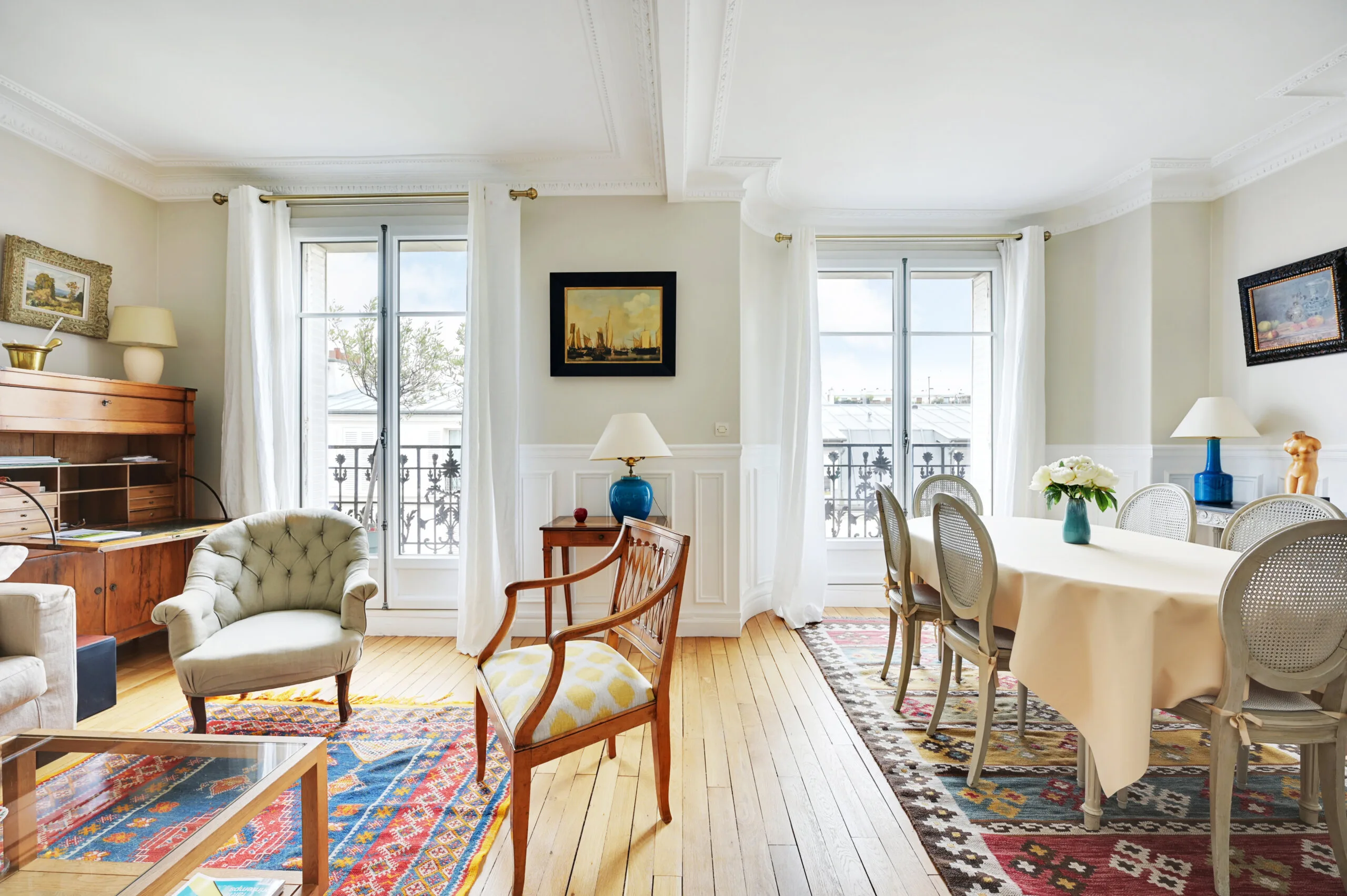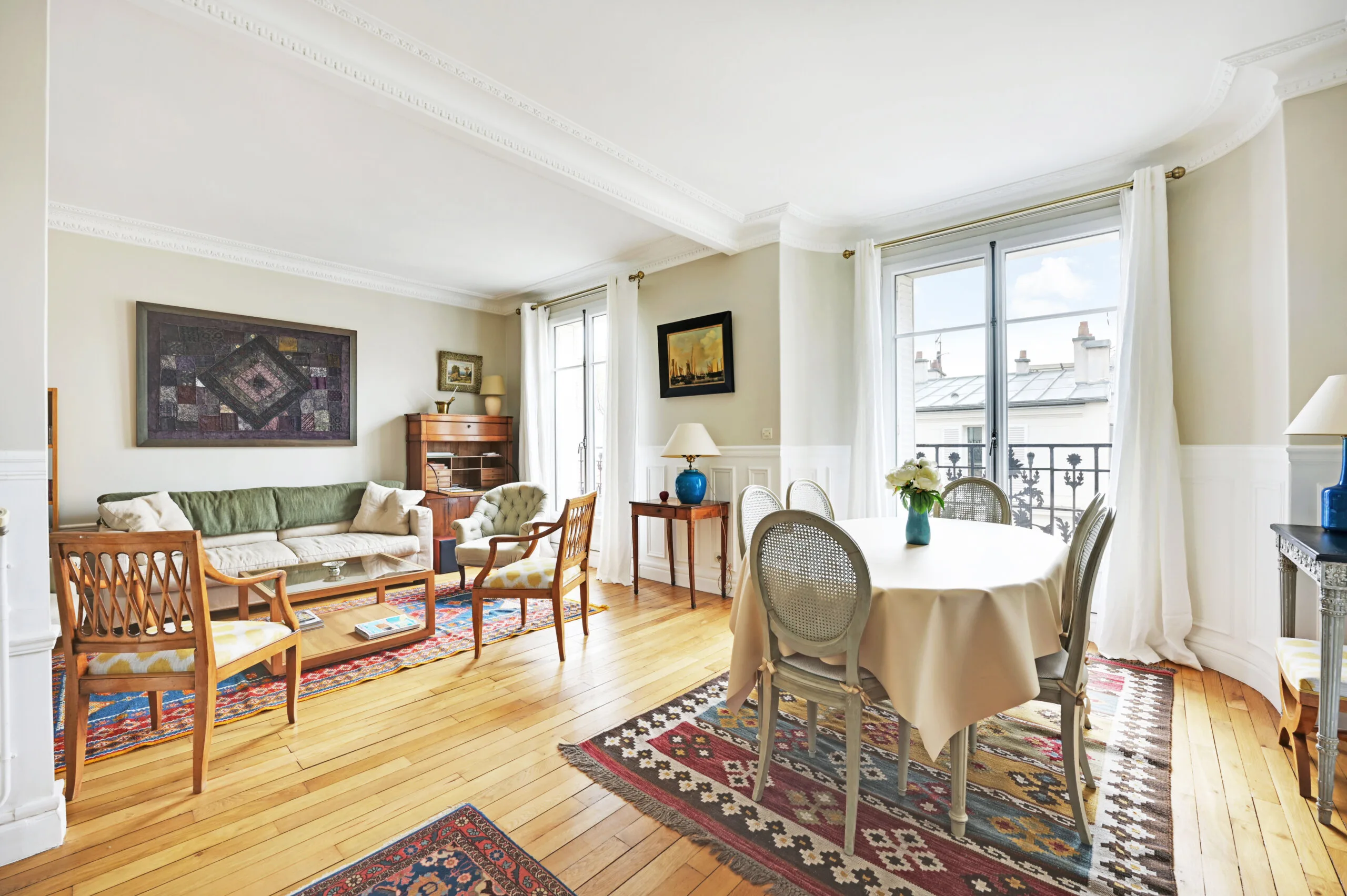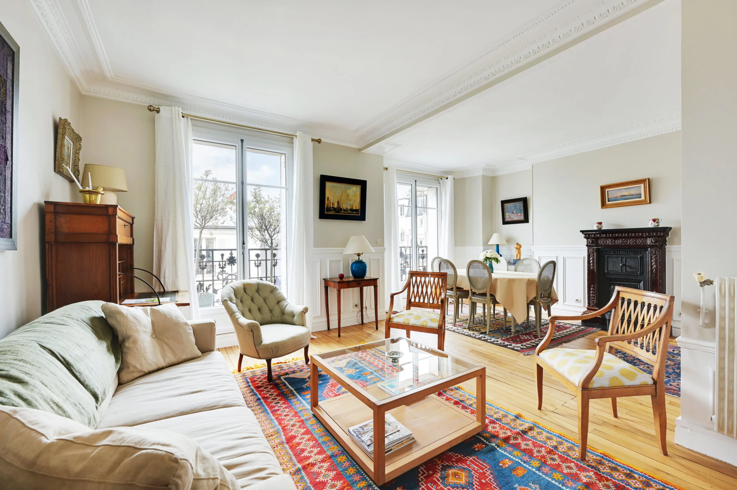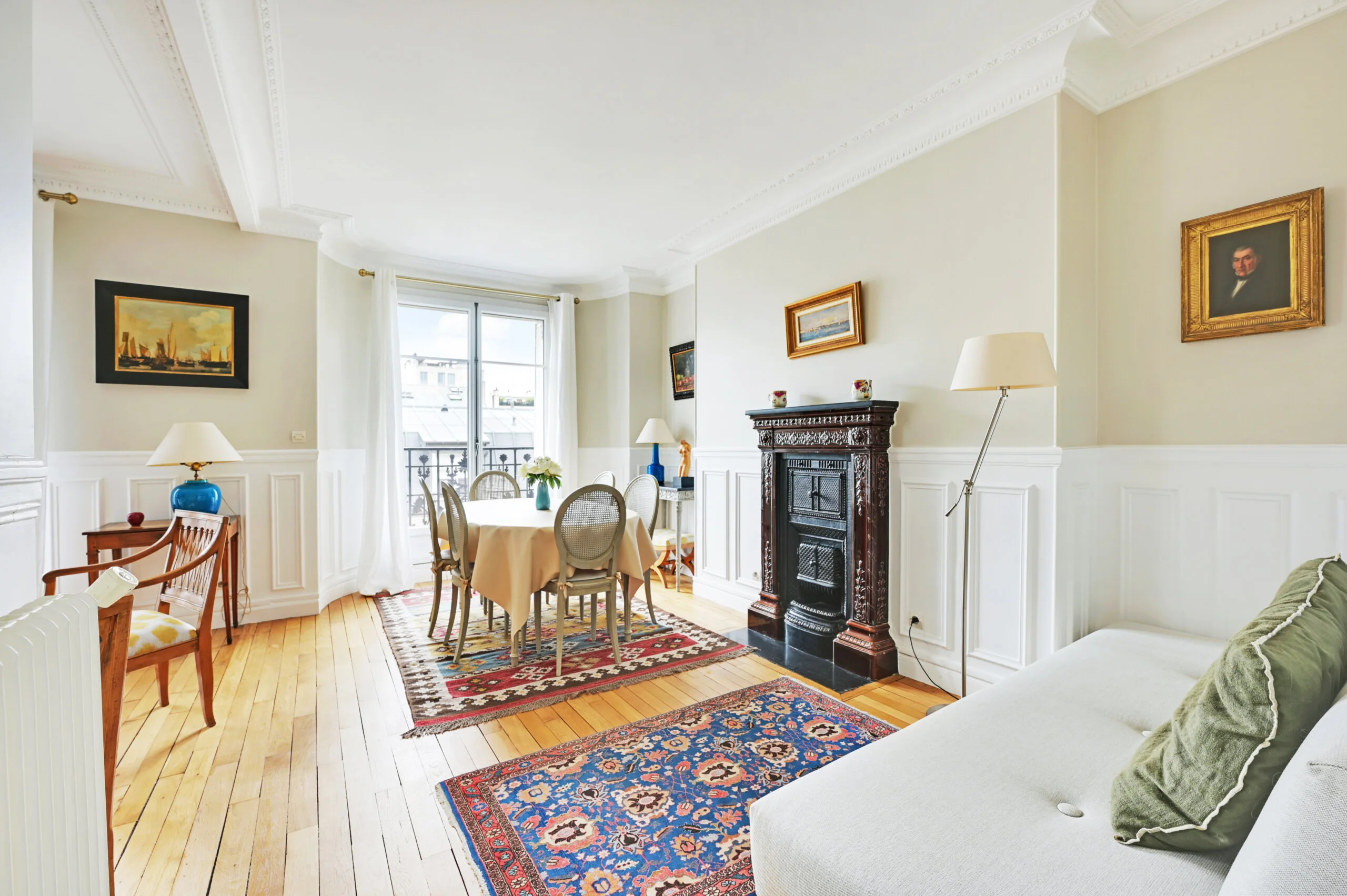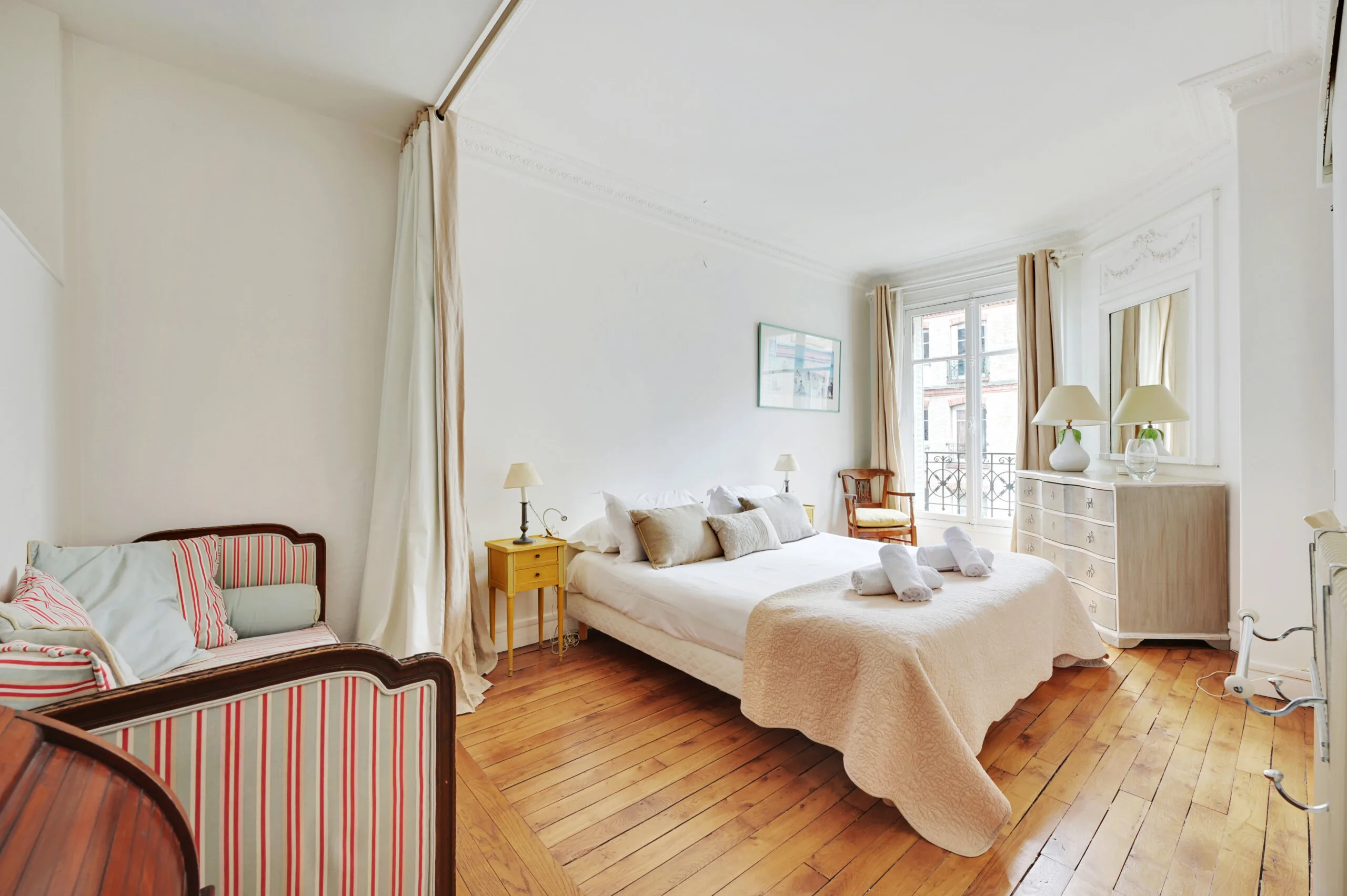 This Paris holiday home is in a traditional, French building that has kept its original features. The owners have decorated it with classic furnishings along with modern touches. When entering this vacation apartment, there is a foyer with direct access to the dining room and living area. There is a balcony off the living area, and an antique secretary by the window should you need to work during your stay. This dining room has a trundle bed, should you need a second sleeping space. The table comfortably seats six people